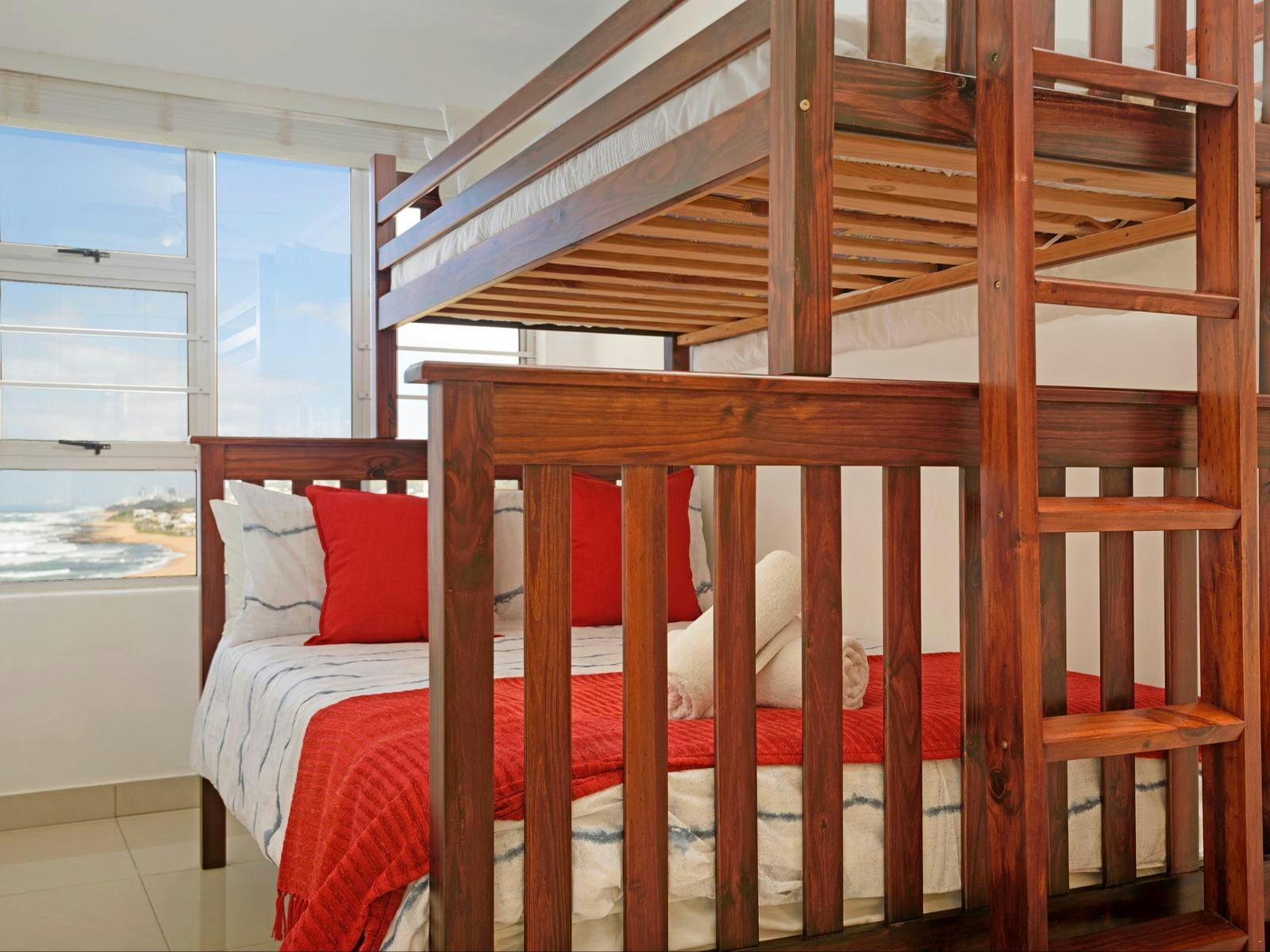 This living space leads onto an expansive, semi-covered balcony with a gas braai, and outdoor dining and patio furniture. Guests admire glorious views of the coast and enjoy the luxury of enjoying their alfresco meals to the sounds of the waves breaking in the background. Guests can sunbathe on the balcony, counting the many ships en route to Durban harbour.