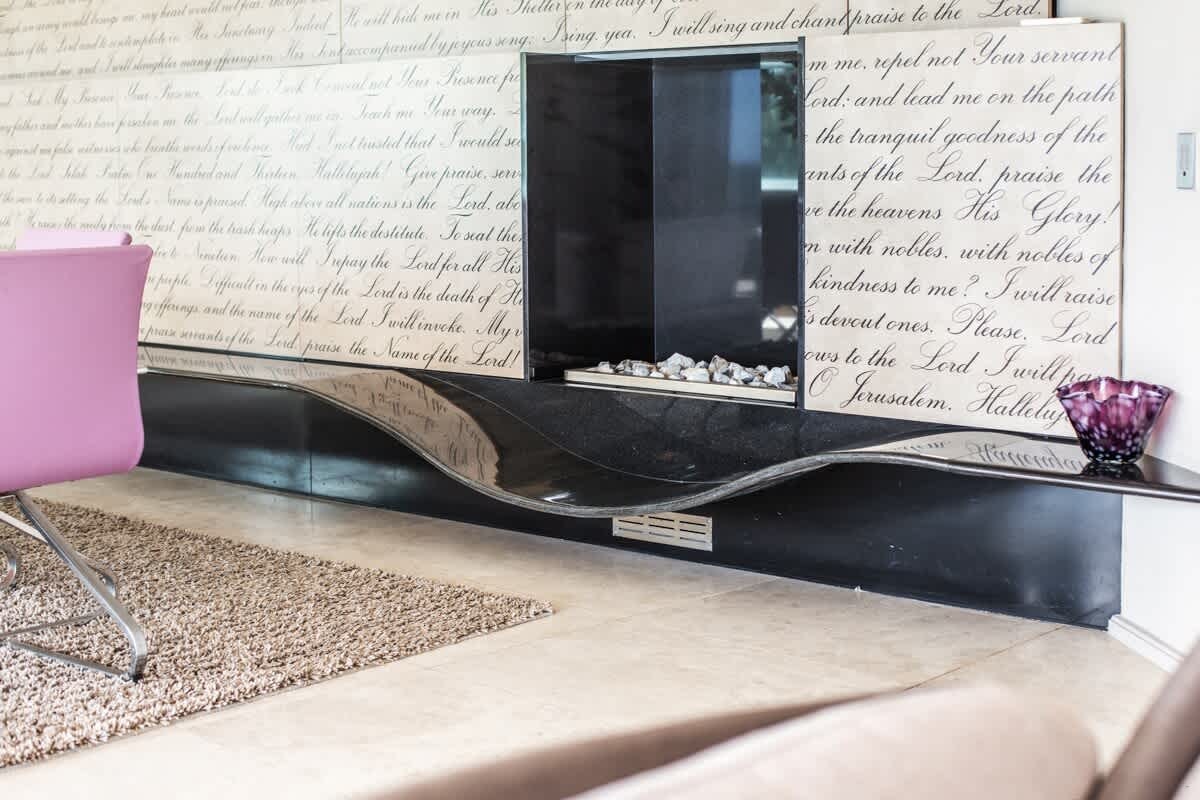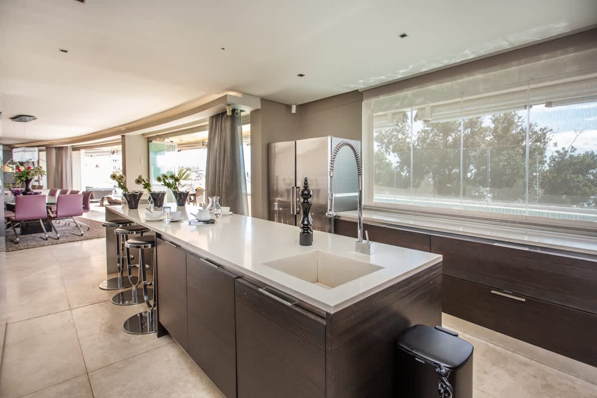 The open-plan living area includes a modern kitchen equipped with a fridge-freezer, gas stove, oven, microwave, air fryer, ice maker, cutlery and crockery, and tea- and coffee-making facilities, as well as a central breakfast bar with stools. The separate scullery offers a washing machine, tumble dryer, and dishwasher for added convenience. Adjacent to the kitchen, the elegant dining area features a 12-seater dining table and a fireplace, ideal for shared meals. The comfortably furnished lounge includes a wall-mounted smart TV with streaming services and breathtaking ocean views, while a separate media room with plush seating offers the perfect space to unwind after a day of exploring. Wi-Fi access is available throughout the villa, and a private study is also included for guests’ convenience.