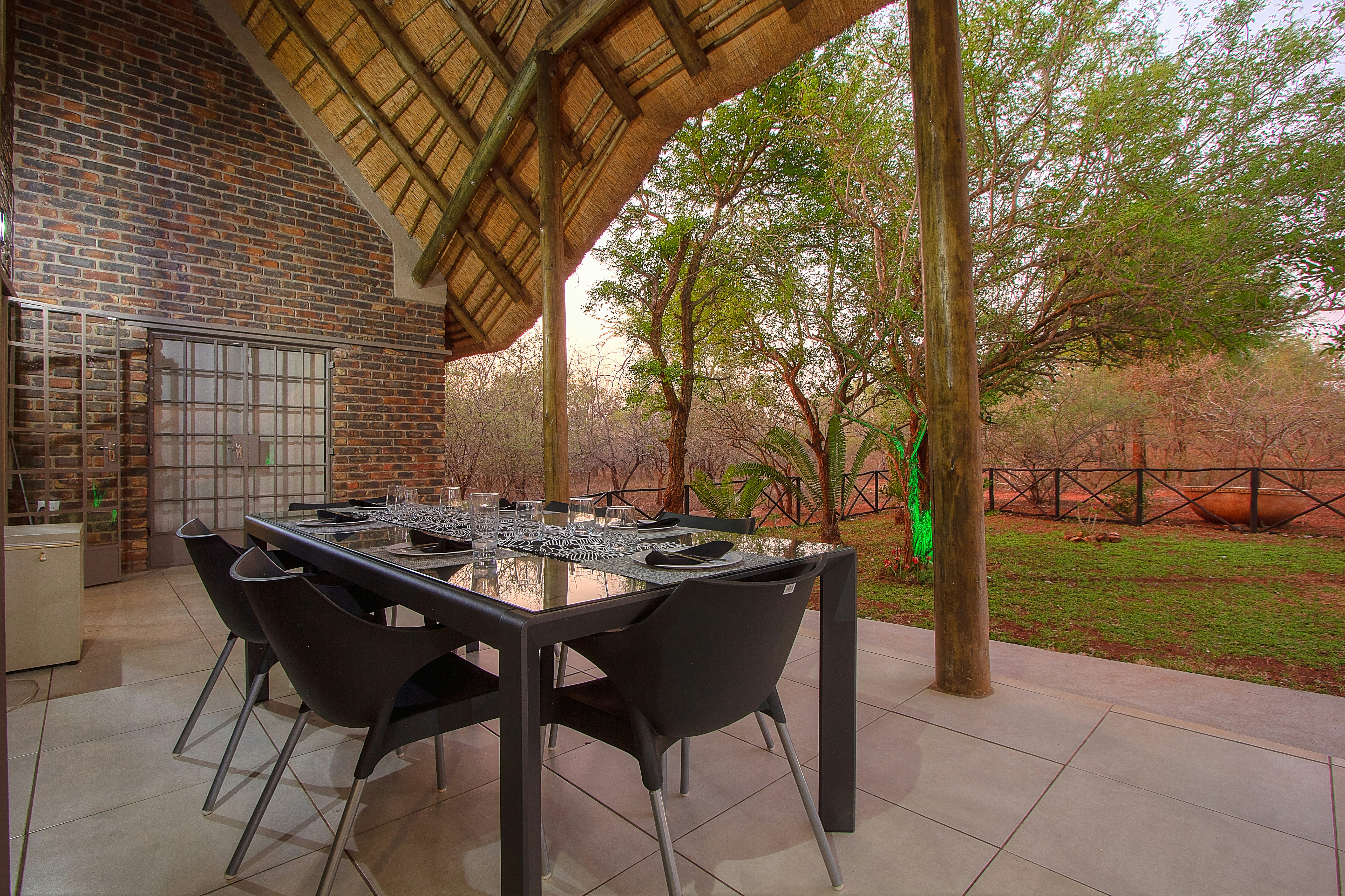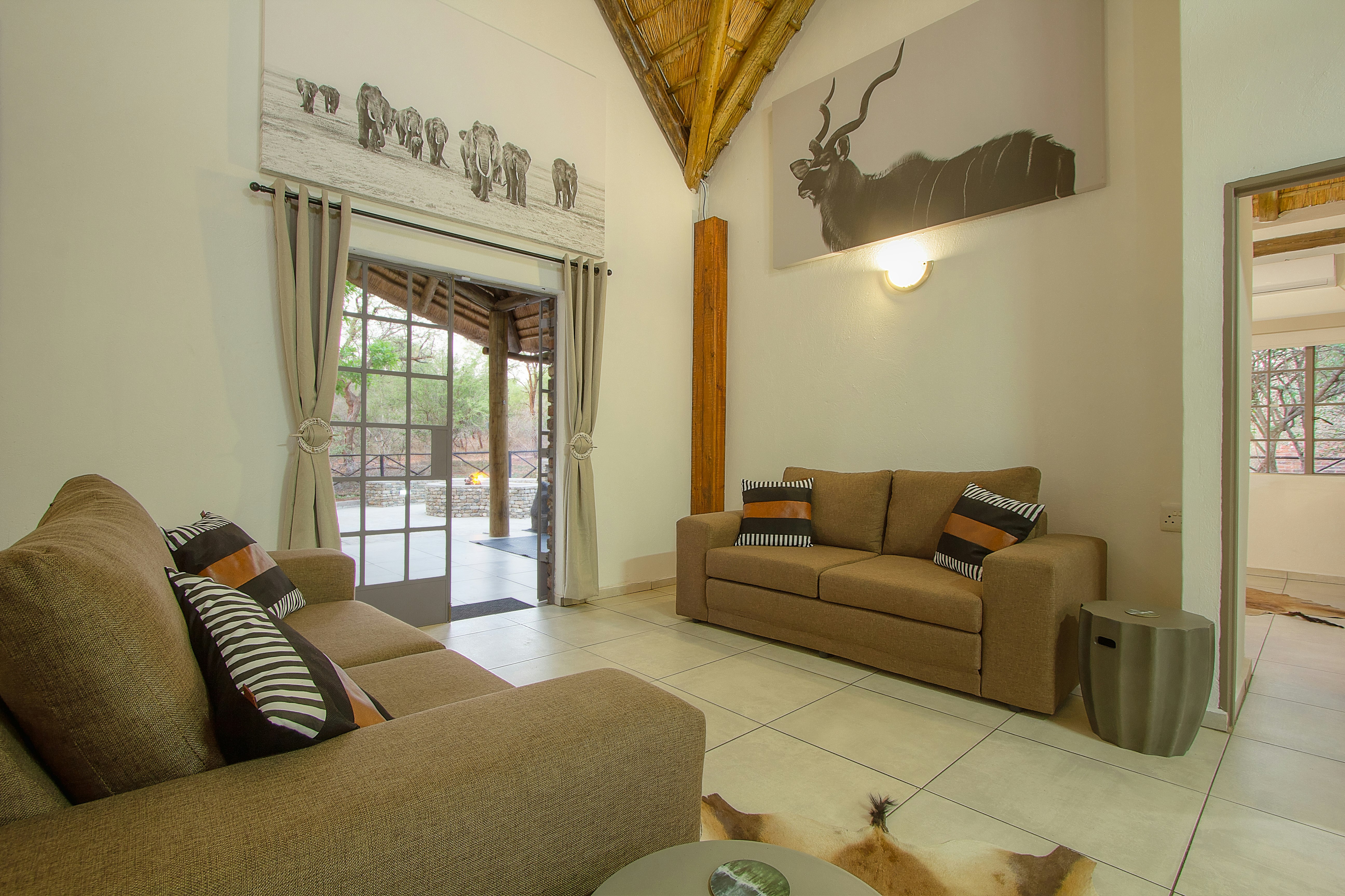 Die kombuis is met 'n yskas-vrieskas, stoof, oond, basiese eetgerei en breekware, en tee- en koffiemaakgeriewe toegerus. Die leefarea het gemaklike sitplek en lei na die stoep waar wild soms wei, soos sebras, koedoes, vlakvarke en rooibokke. Die stoep het buitemeubels en 'n boma met 'n uitsig oor die plonspoel. DIt is die ideale plek om 'n onvergeetlike Afrika-sonsondergang te ervaar.