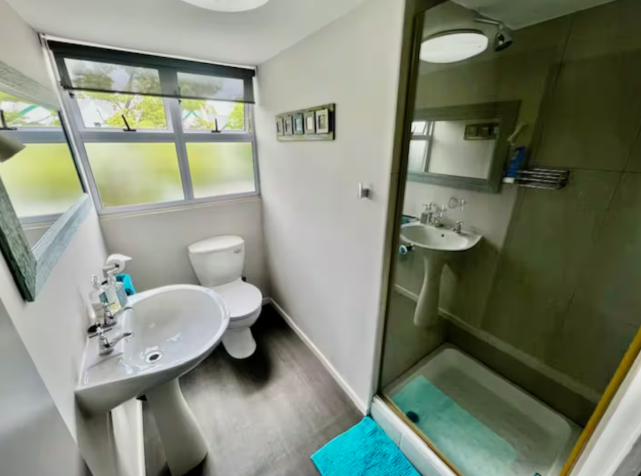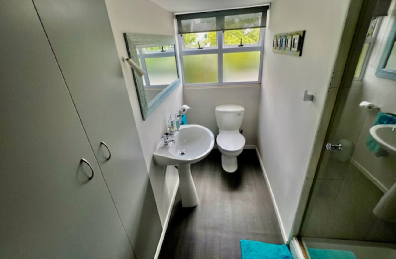 This house can accommodate six guests and comprises three bedrooms and two bathrooms. The main bedroom is furnished with a queen-size bed. The second bedroom contains a double bed, and the third bedroom is furnished with two single beds. Guests share two bathrooms, both fitted with a shower, washbasin, and toilet—one of which also includes a bath. Additionally, there is a guest bathroom equipped with a washbasin and toilet.