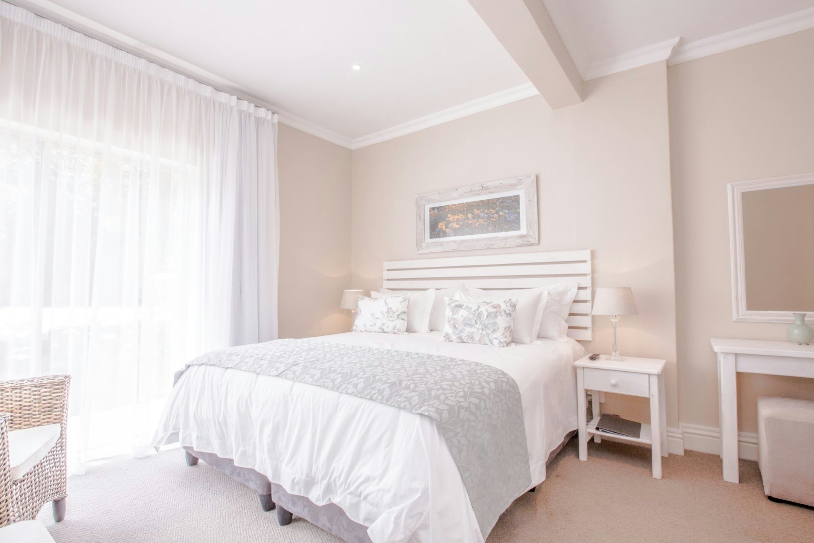 The Mountain View room is furnished with a queen-size bed and an en-suite shower, while the Garden View room contains a king-size bed and the bathroom is fitted with a bath and a shower. Bath towels and crisp white linen are provided. Other in-room amenities include a TV, free Wi-Fi, a bar fridge, a safe as well as tea- and coffee-making facilities.