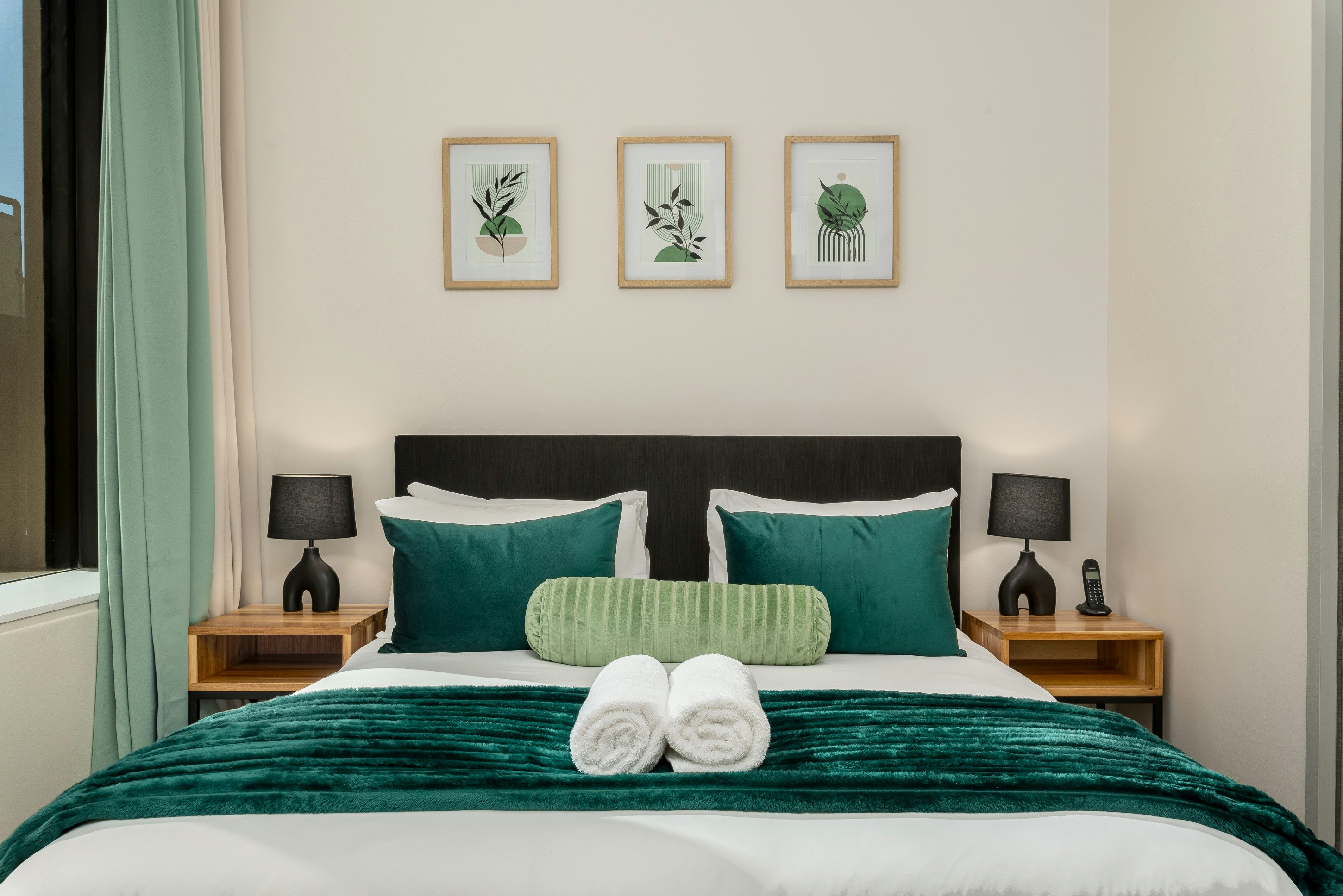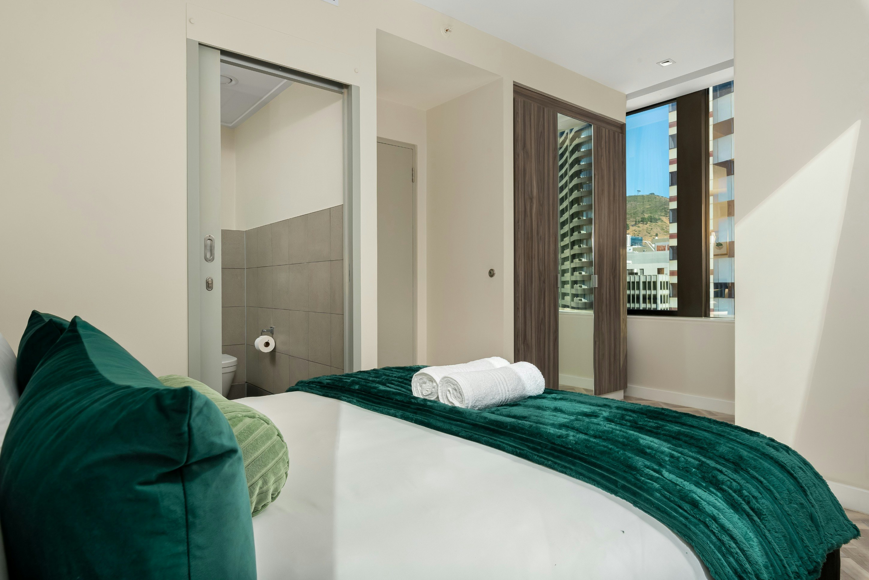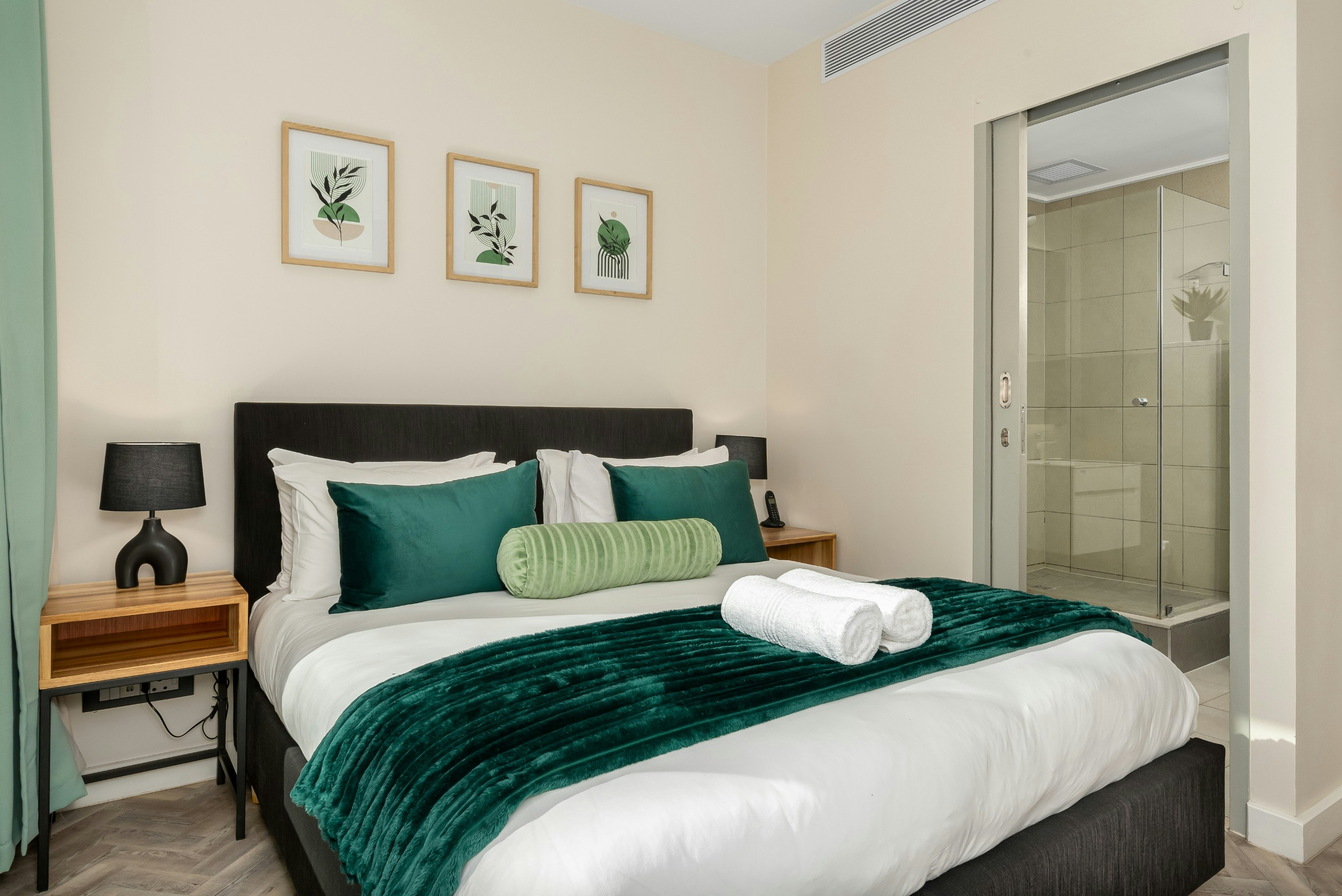 This apartment can accommodate up to 2 guests in 1 bedroom with an en-suite bathroom. The bedroom is furnished with a queen-size bed and the en-suite bathroom is fitted with a shower, washbasin and toilet. Linen and bath towels are provided.