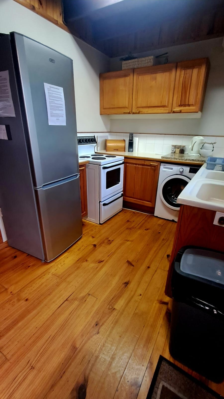 The kitchen is equipped with a fridge-freezer, stove, oven, microwave, cutlery, crockery, and tea- and coffee-making facilities. It extends to the dining area and further opens to the lounge, furnished with comfy seating and a cosy fireplace.