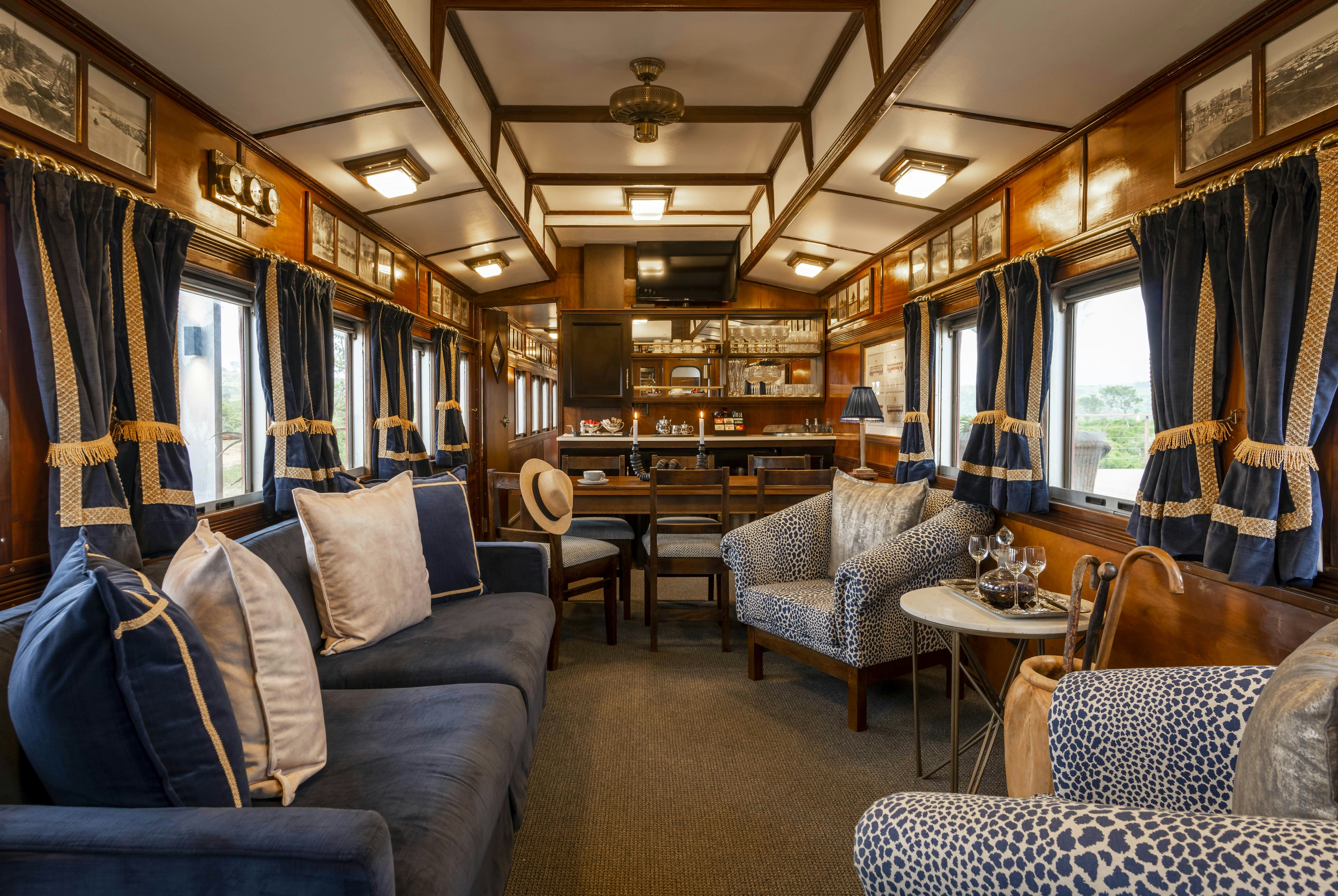 The charming carriage cabin features an expansive outdoor deck, private swimming pool, dining area, and boma.