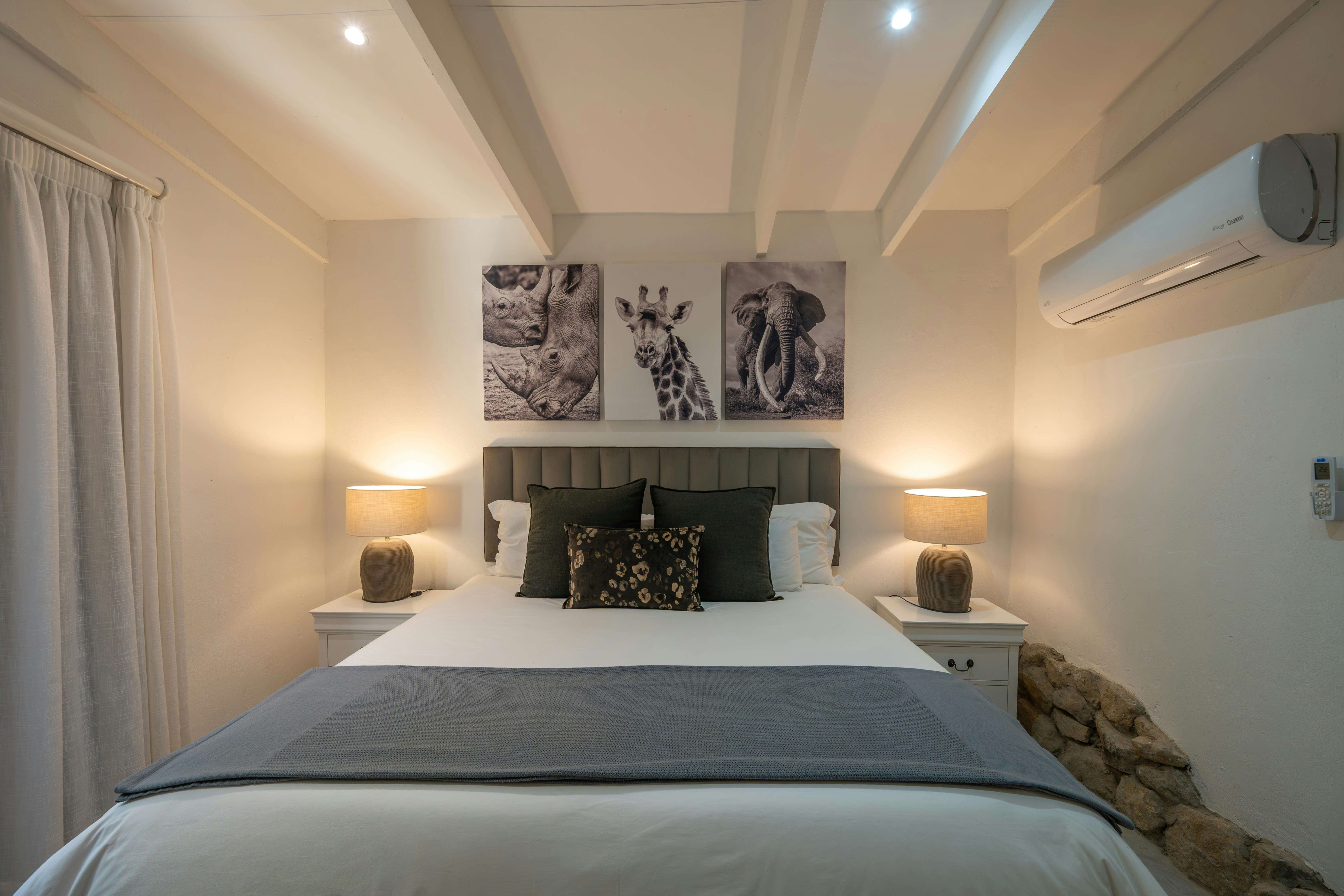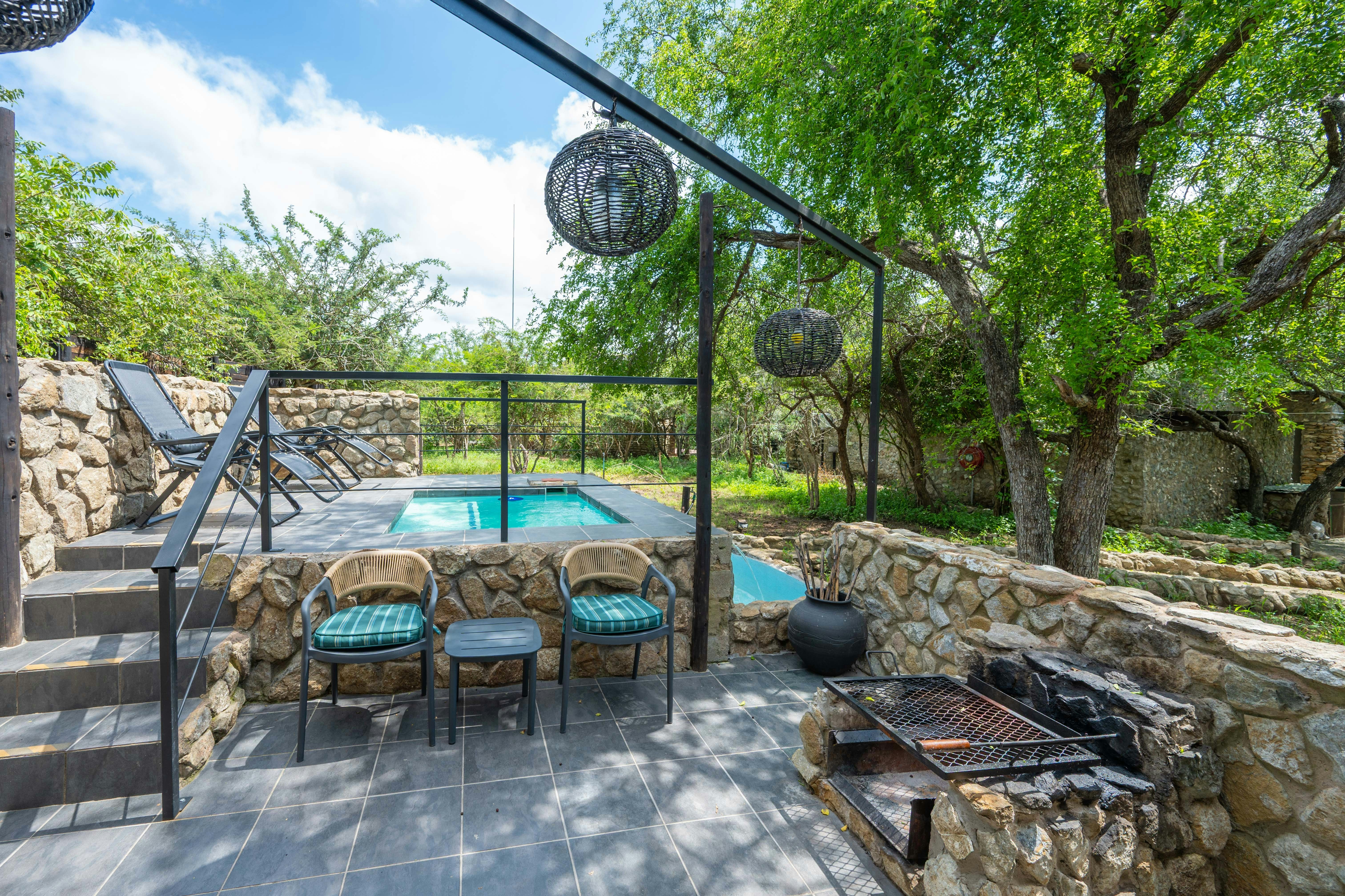 Other amenities include Wi-Fi, a TV, air conditioning, a private plunge pool, a boma, a braai area, off-the-grid solar power, borehole water, and gas for heating.