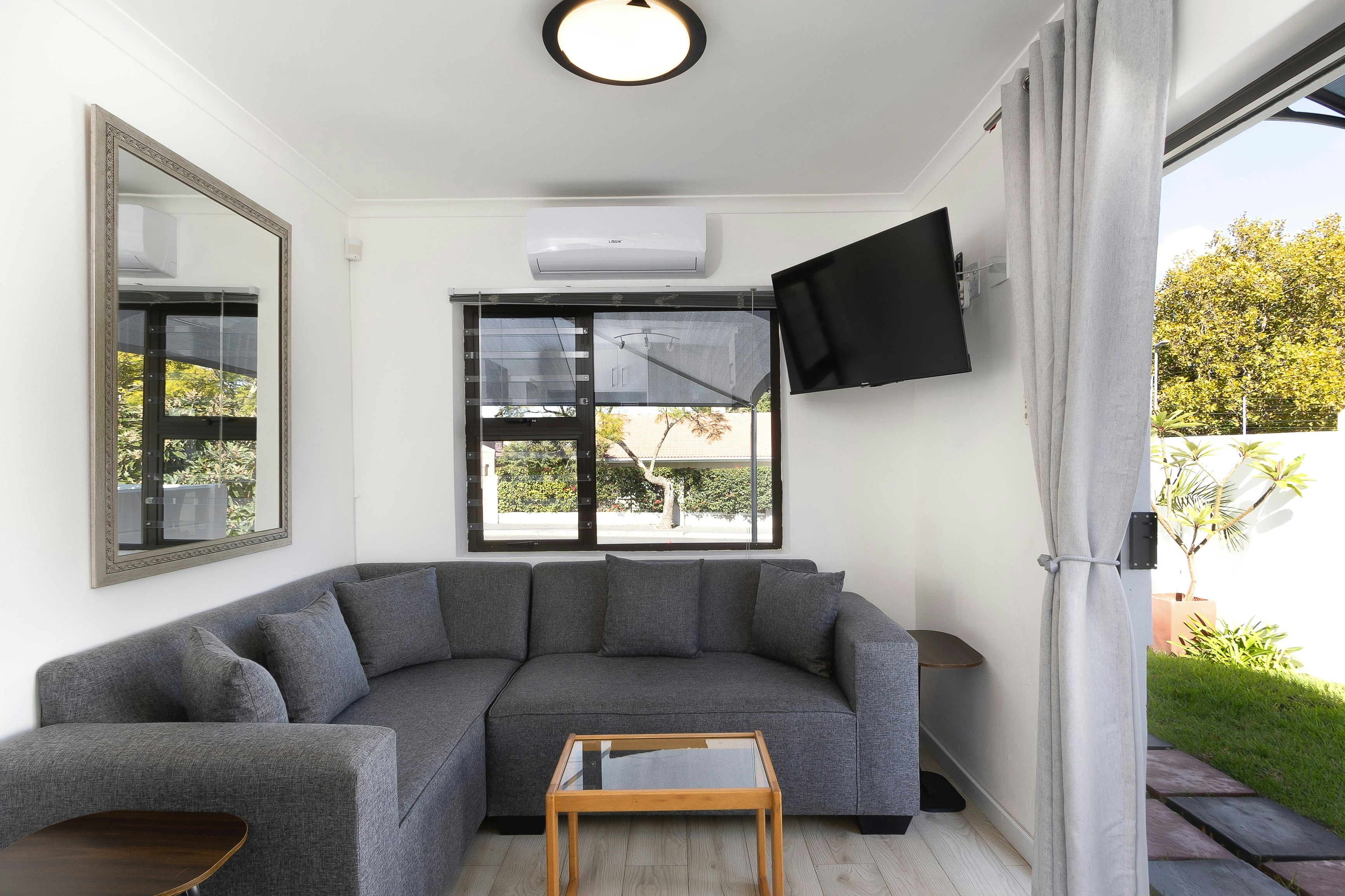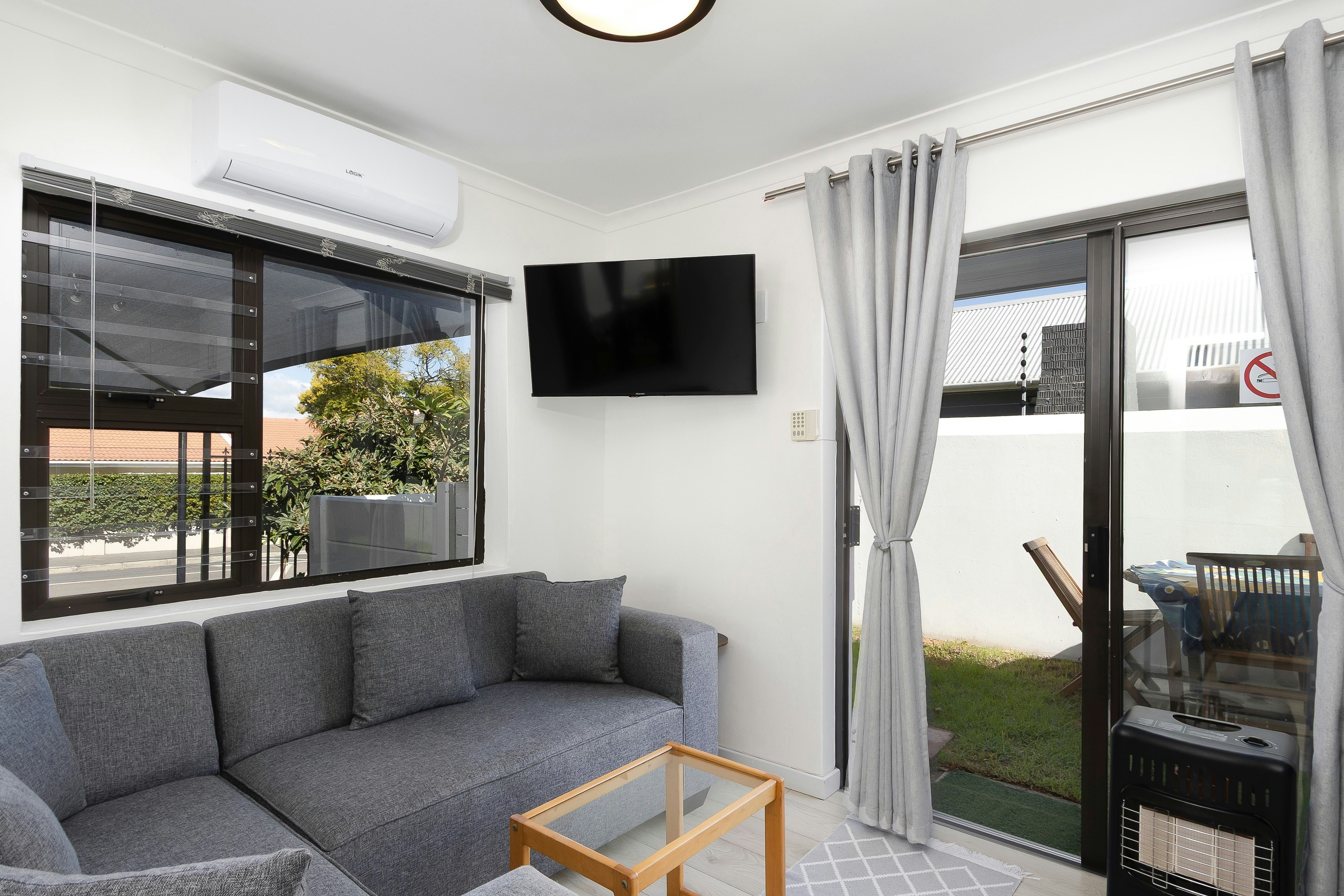 The living space features a lounge area furnished with a comfortable couch and a smart TV, while the kitchen is fully equipped with a fridge-freezer, gas stove, kettle, air fryer, microwave, and washing machine. Gas heater and airconditioner.