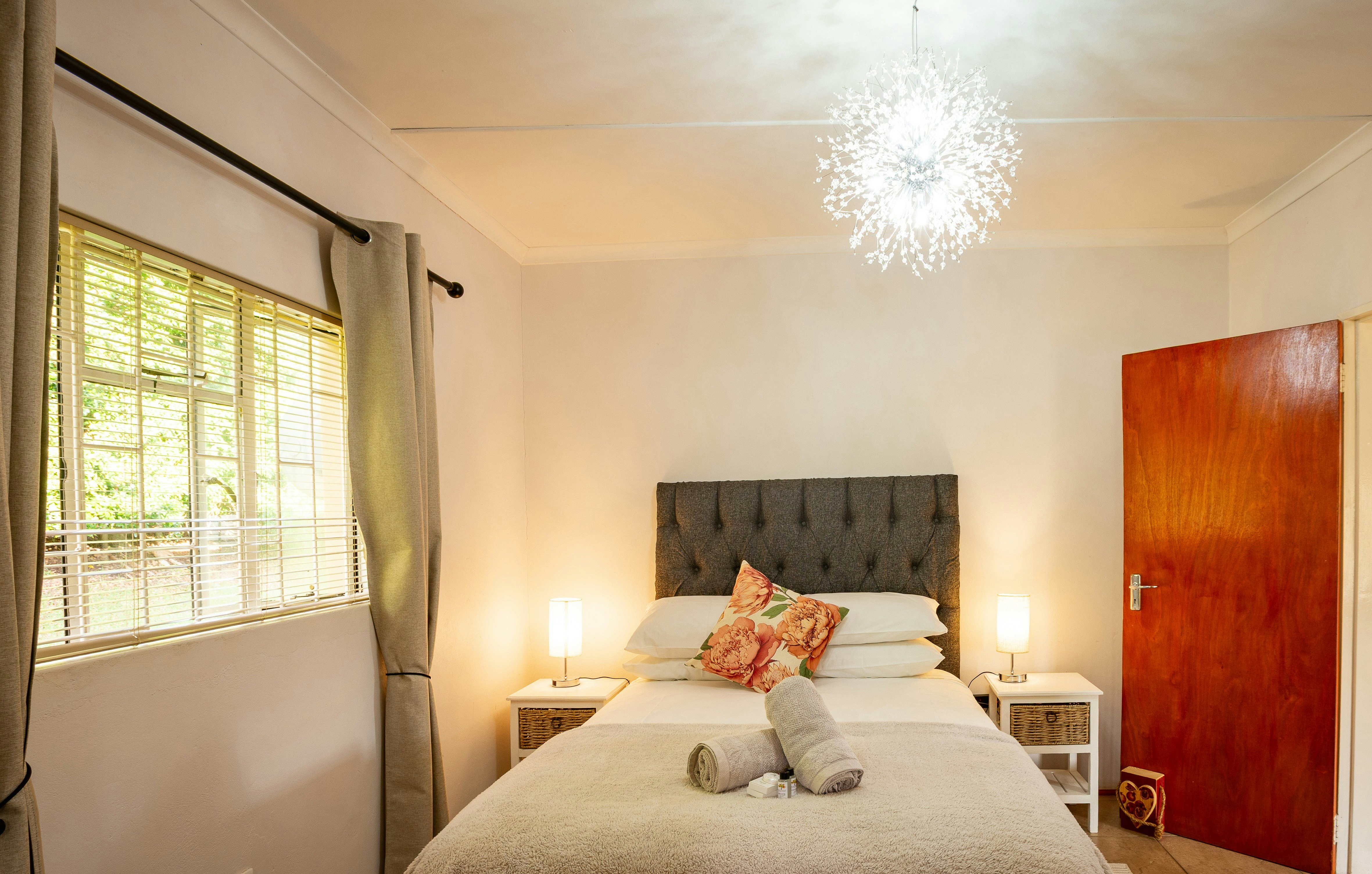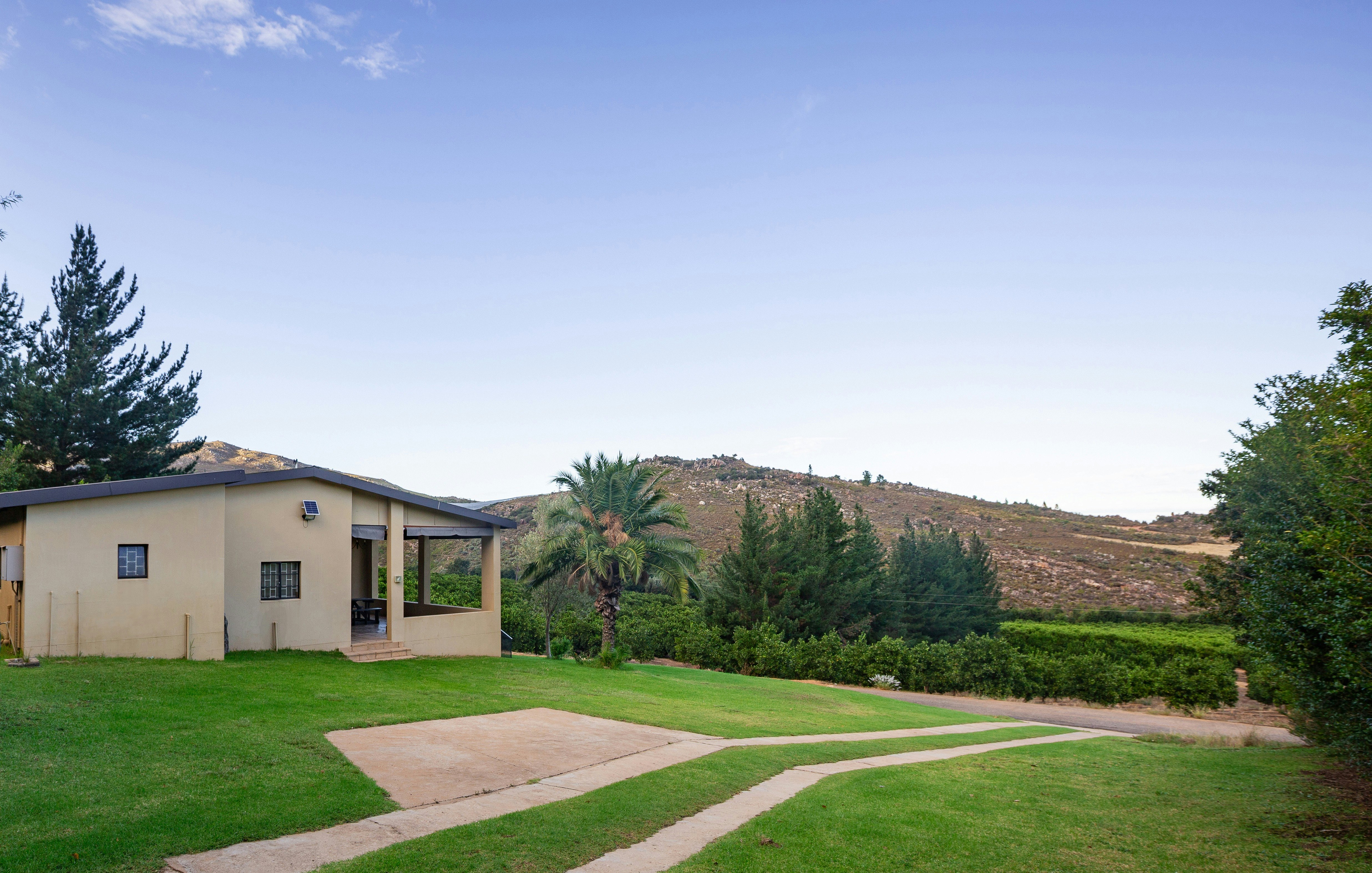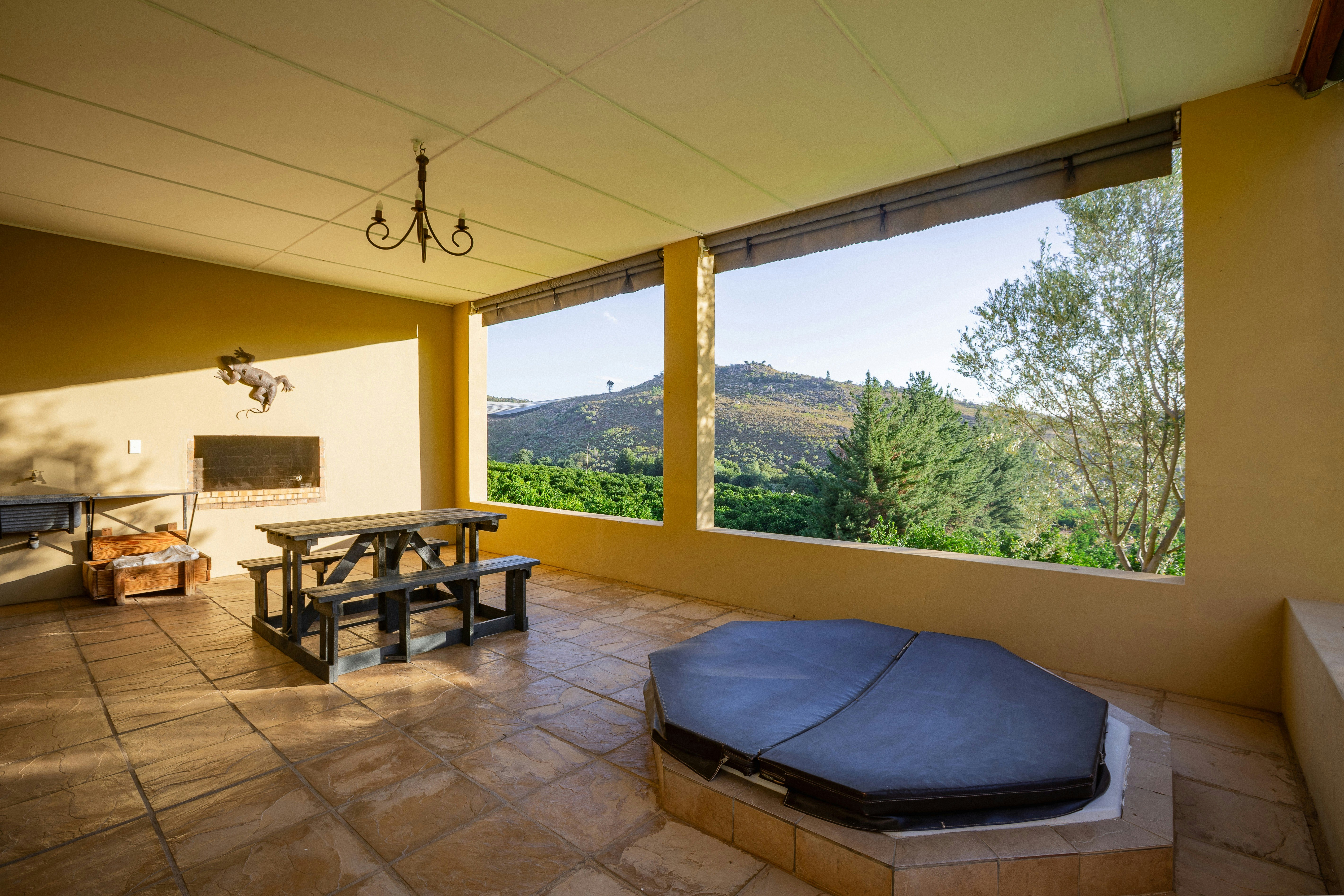 On the covered patio, guests will find outdoor dining and braai facilities, as well as a jacuzzi. The guesthouse is surrounded by mountains, orange trees and a beautiful lawn. Guests have access to a swimming pool, free Wi-Fi and secure parking.