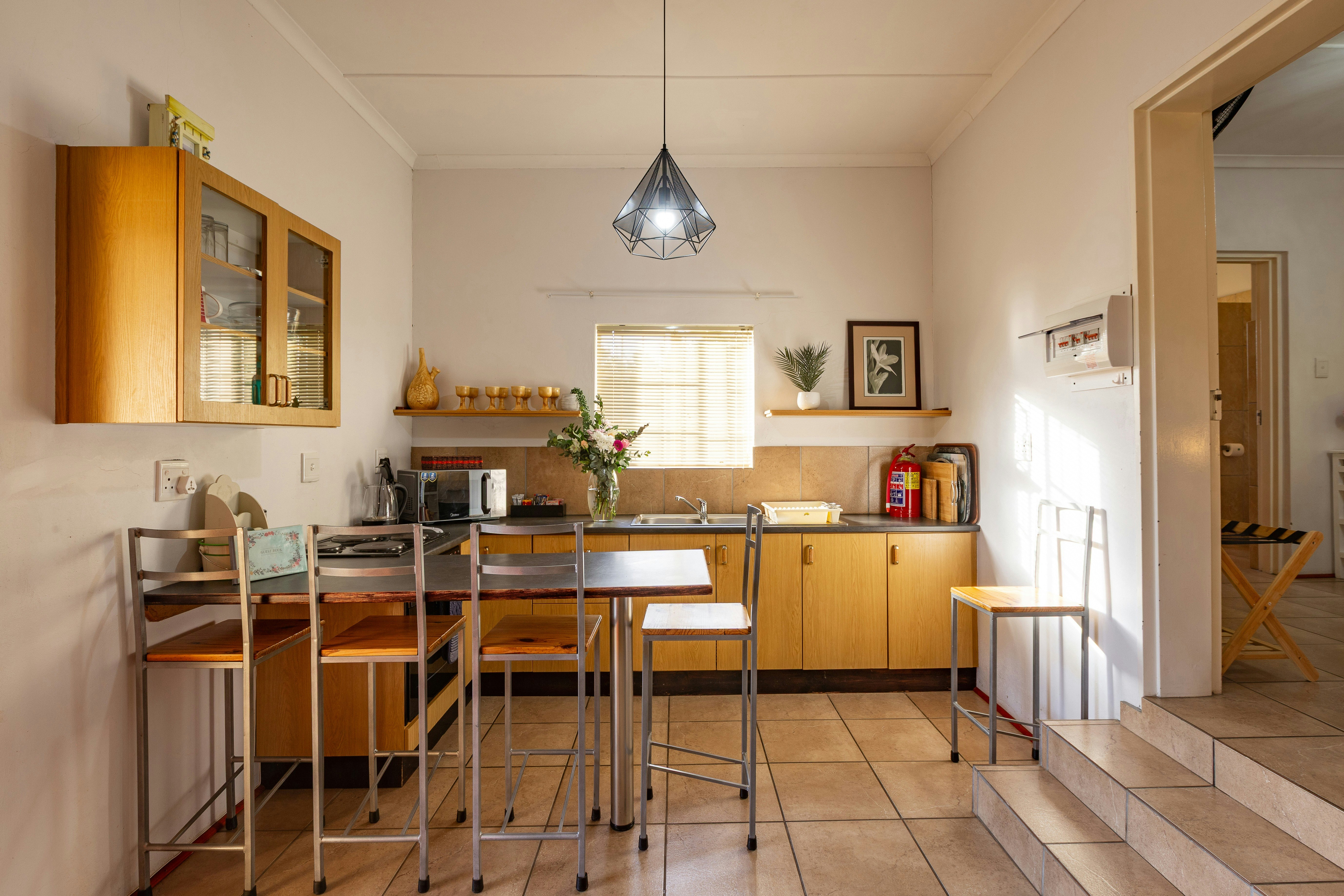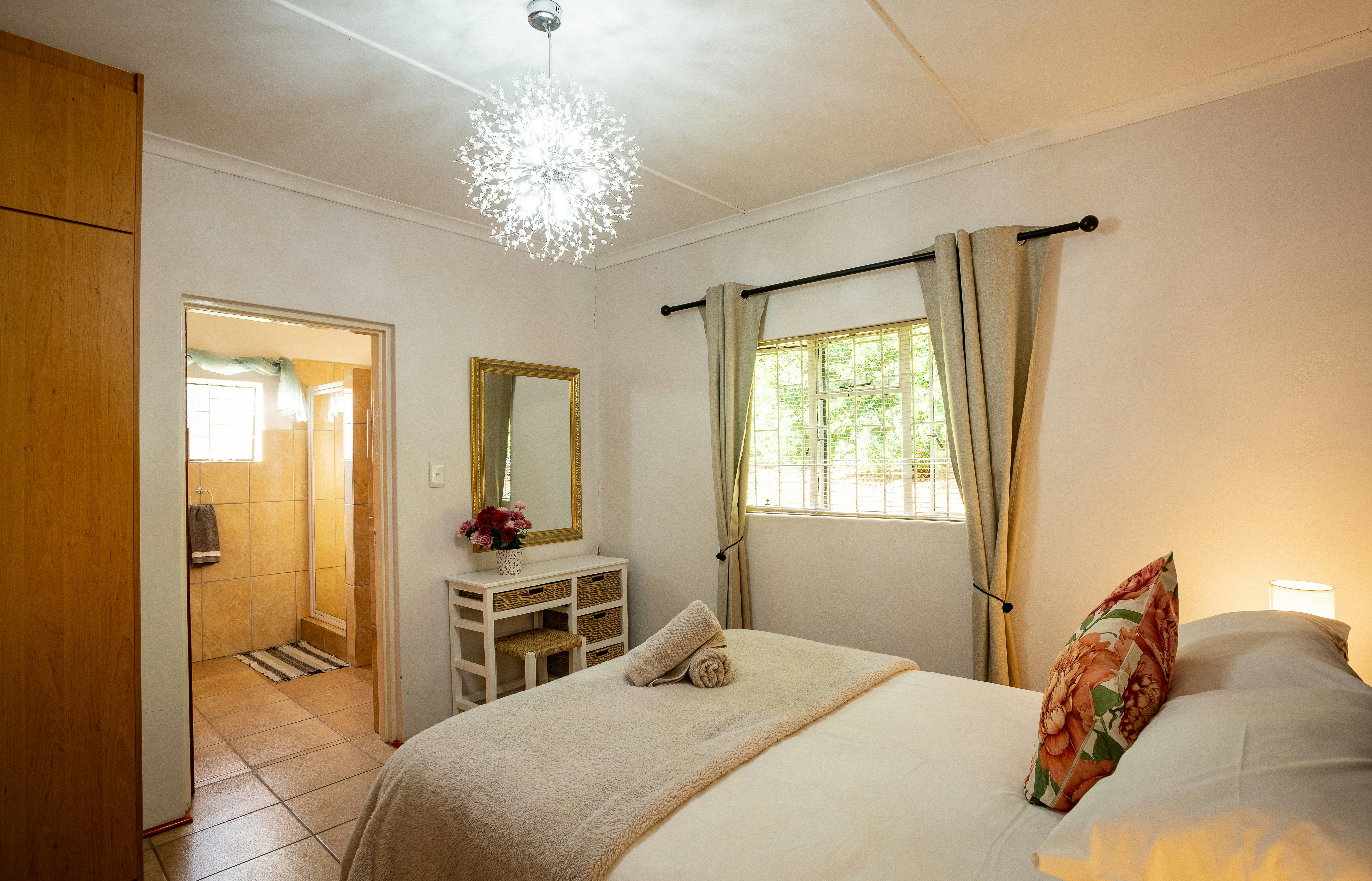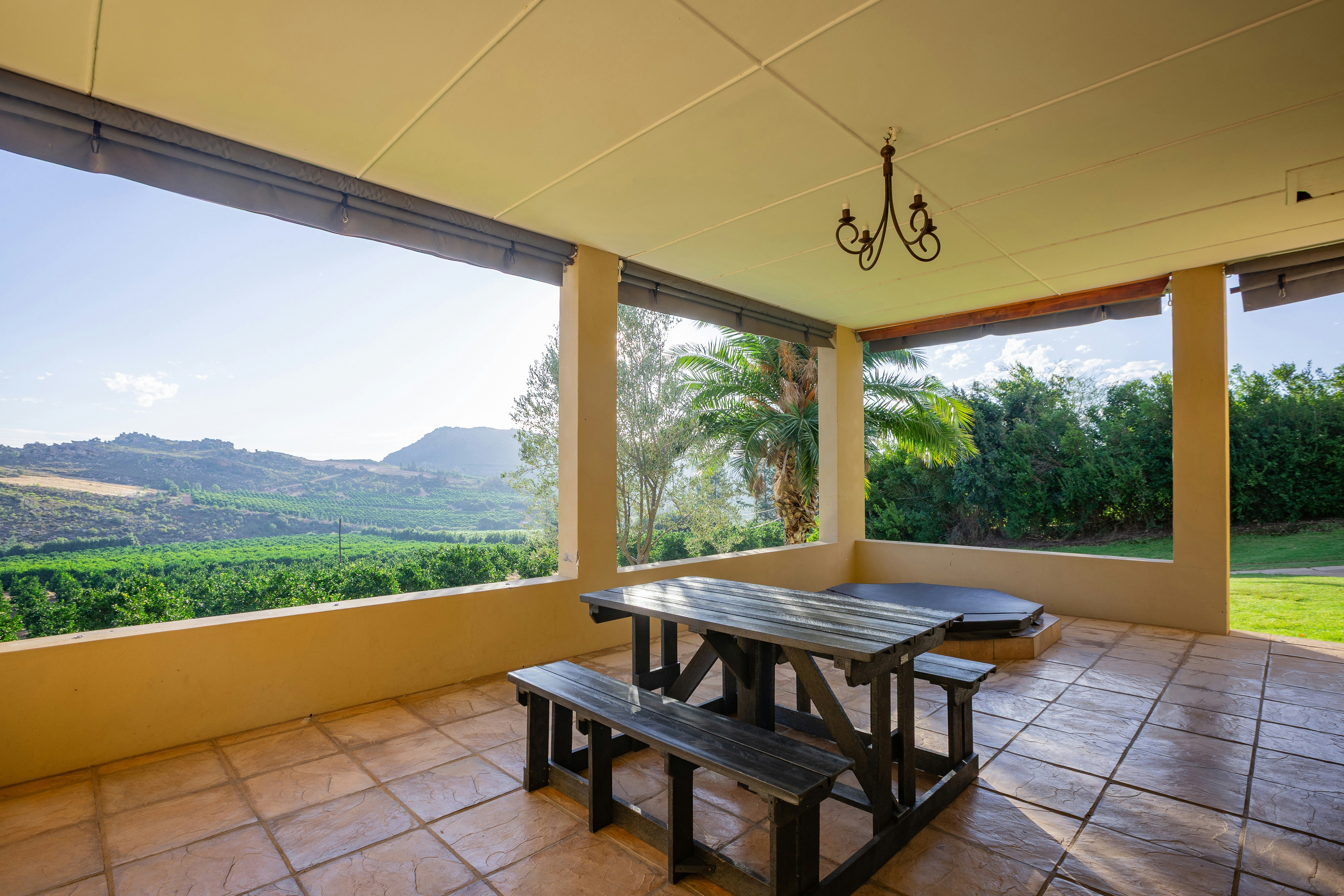 On the covered patio, guests will find outdoor dining and braai facilities, as well as a jacuzzi. The guesthouse is surrounded by mountains, orange trees and a beautiful lawn. Guests have access to a swimming pool, free Wi-Fi and secure parking.