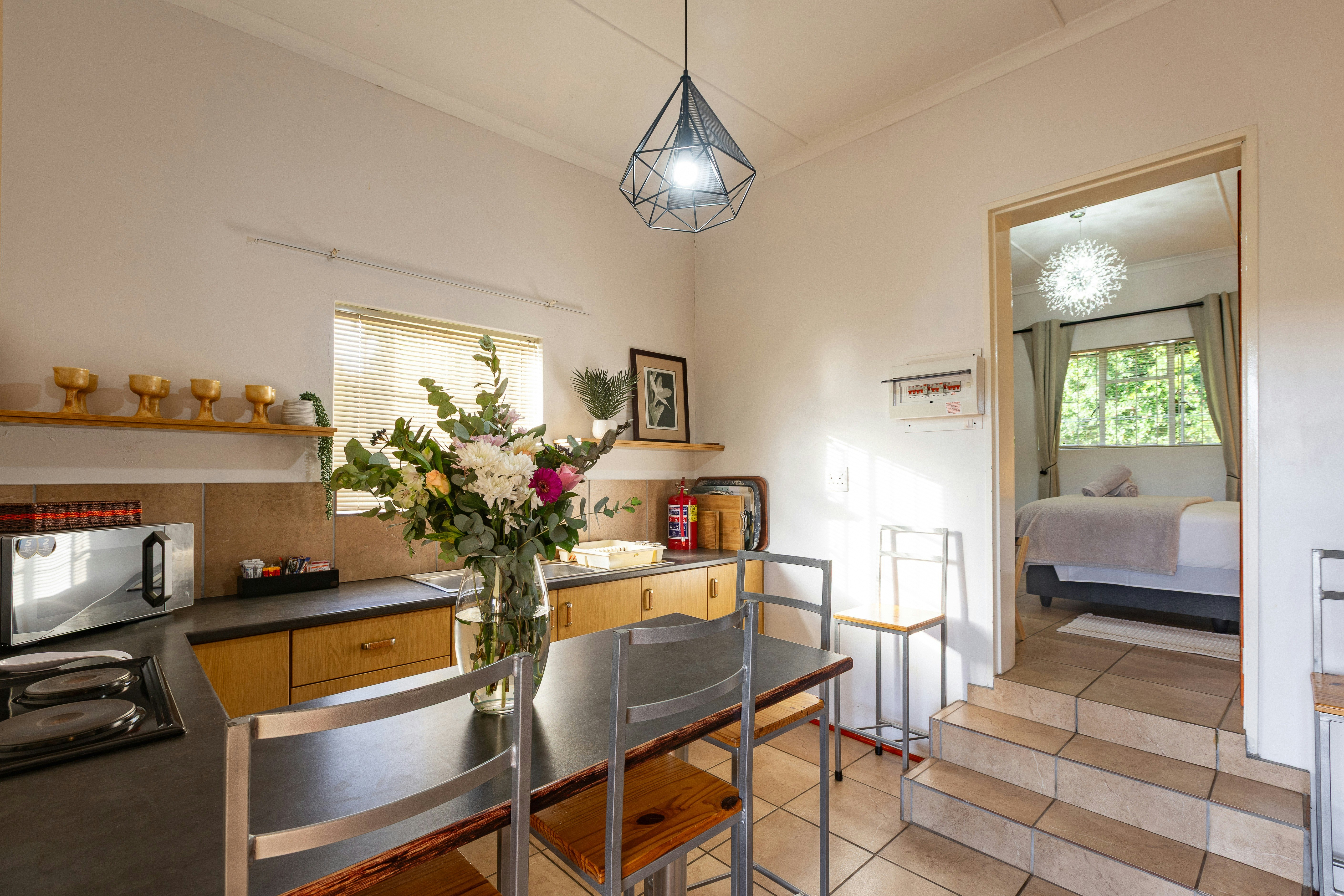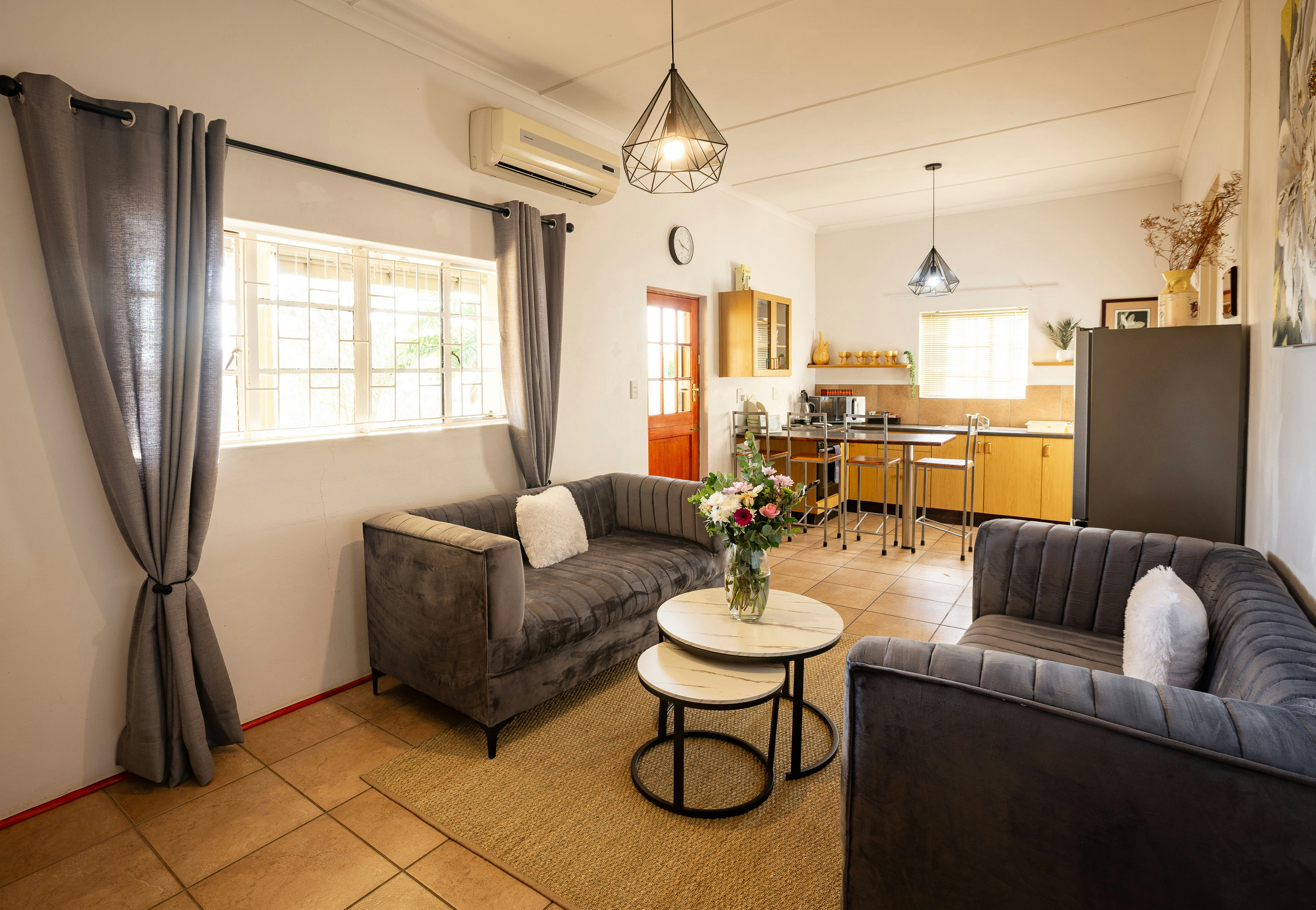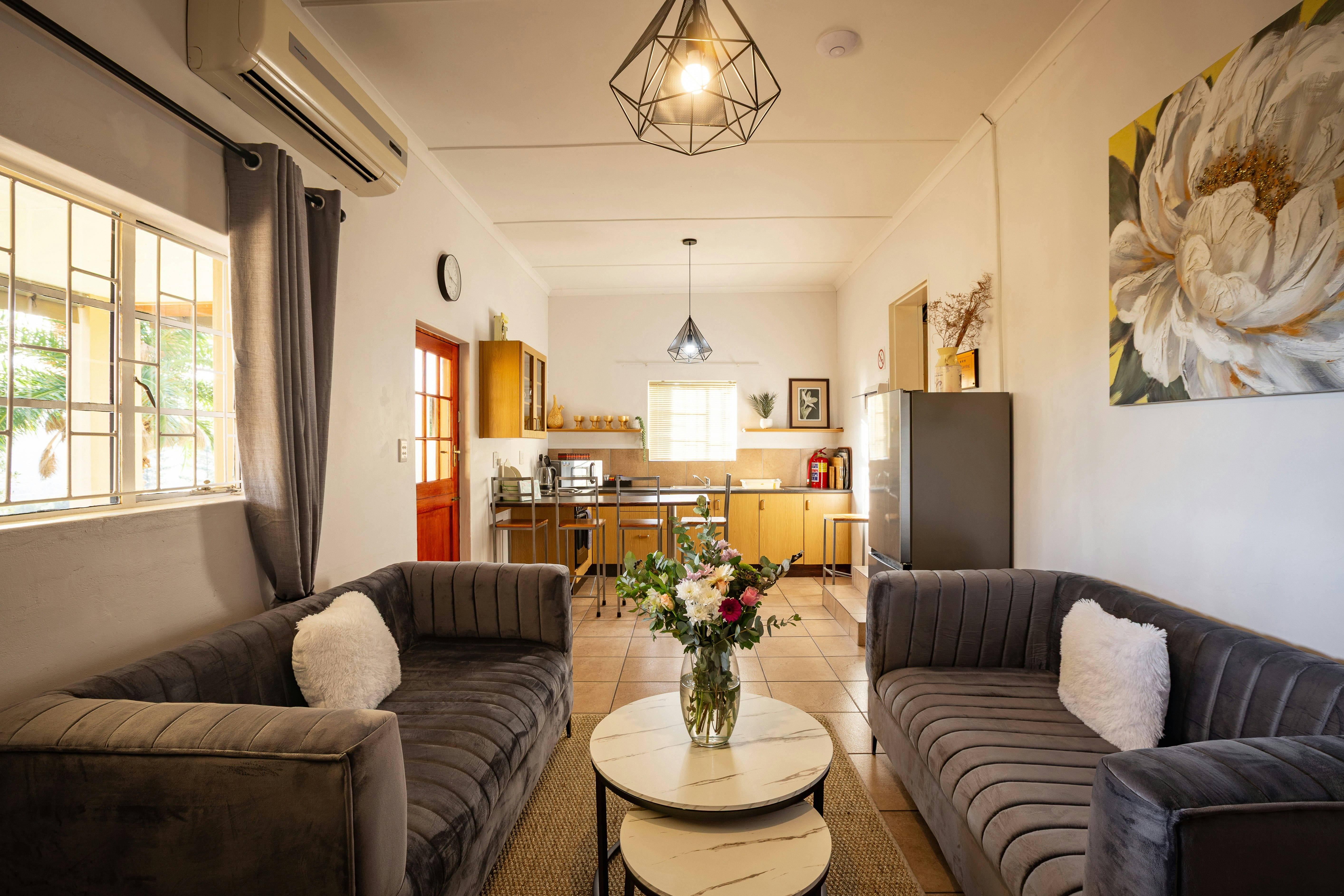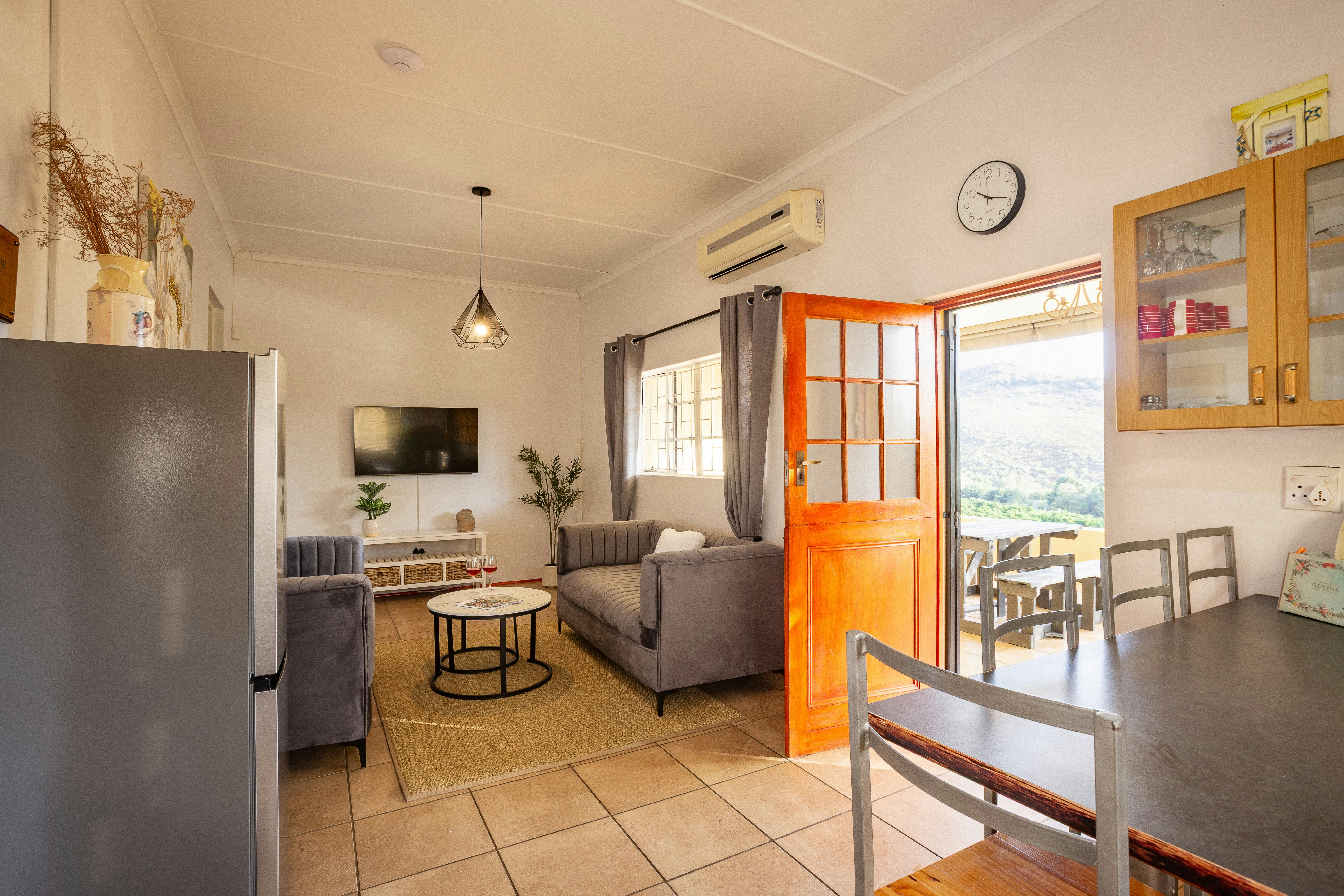 The air-conditioned open-plan living space features a lounge with a TV offering DStv and comfortable couches, while the kitchen is fully equipped with a fridge-freezer, stove, oven and microwave.