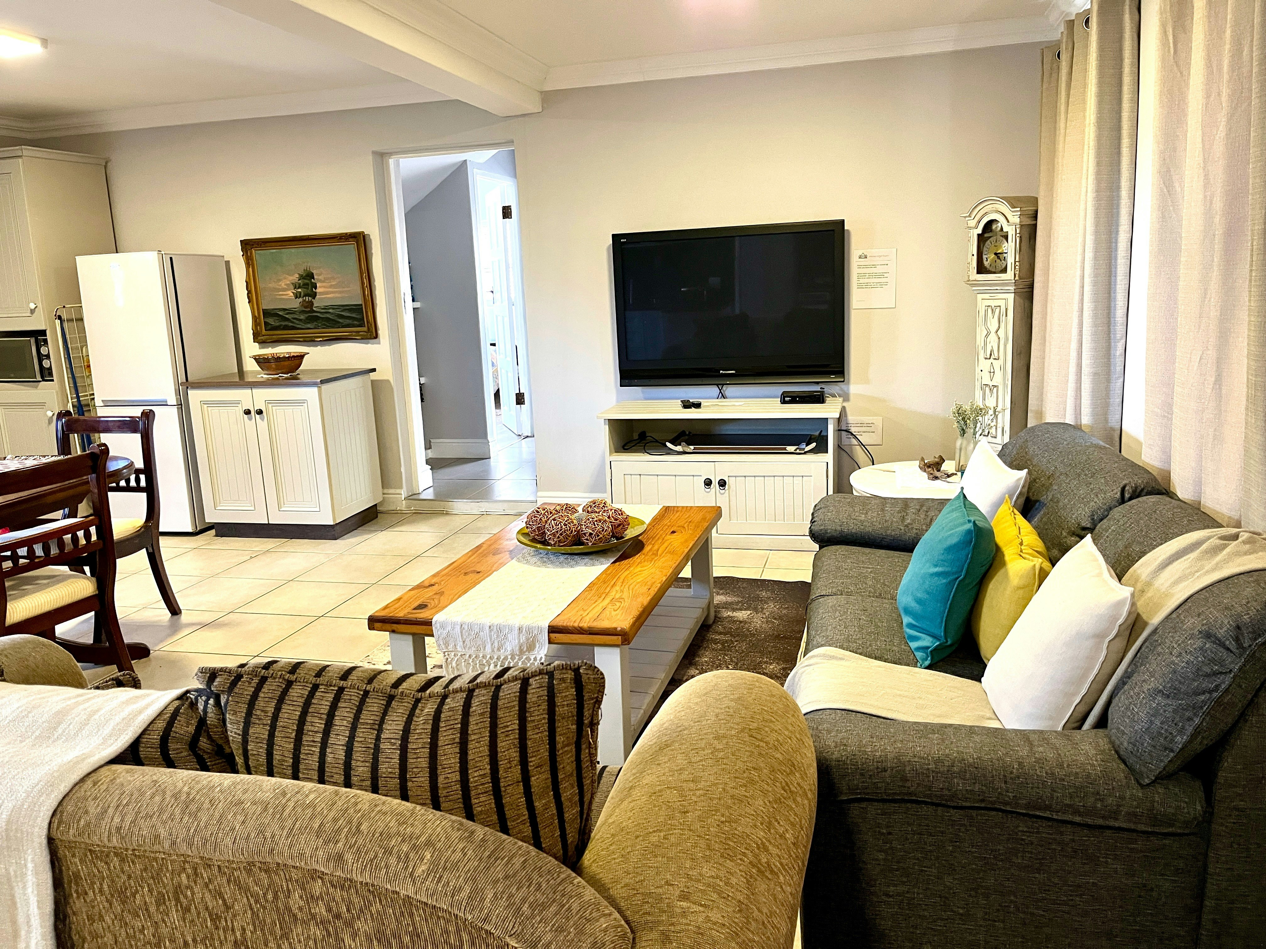 The kitchen is equipped with a fridge, stove, oven, microwave, cutlery, crockery, and tea- and coffee-making facilities, and features a centrally located dining table with chairs. It extends to the lounge furnished with comfy seating. Guests have access to DStv and complimentary Wi-Fi.