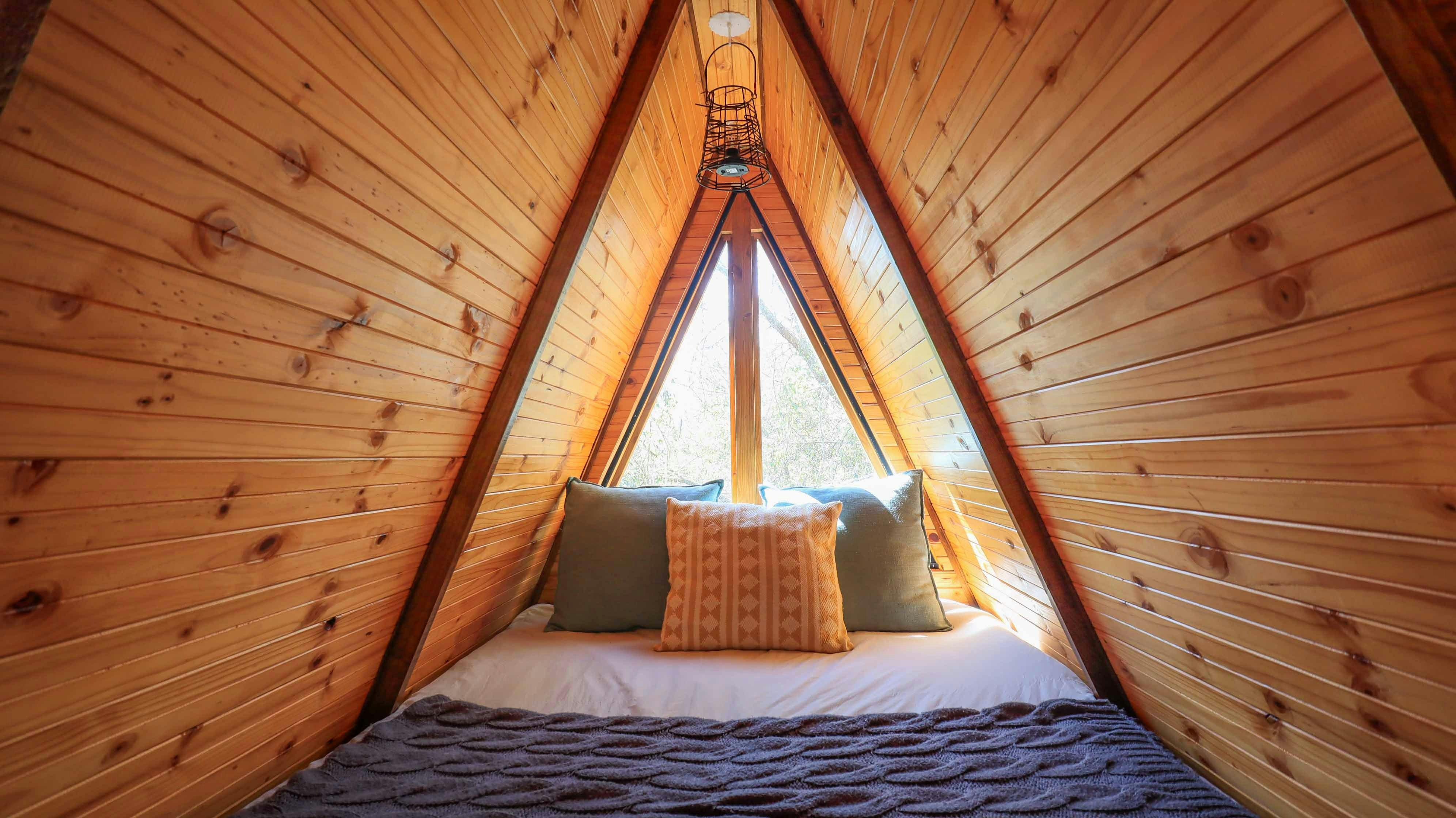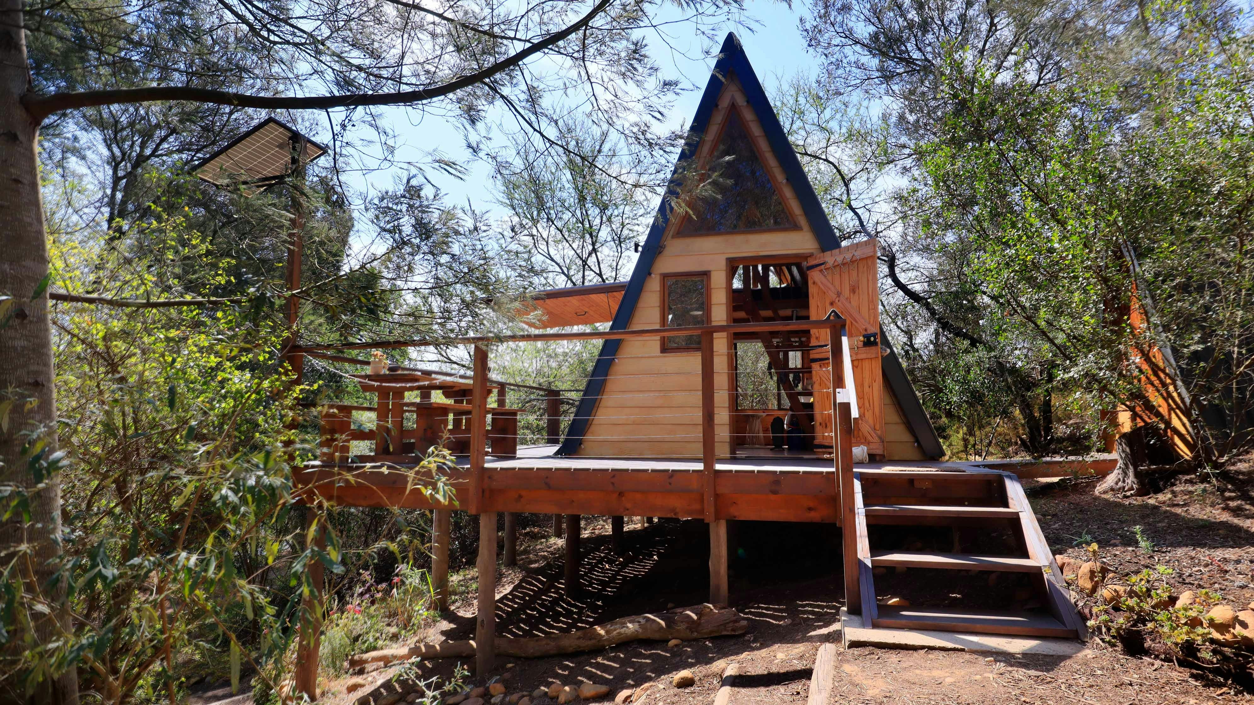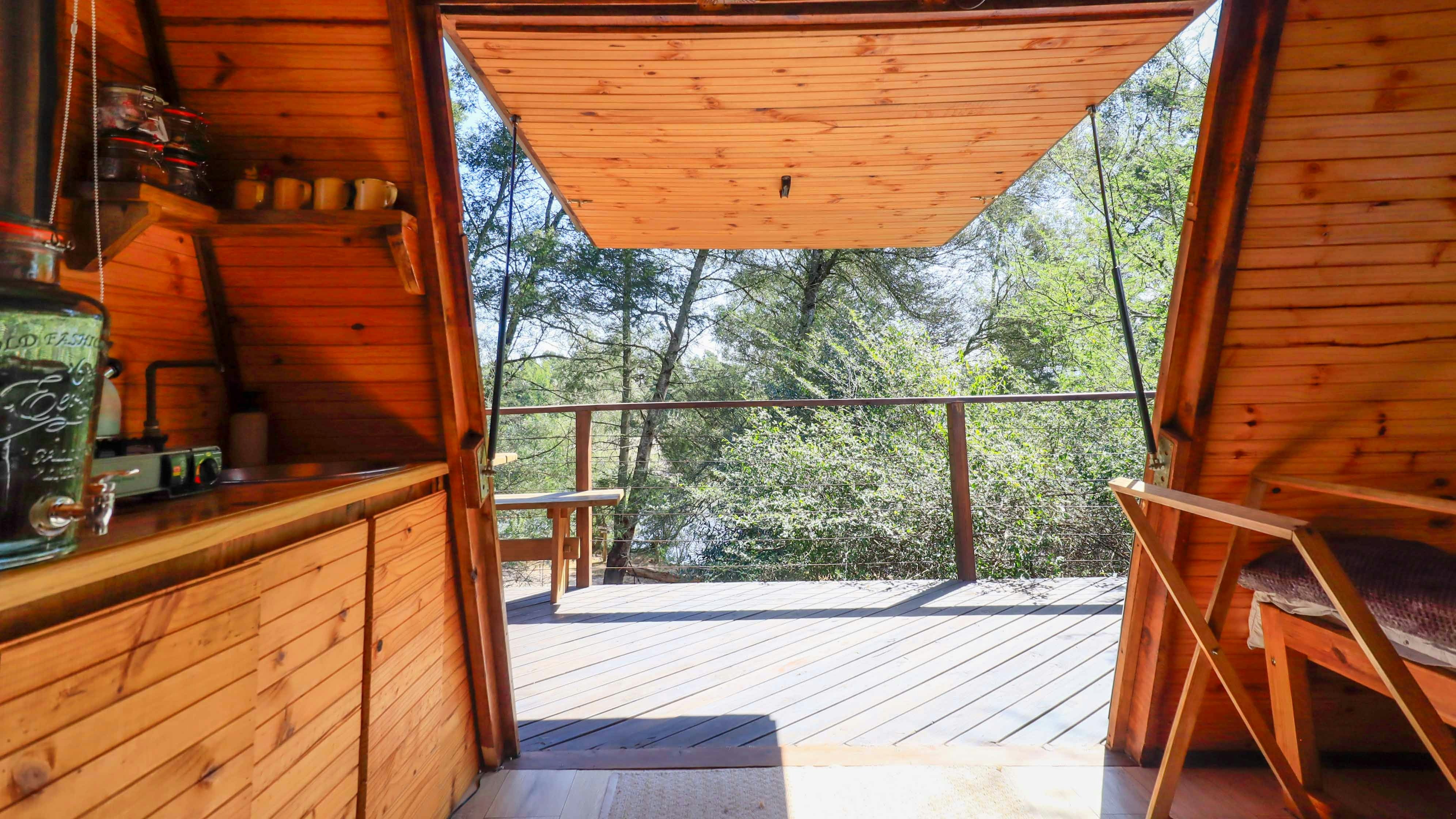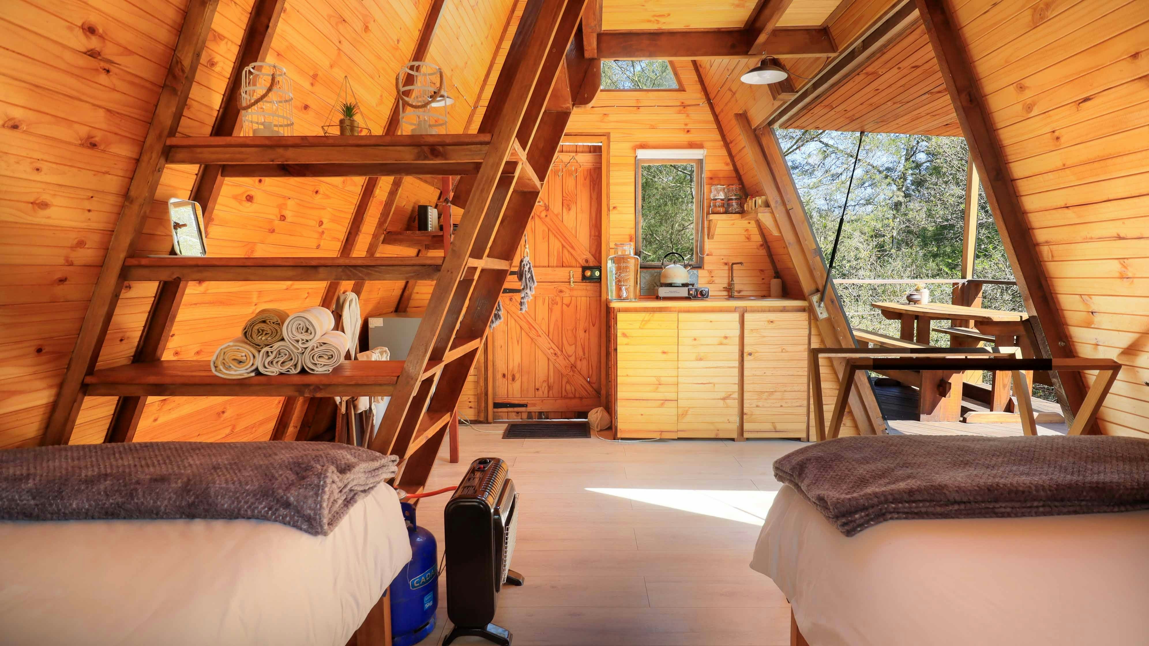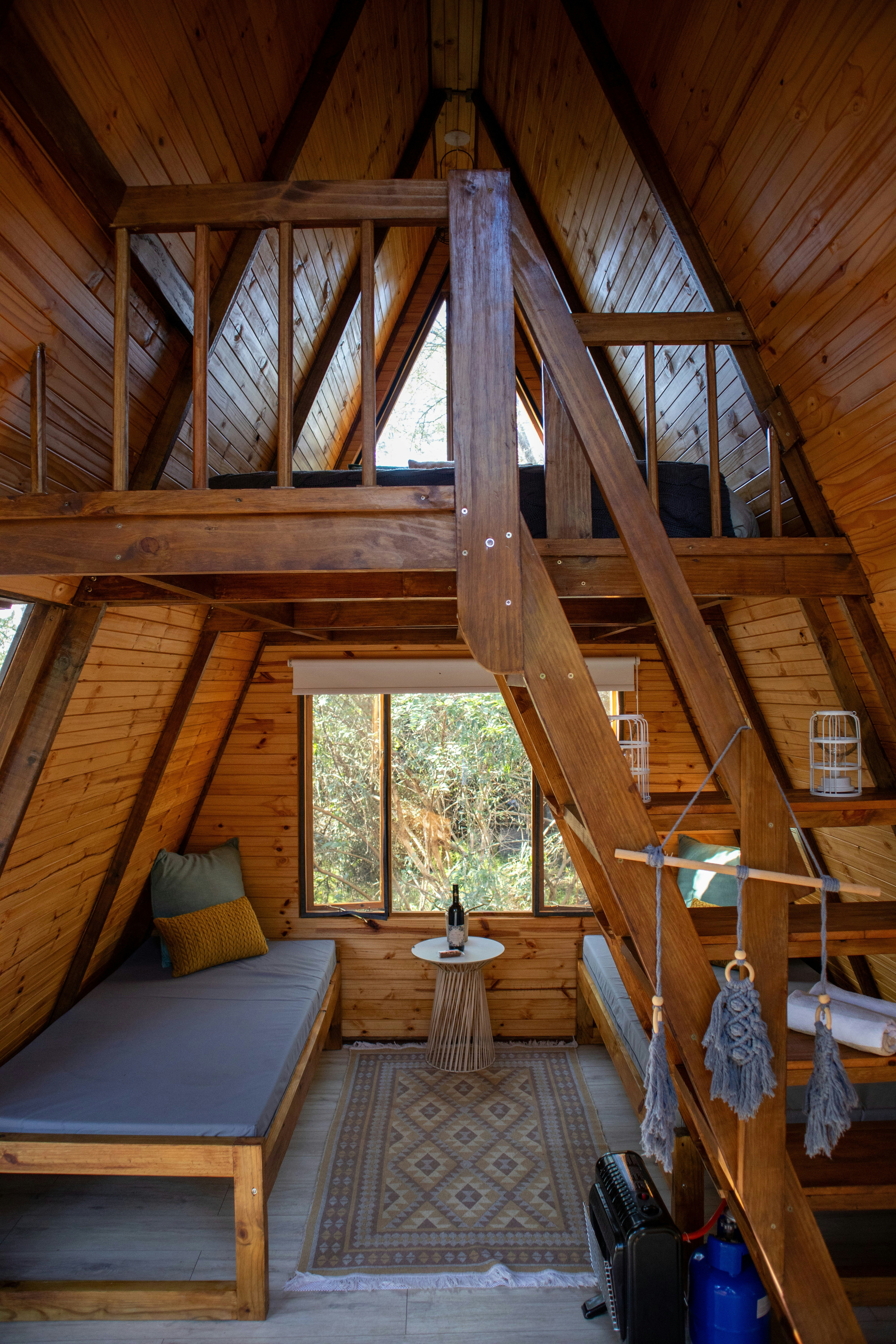 The A-frame cabin is a charming open-plan space that can accommodate up to 4 guests. It features a queen-size bed located in the loft and 2 single sleeper couches on the ground floor. A private deck overlooks the river, offering guests a tranquil setting to unwind and take in the natural beauty. The compact kitchenette is equipped with a bar fridge, gas kettle, cutlery, crockery, pots, pans, and braai utensils for convenient self-catering.