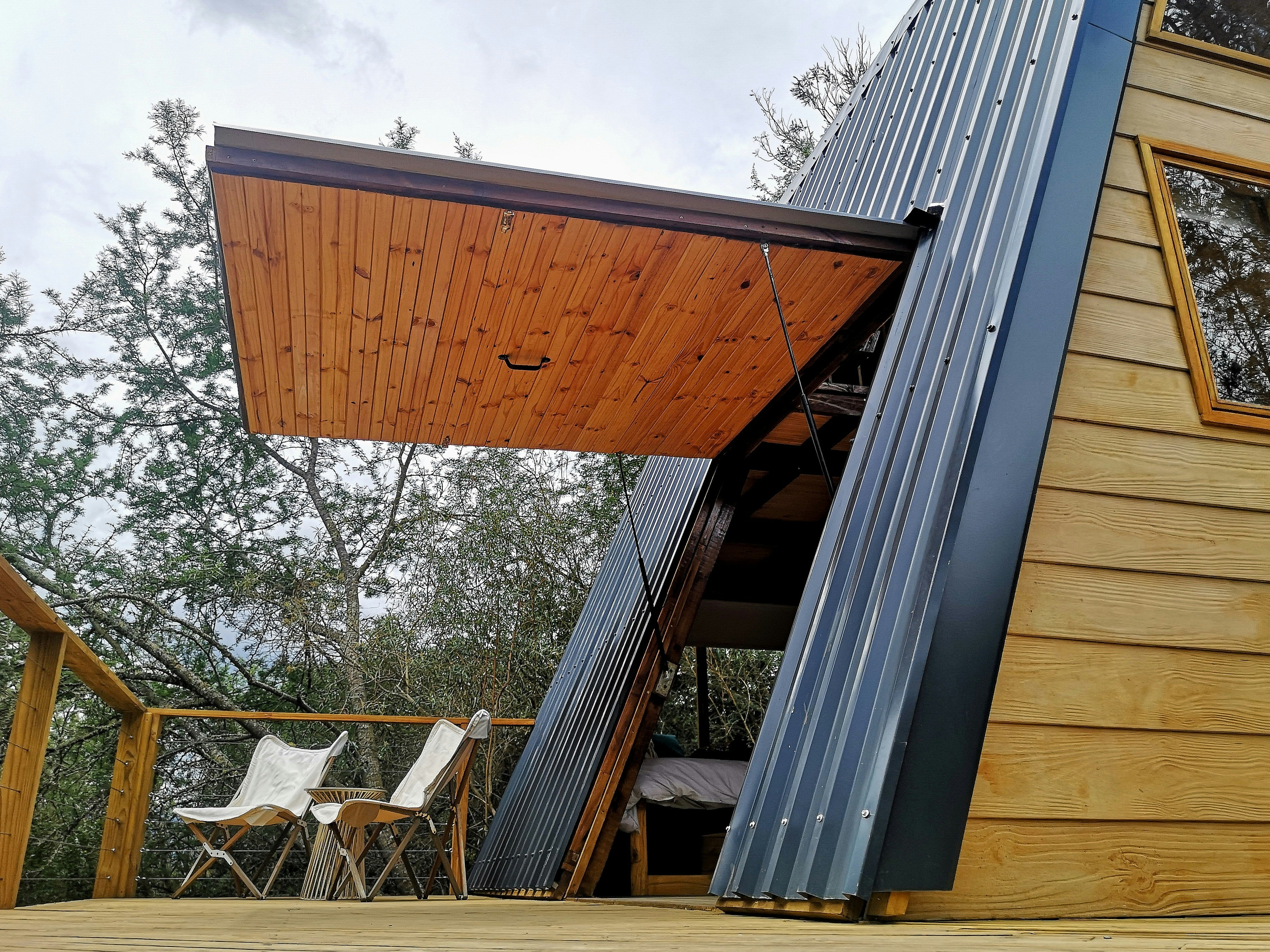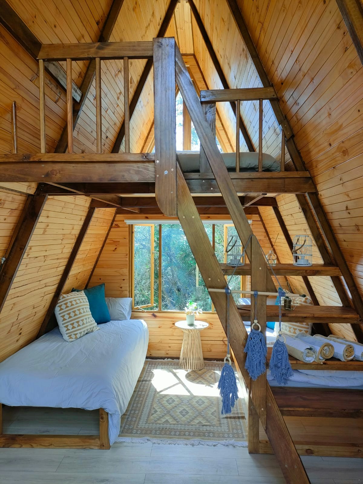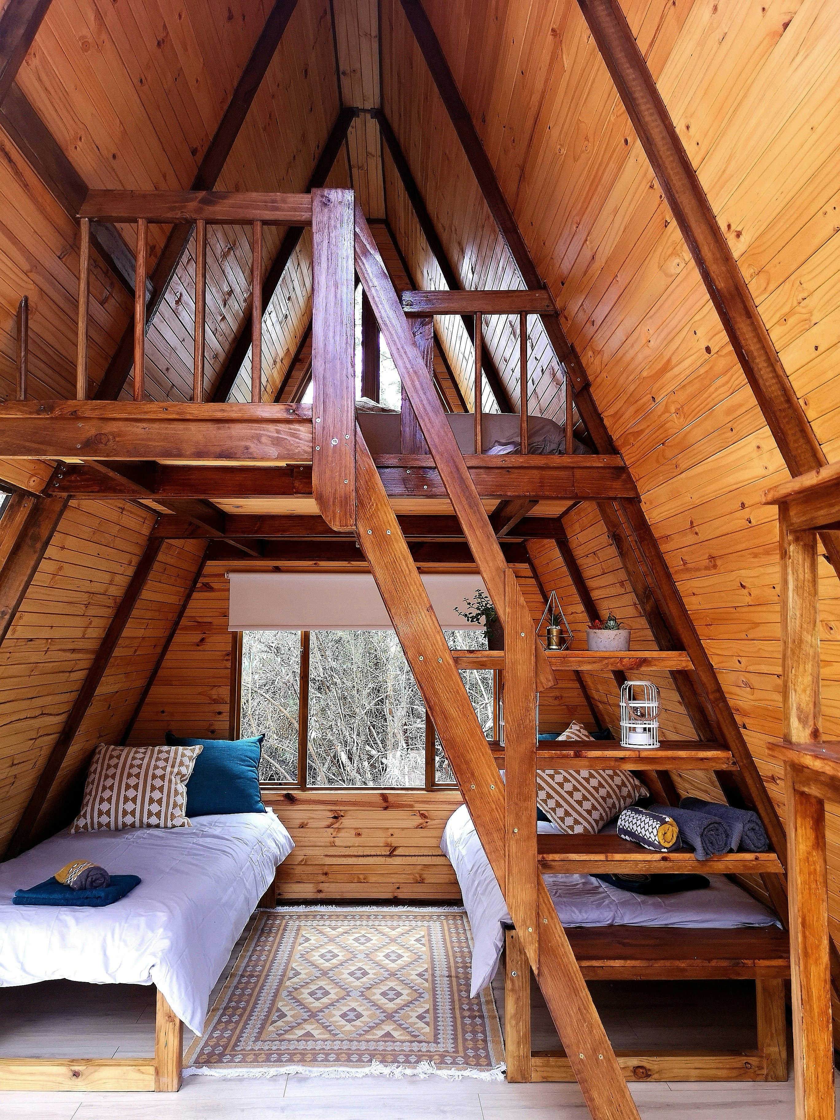 The A-frame cabin is a charming open-plan space that can accommodate up to 4 guests. It features a queen-size bed located in the loft and 2 single sleeper couches on the ground floor. A private deck overlooks the river, offering guests a tranquil setting to unwind and take in the natural beauty. The compact kitchenette is equipped with a bar fridge, gas kettle, cutlery, crockery, pots, pans, and braai utensils for convenient self-catering.