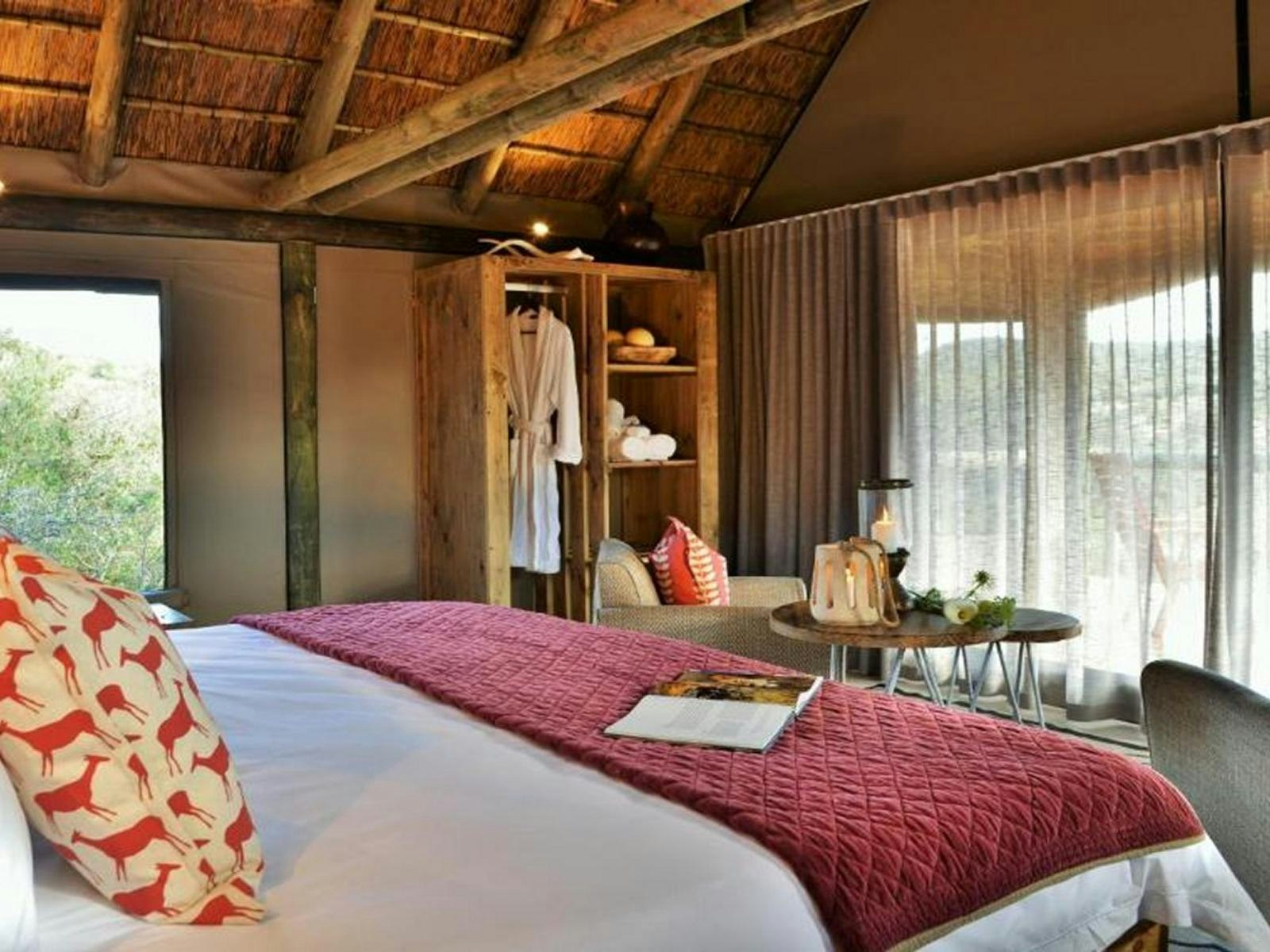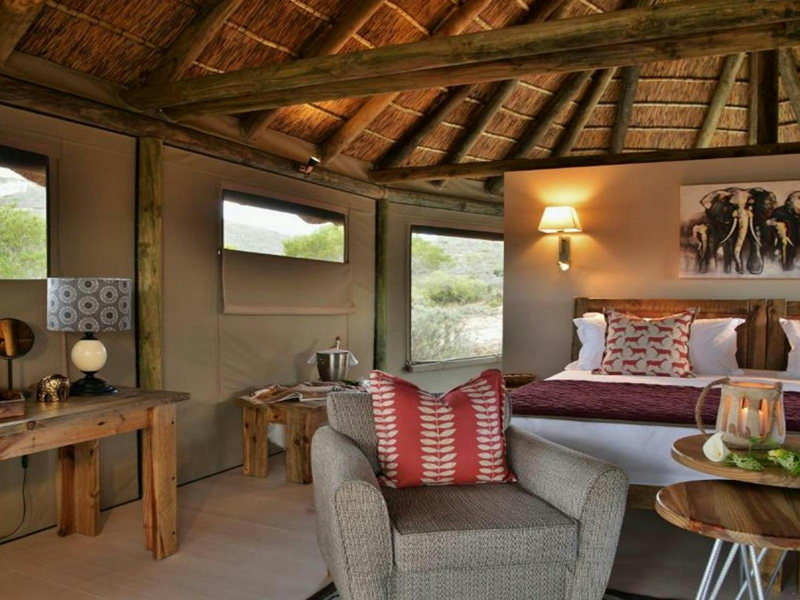Accommodation at Garden Route Safari Camp comprises 6 luxury thatched-roof canvas units and a 3-bedroom house. Each unit is elevated and features a lounge area, a private bathroom with an outdoor shower. In addition, each unit contains a safe to store valuables, hairdryer, complimentary gowns and slippers, as well as a private deck that offers picturesque views of the reserve.