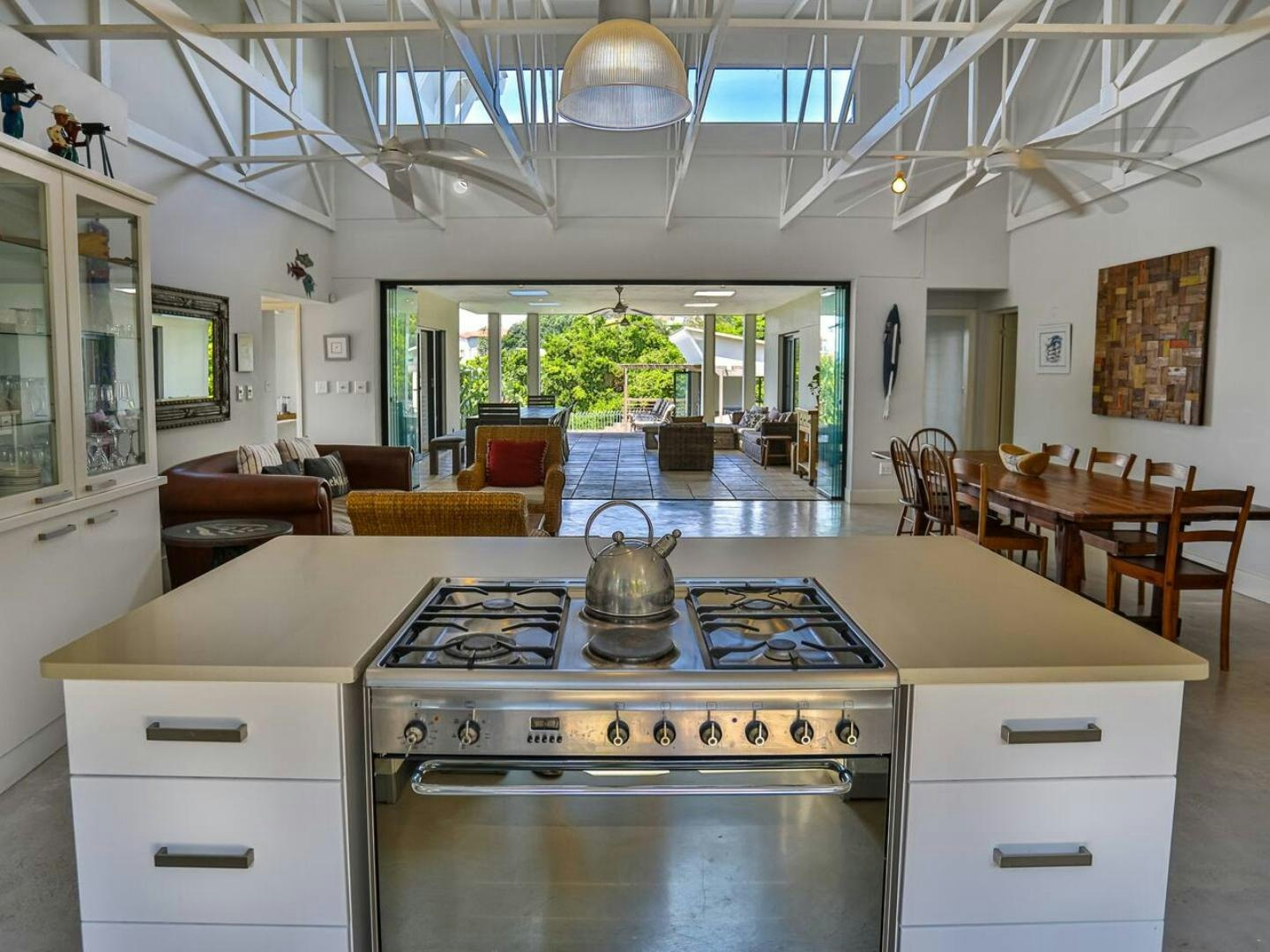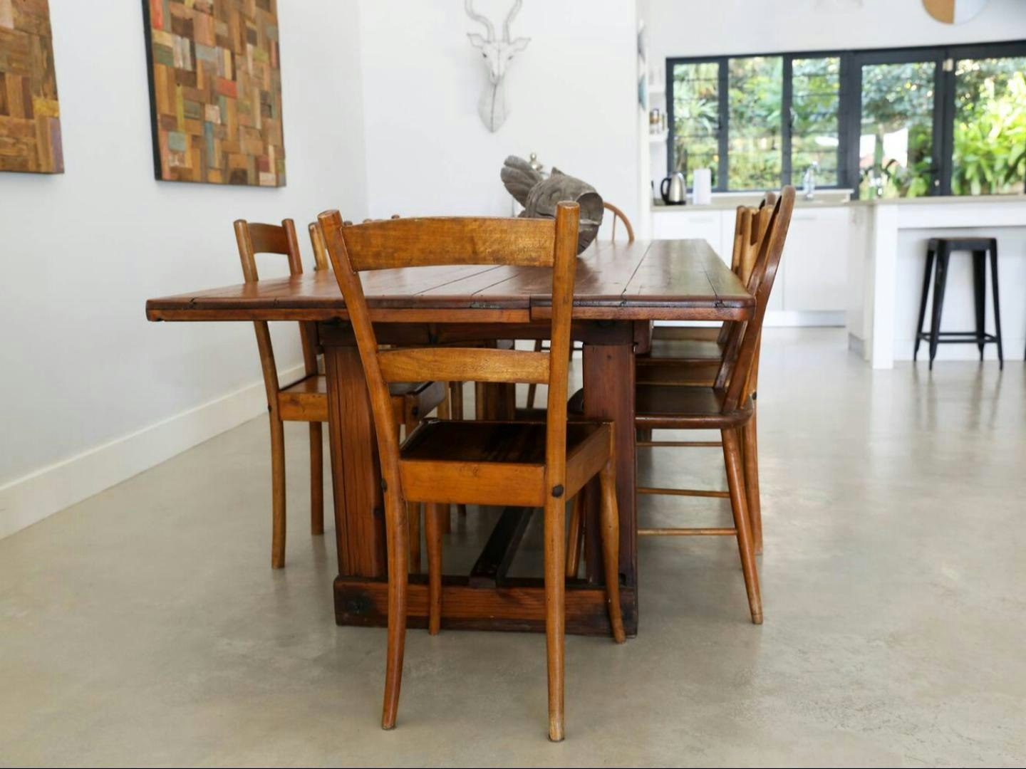 Large stackable glass doors open onto a covered patio, creating a seamless indoor-outdoor living space that overlooks the sparkling pool and pool house, the ideal setting for long summer days and laid-back evenings. The boma braai area offers a welcoming space for entertaining, surrounded by the beauty of the tropical garden. Secure driveway parking is available.