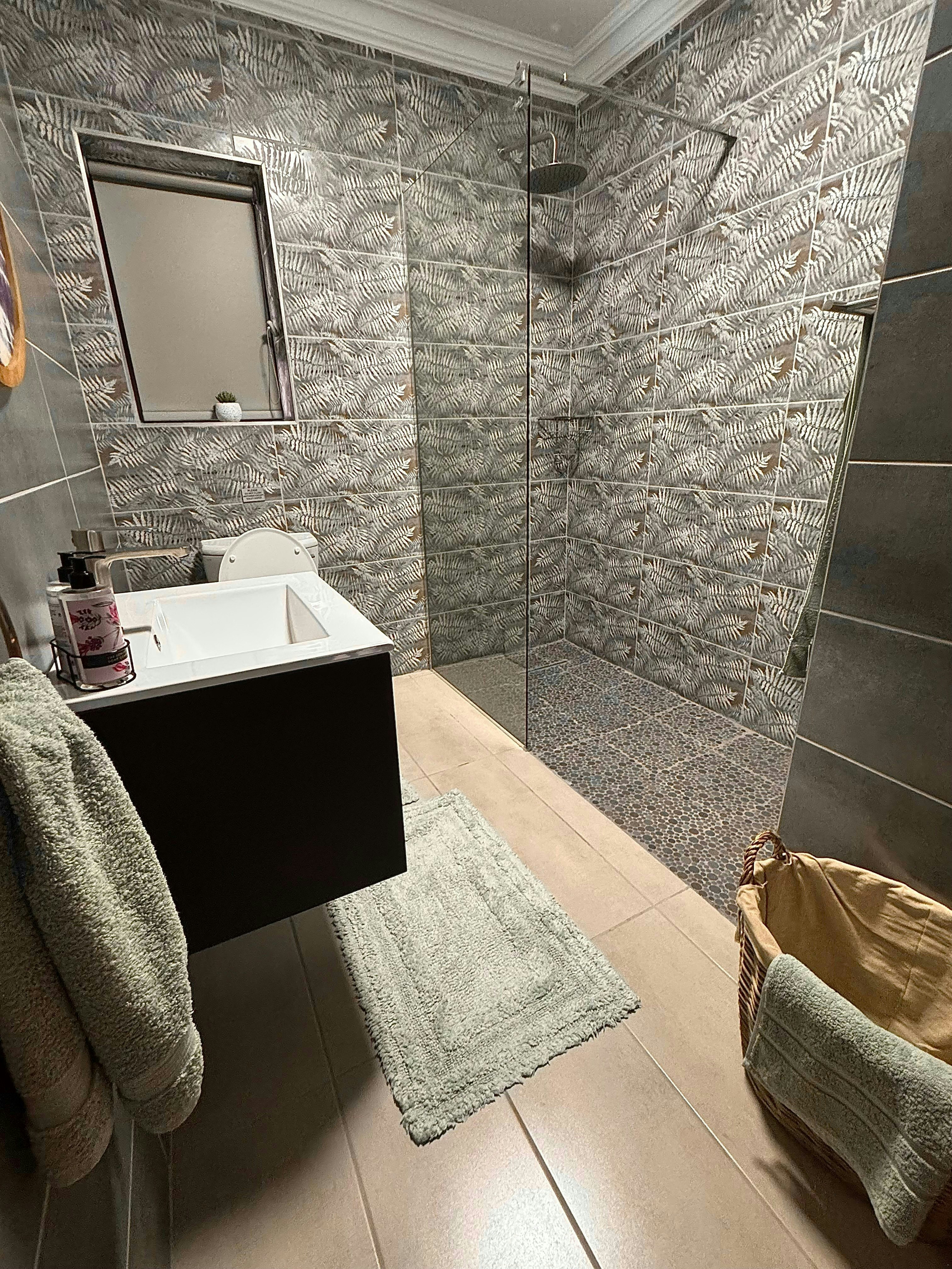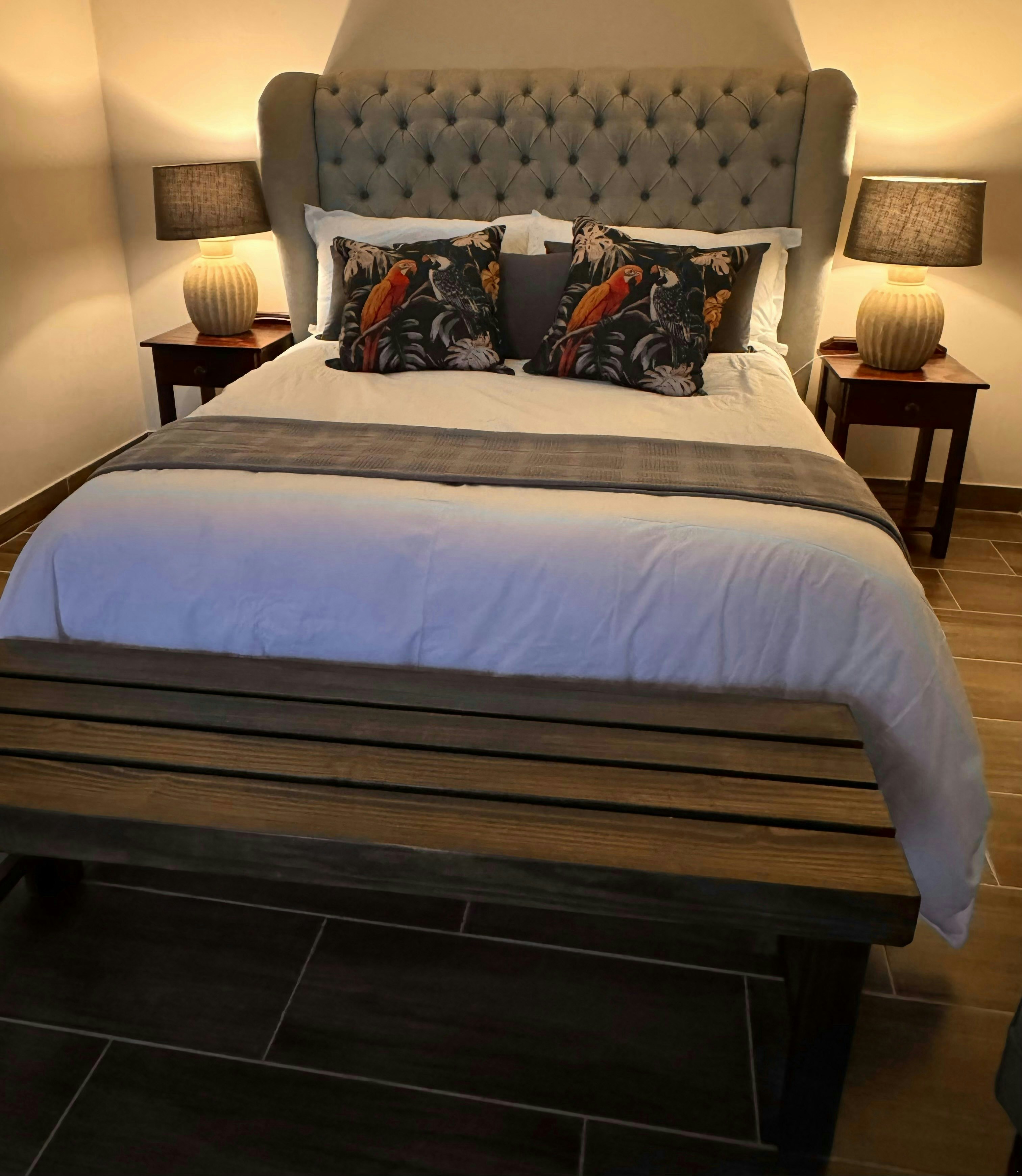 The property features 3 rooms, each furnished with an en-suite bathroom and equipped with a TV with DStv Stream, a bar fridge, and a kettle with tea and coffee. All rooms are accessible from the porch, and the property is fully enclosed with electrical fencing, ensuring privacy and security.