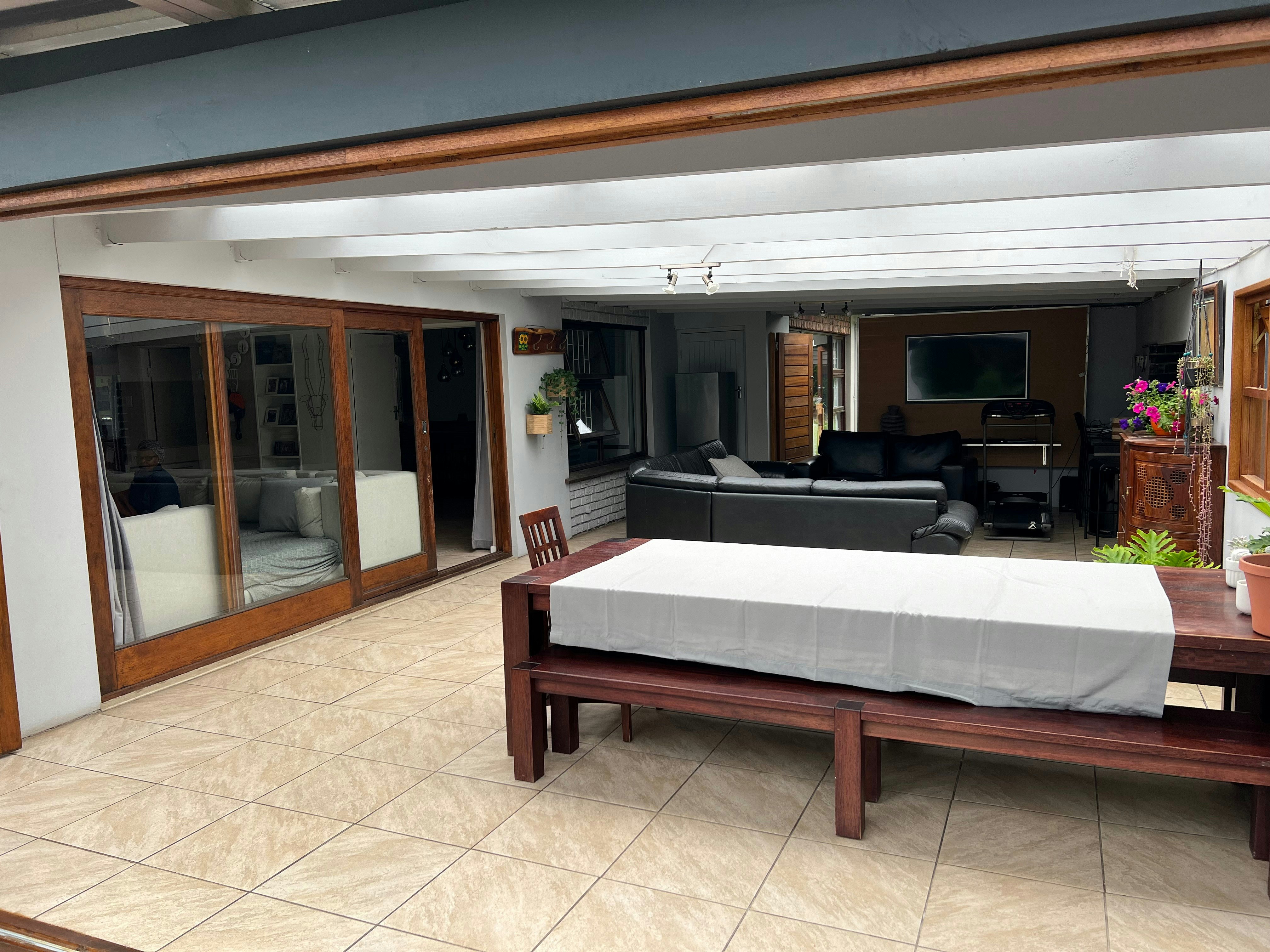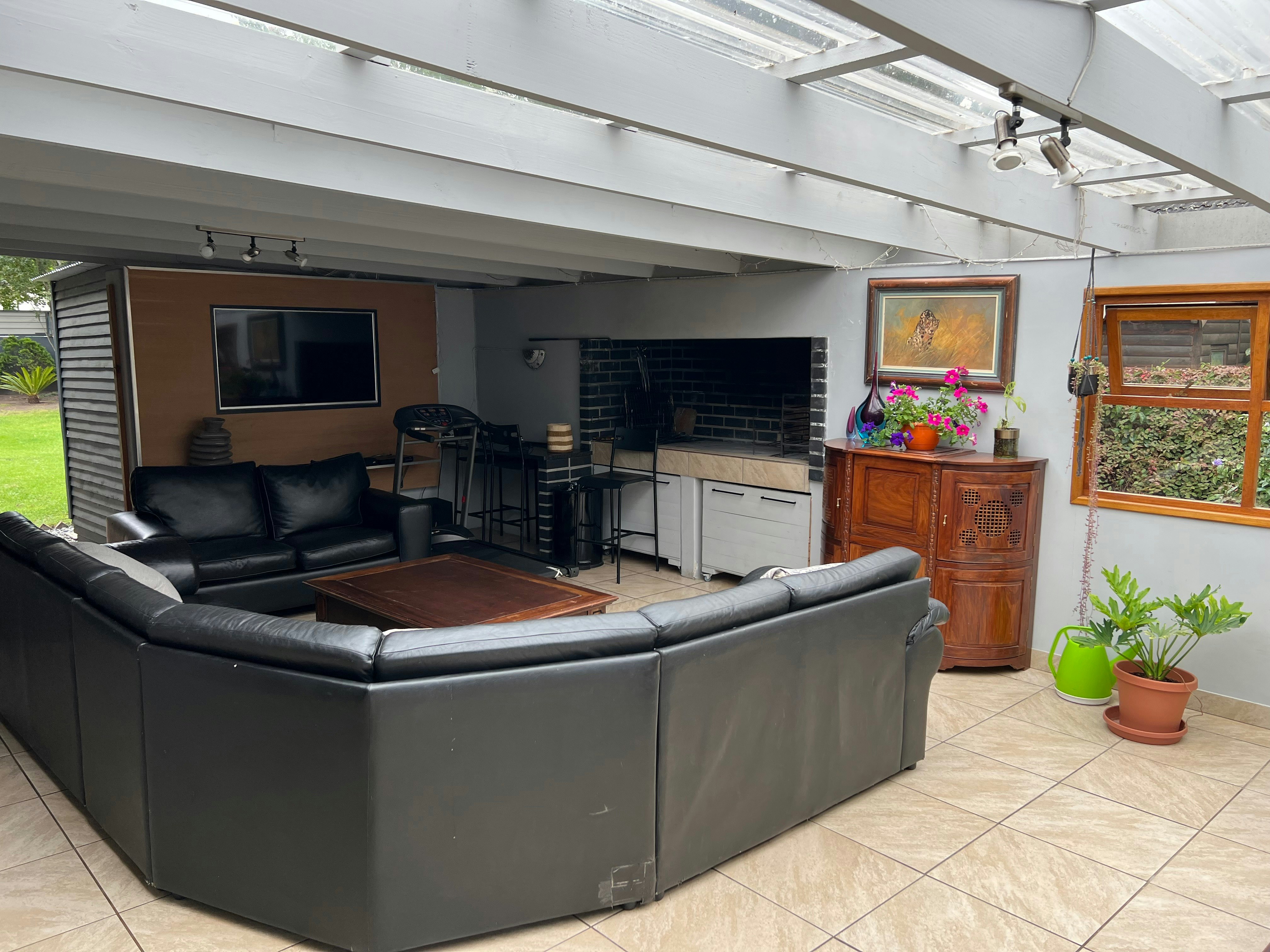 Die oopplan-leefarea het gemaklike sitplek, 'n TV en 'n kombuishoekie. Die kombuis met 'n yskas-vrieskas, stoof, oond, mikrogolfoond en koffie- en teemaakgeriewe toegerus. Daar is ook 'n binnebraai en TV. Die verblyf het 'n verhitte swembad, 'n gholfbaan, netbalbaan en 'n trampolien.