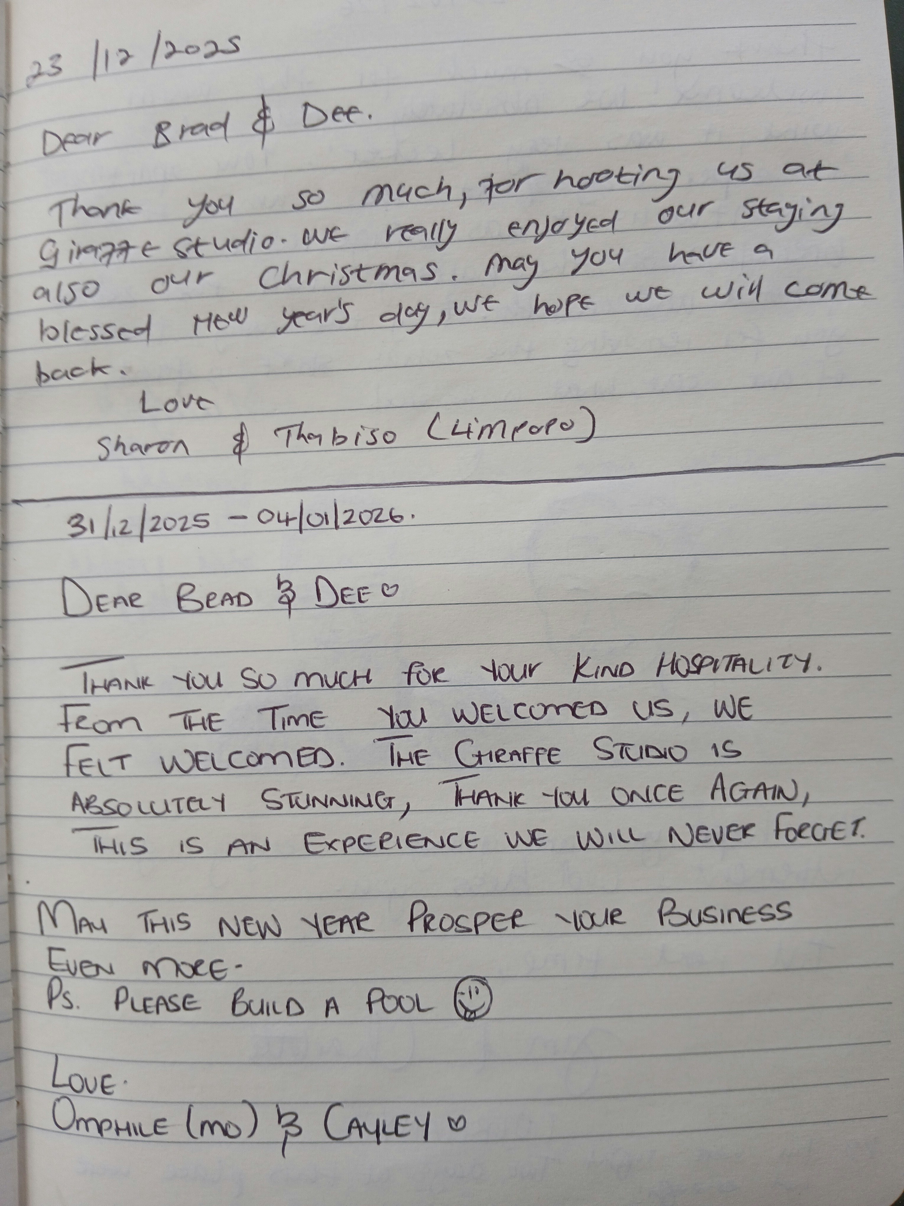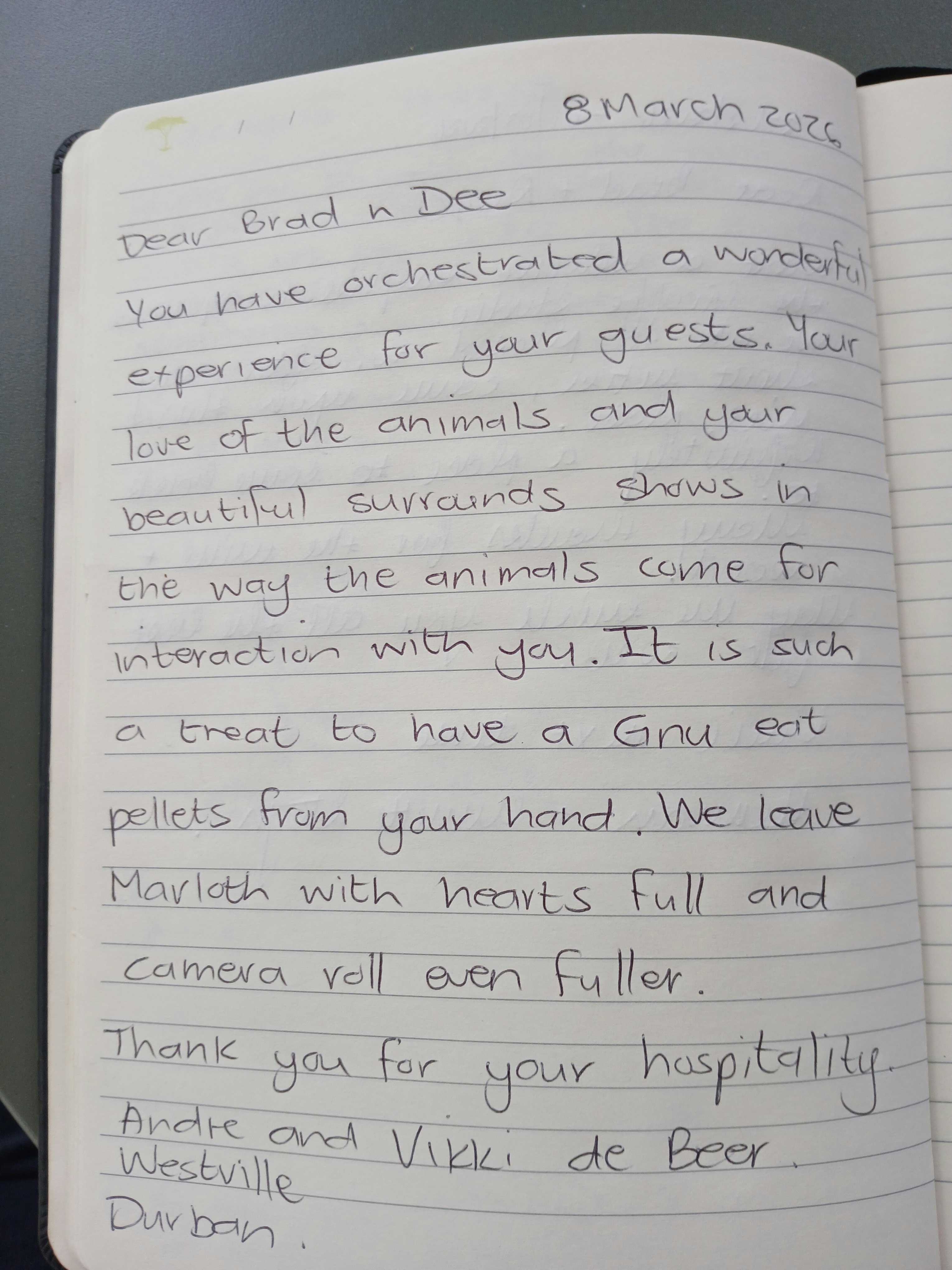 Baie dankie, Retha, dit was baie lekker om julle hier te hê. Ons is bly julle het julle verblyf geniet. Goeie groete, Brad en Dee.