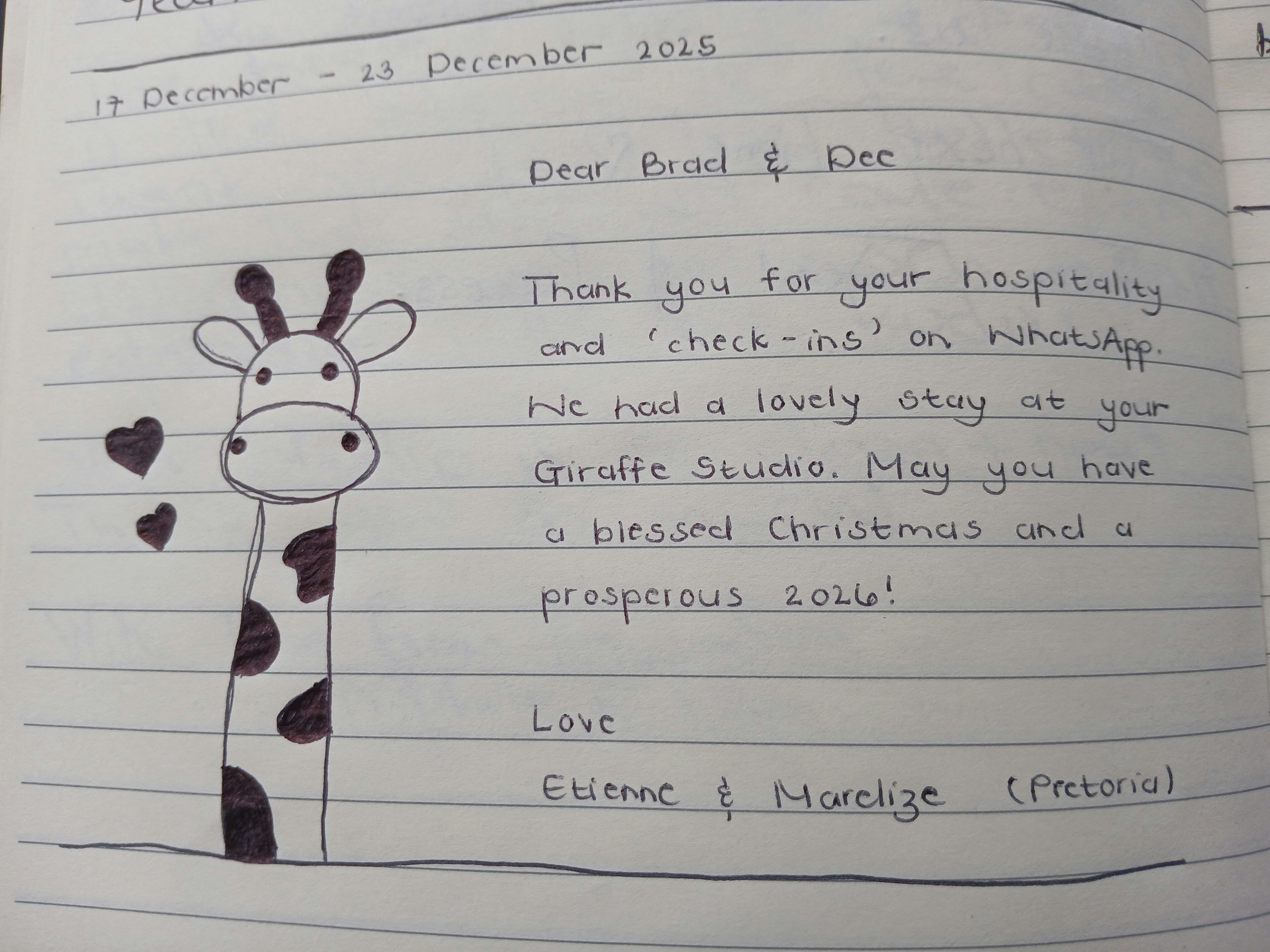Ons is so bly dat jy jou tyd by Giraffe Studio geniet het, ons waardeer jou aanbeveling. Vriendelike groete Brad en Dee