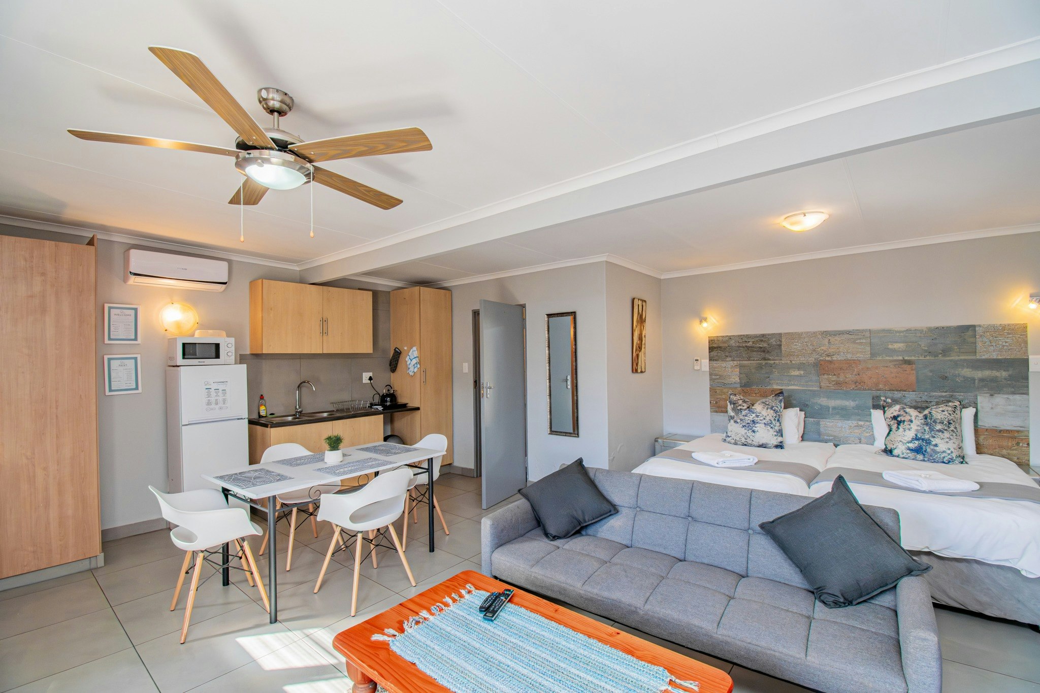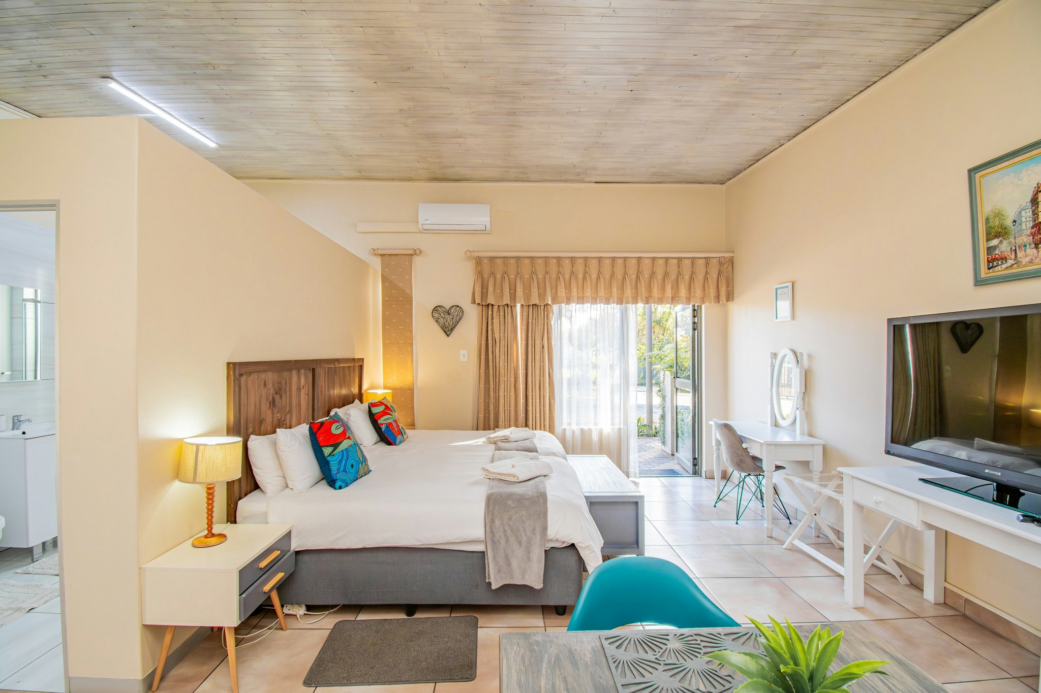 The guest house offers a choice of rooms and units that can accommodate between 2 to 4 people and have private entrances. The units are furnished with double beds, and three-quarter beds, and each room has an en-suite bathroom. Quality linen, blankets and towels are provided for extra convenience. The air-conditioned units are equipped with fridges, microwaves, tea- and coffee-making facilities, TVs with selected DStv channels, and Wi-Fi access.
