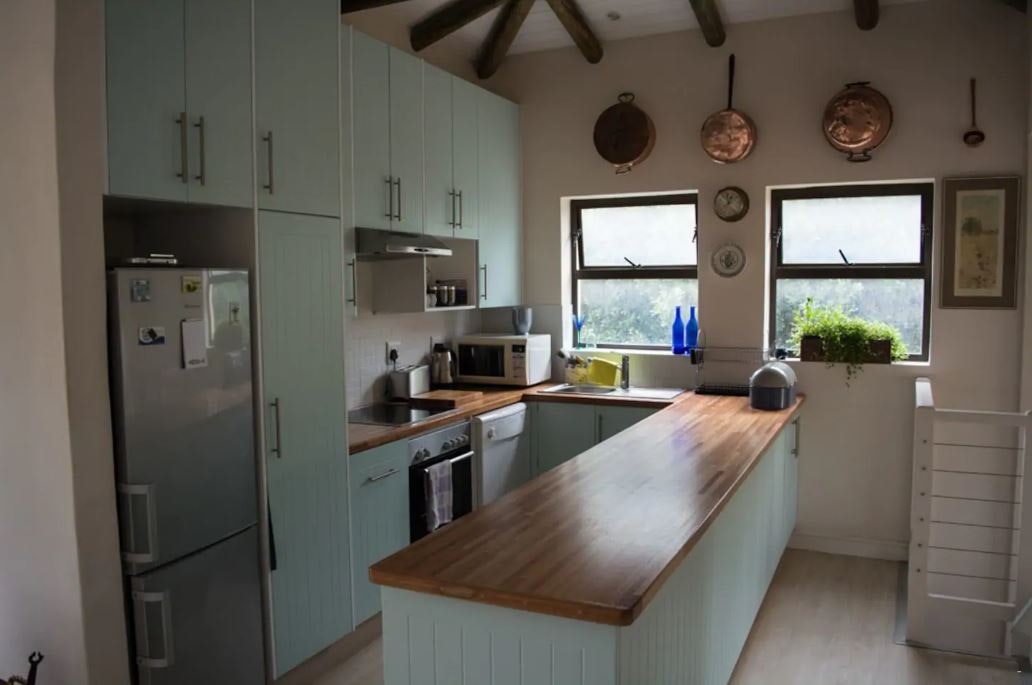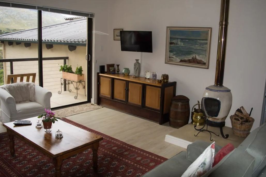 There is a 4-seater dining table and chairs. The kitchen is fully equipped with a stove and oven, fridge-freezer, microwave, kettle, toaster and a dishwasher. The lounge features a fireplace, and a TV with a DVD player. Free Wi-Fi is available. The apartment has its own balcony overlooking the Buffels river estuary, the garden and pond, and the mountains.
