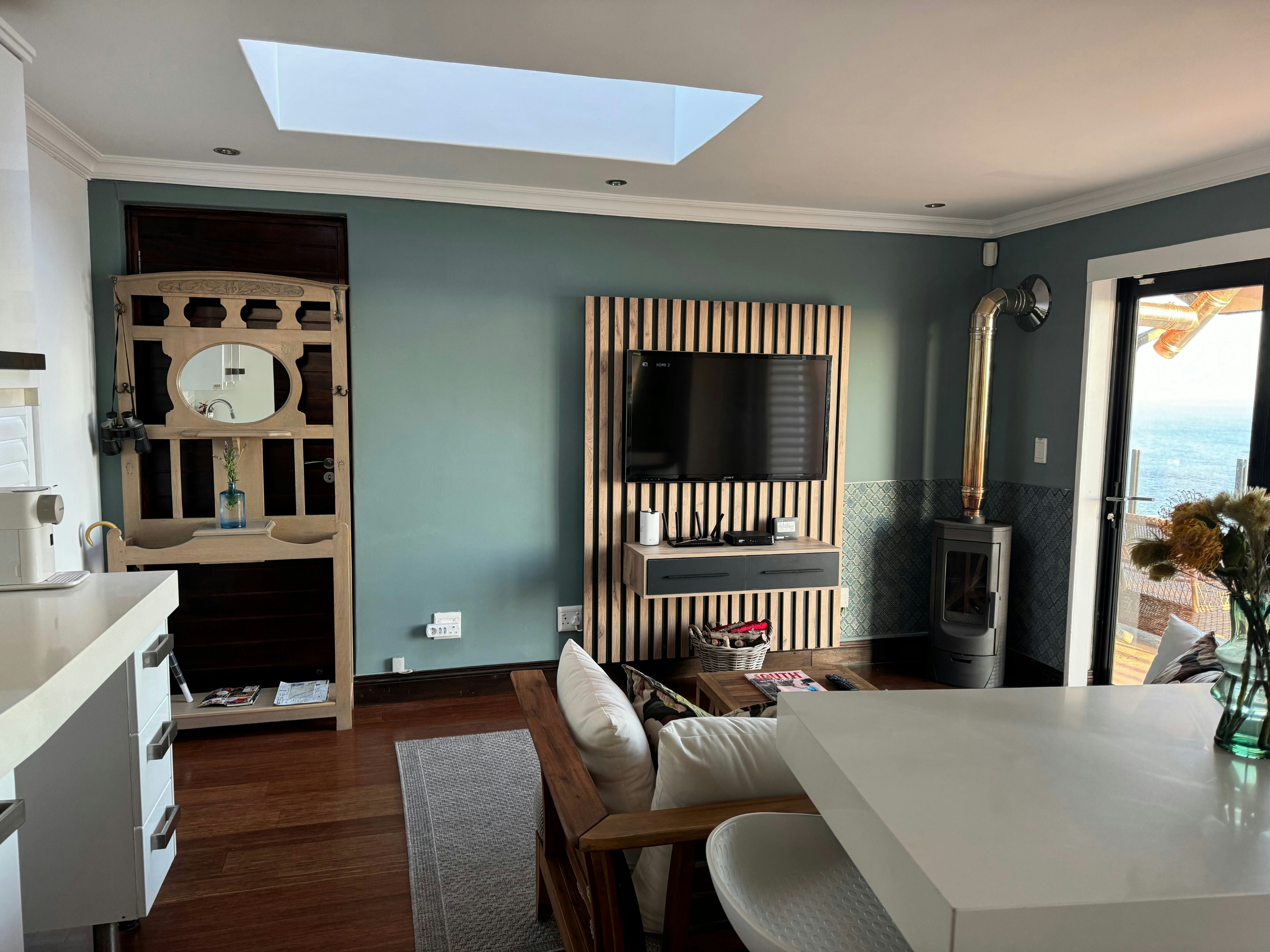 Die oopplan-kombuis op die onderste verdieping is met 'n yskas-vrieskas, mikrogolf, eetgerei, breekware en tee- en koffiemaakgeriewe toegerus. Dit lei na die oopplan-leefarea met 'n rusbank en platskerm-TV.