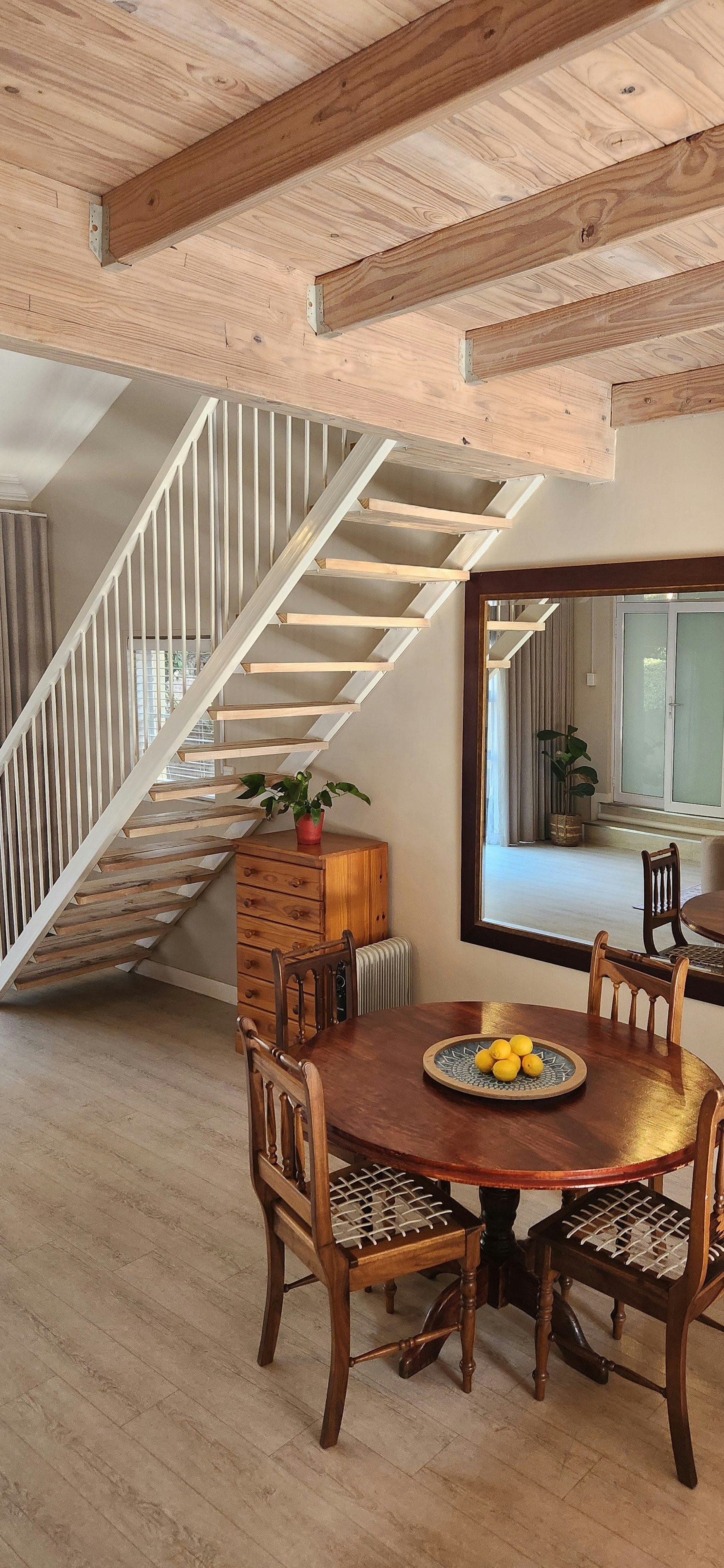 The living area downstairs features a spacious open-plan design, including a seating area, dining room, and kitchen. The kitchen is equipped with an air fryer, microwave, small fridge, toaster, egg cooker, kettle, filter coffee machine, crockery, and cutlery. The seating area offers comfortable seating and a TV with a full selection of DStv channels.