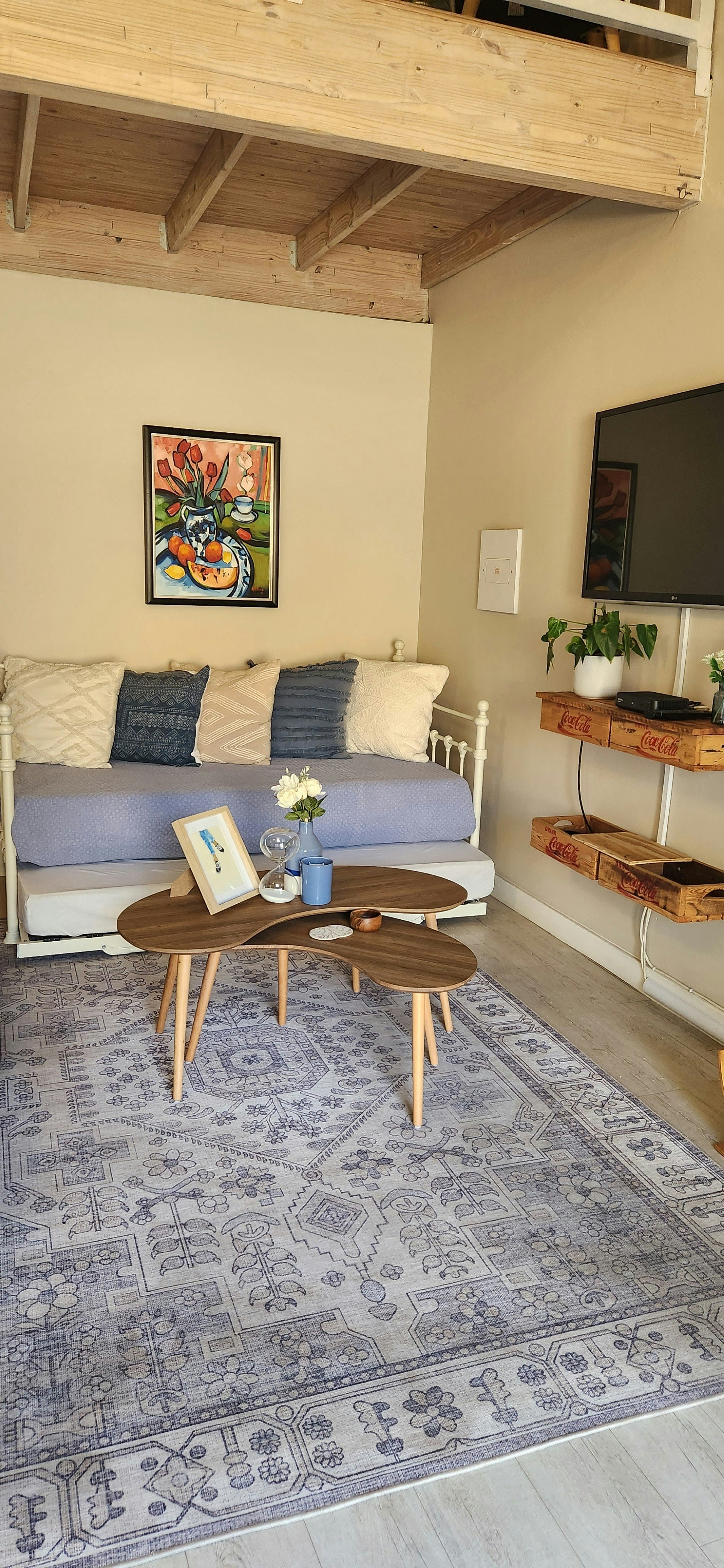 The loft bedroom is furnished with a queen-size bed and includes a bathroom fitted with a shower, toilet, and basin. Additionally, there are 2 single beds available in the lounge for 2 extra guests at an additional cost.