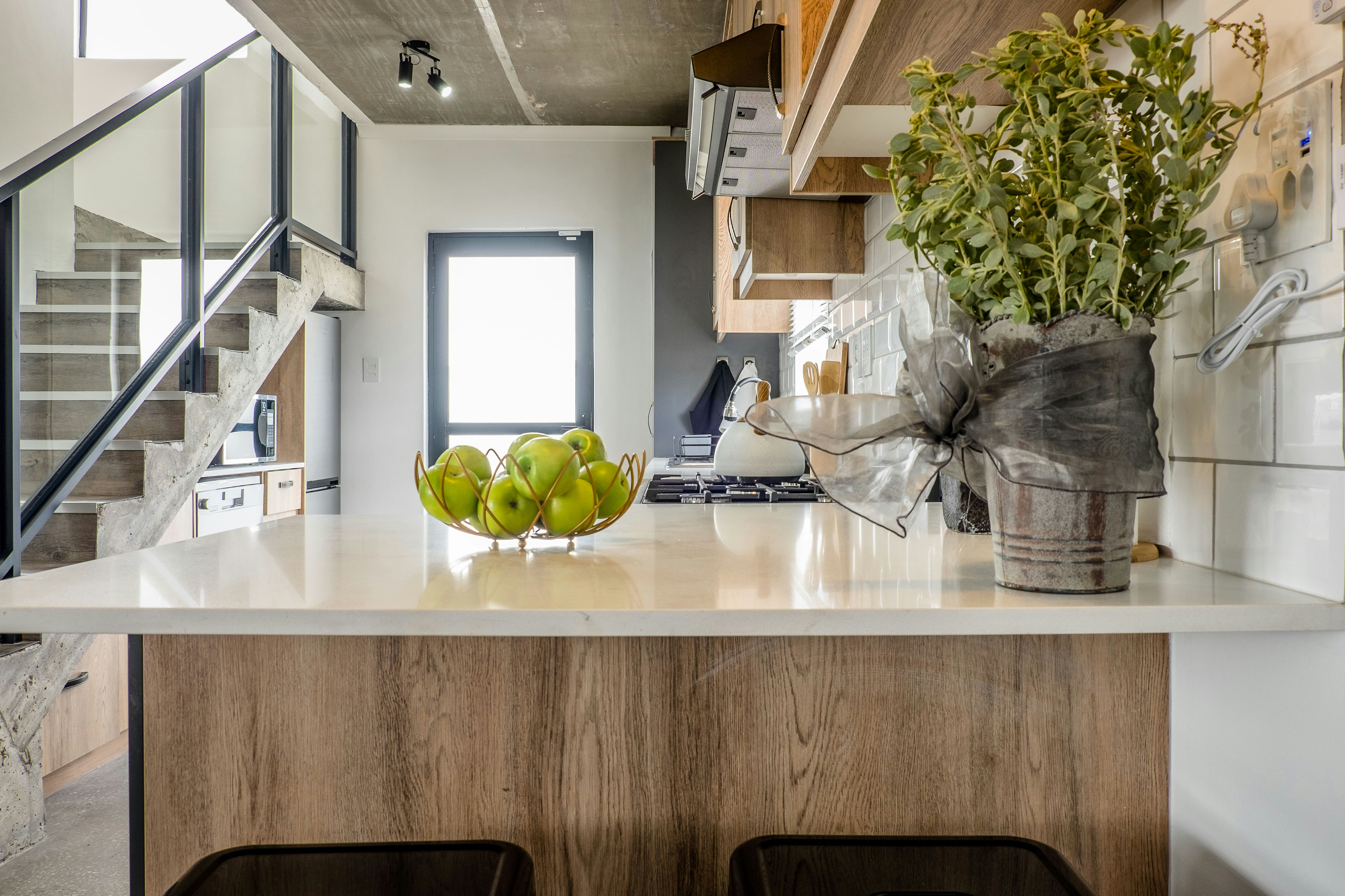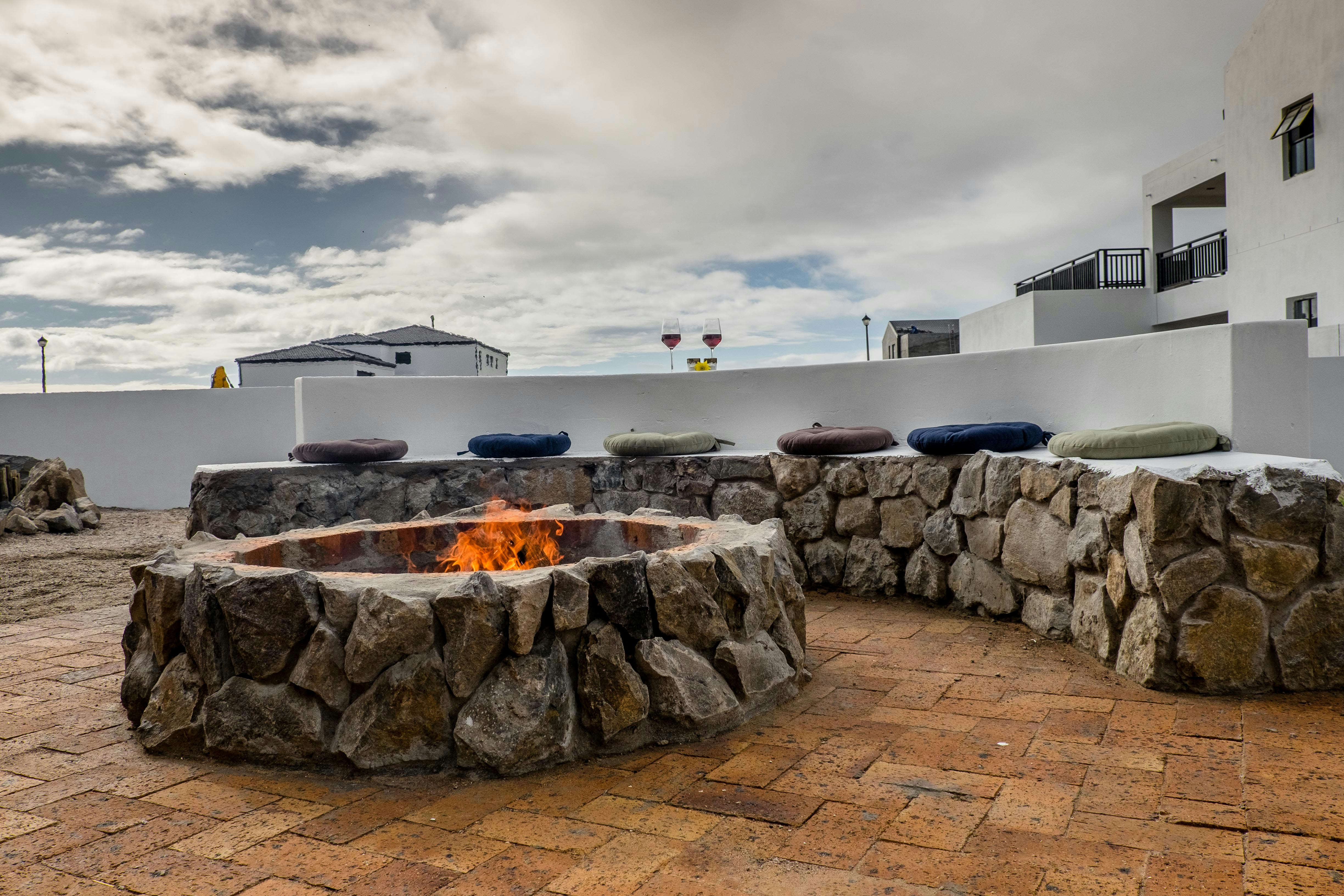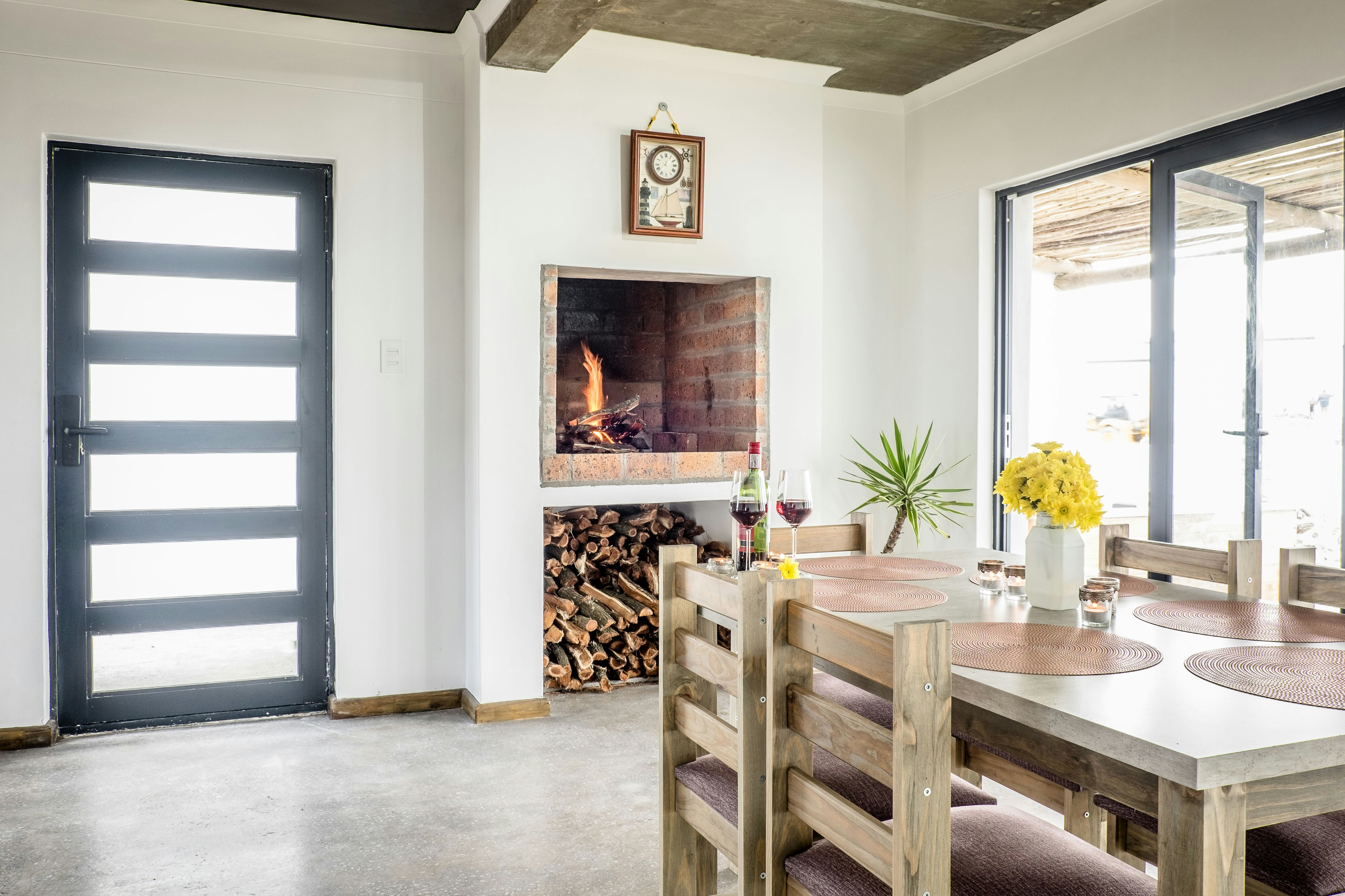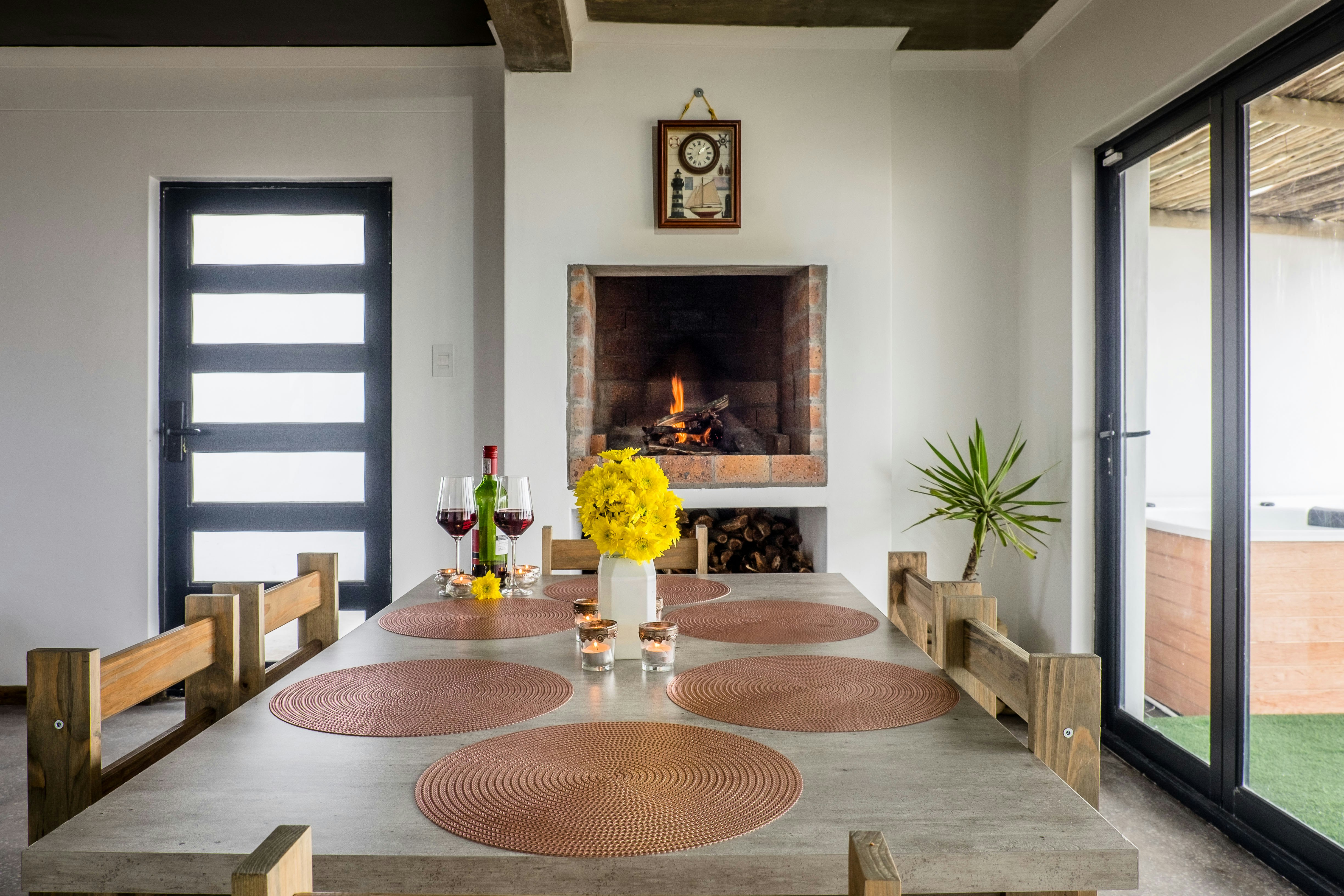 Downstairs, the open-plan kitchen is equipped with a fridge-freezer, gas stove, oven, microwave, and dishwasher. The living area features a comfy lounge suite, a TV, a 6-seater dining table, and a built-in fireplace that doubles as a braai area. The house opens onto a lovely patio that boasts a luxury spa Jacuzzi and leads to an outdoor boma. Parking is provided off Street. There is A single garage which also has a laundry room and storage space for bicycles and fishing rods.