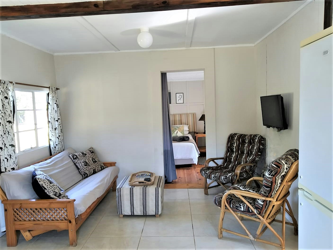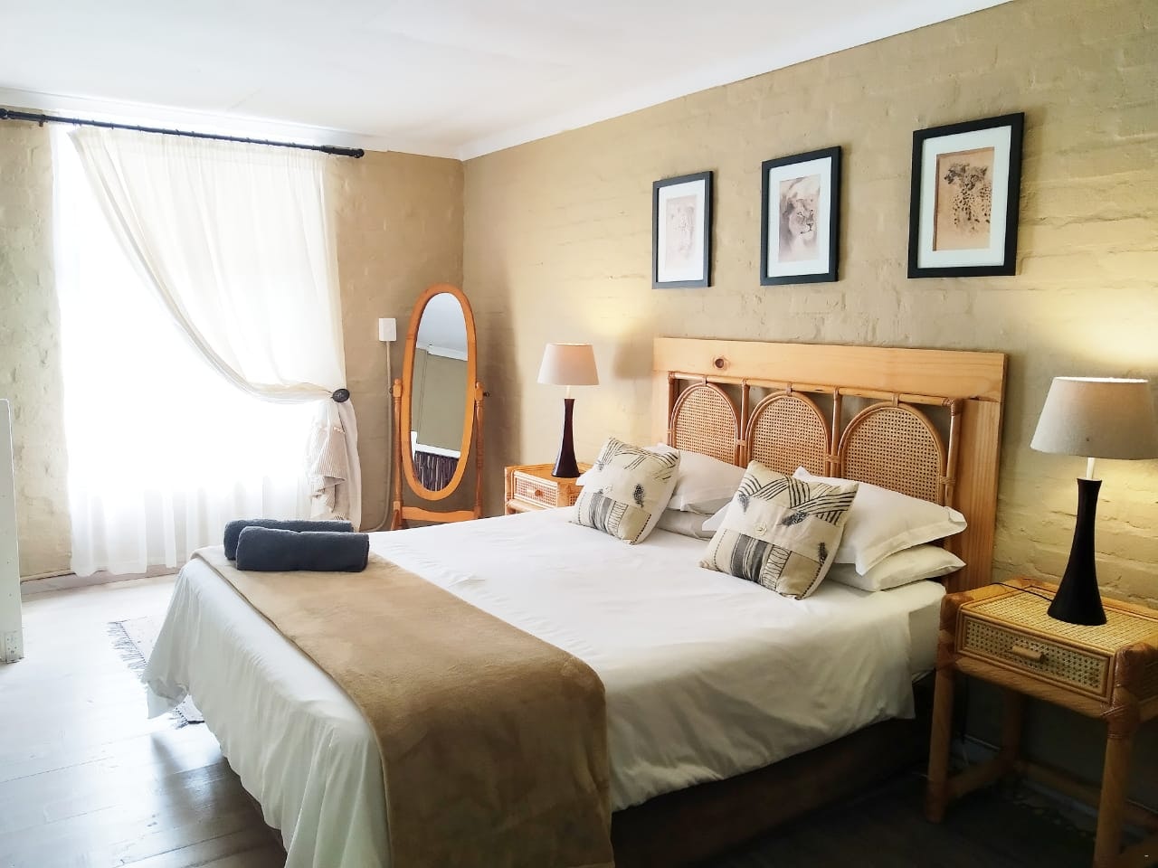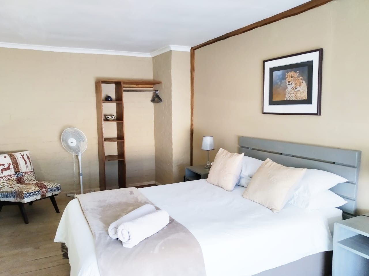Self-Catering Five - The Cottage is a pet-friendly unit featuring its own fenced garden, making it suitable for larger dogs. The cottage accommodates 4 guests and comprises 2 bedrooms. The main bedroom is furnished with a queen-sized bed, while the second bedroom offers 2 single beds. The unit includes a bathroom fitted with a shower and a fully equipped kitchenette with a microwave, mini-oven, kettle, and family-sized fridge and freezer. Outside, guests can enjoy a table with four chairs and a kettle braai, providing a comfortable setting for outdoor dining and relaxation.