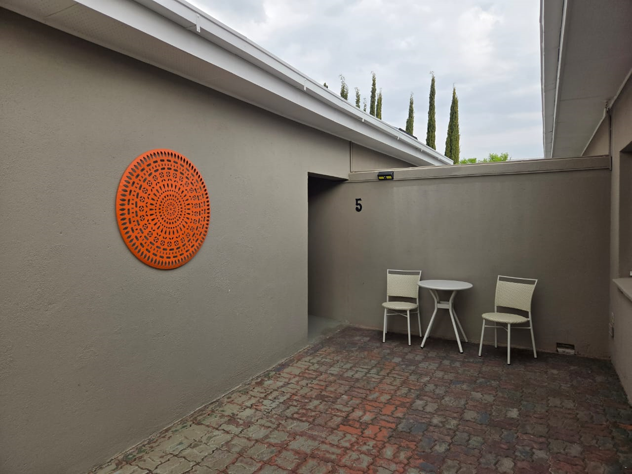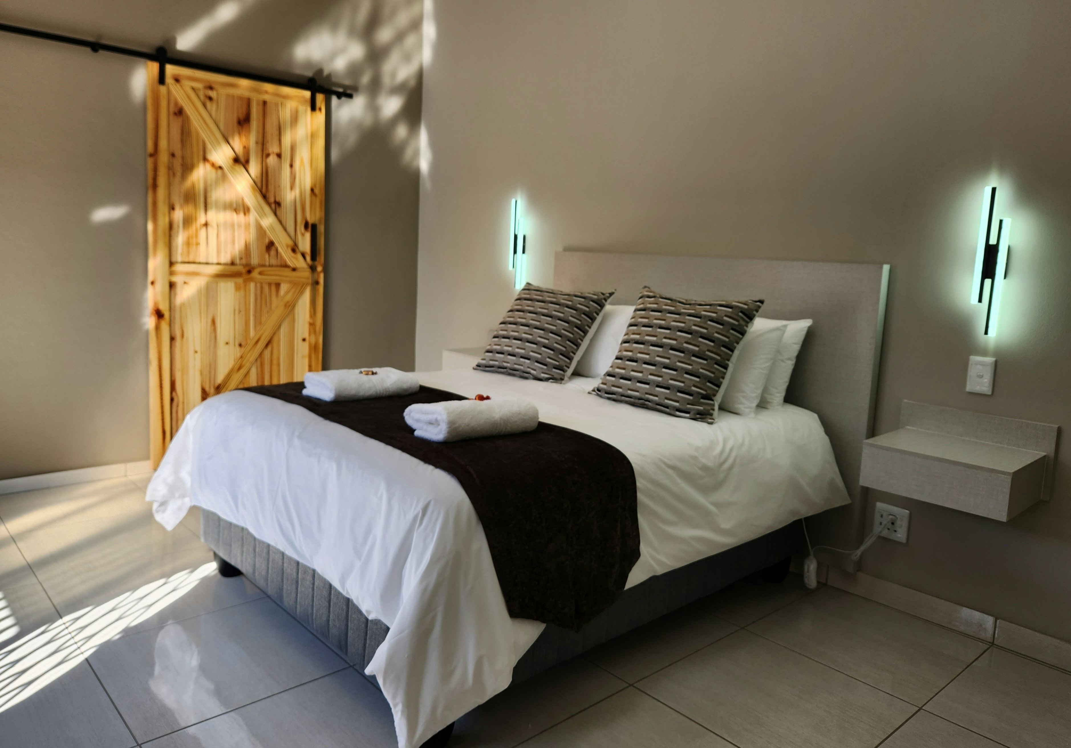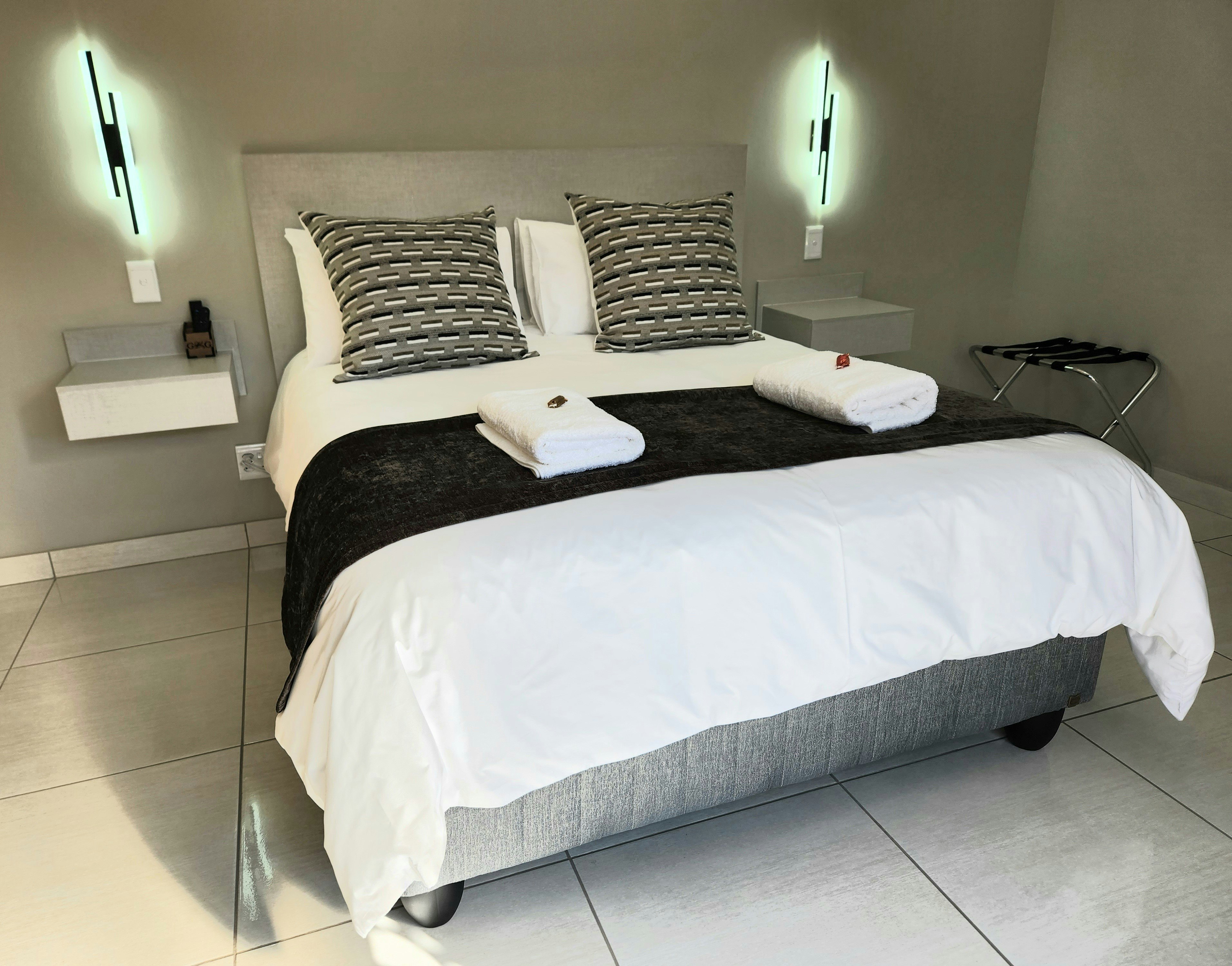 Accommodation comprises 5 bedrooms. These rooms are tastefully decorated and furnished with a queen-size bed and an en-suite bathroom fitted with a shower, basin, and toilet. Facilities included in these rooms are a working desk, air-conditioning, a bar fridge, a microwave, tea- and coffee-making amenities, towels, toiletries, as well as a hairdryer. Each room has DStv with all sports channels, free Wi-Fi, and a private patio and entrance. The guesthouse is fenced, and ample parking is available.
