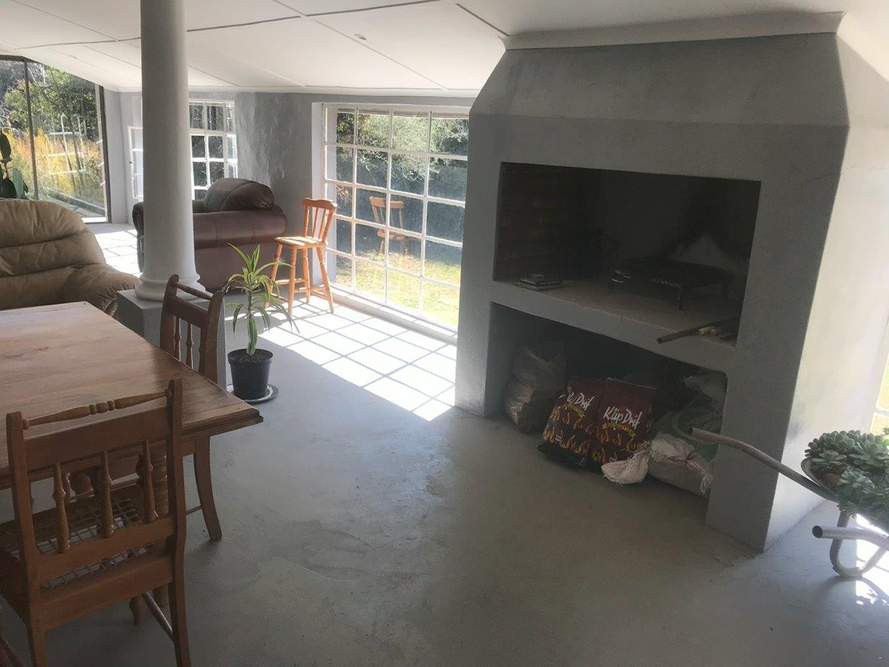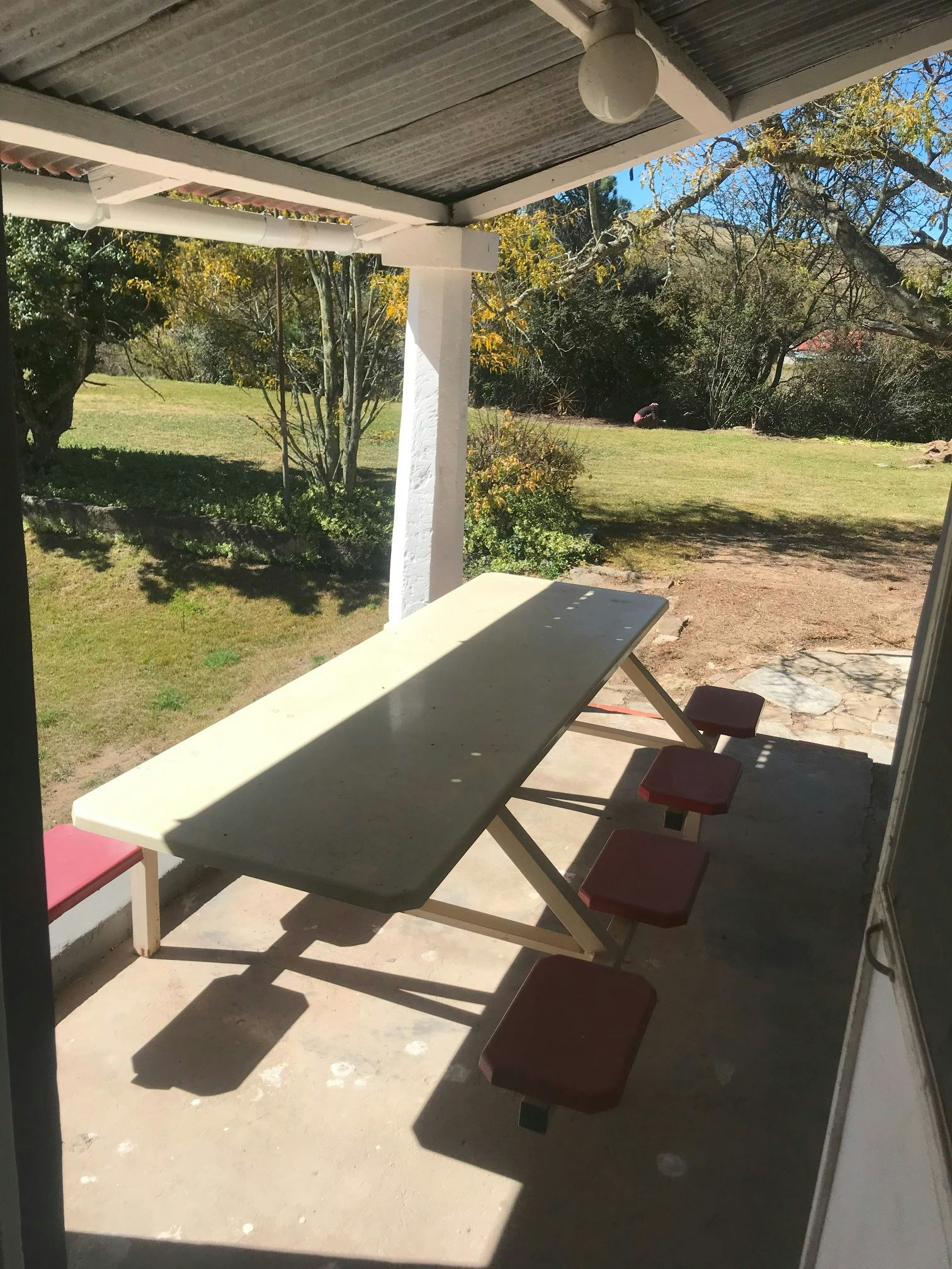 Buite is daar 'n stoep met 'n etenstafel, 'n rusbank en 'n gemeenskaplike braai-area.