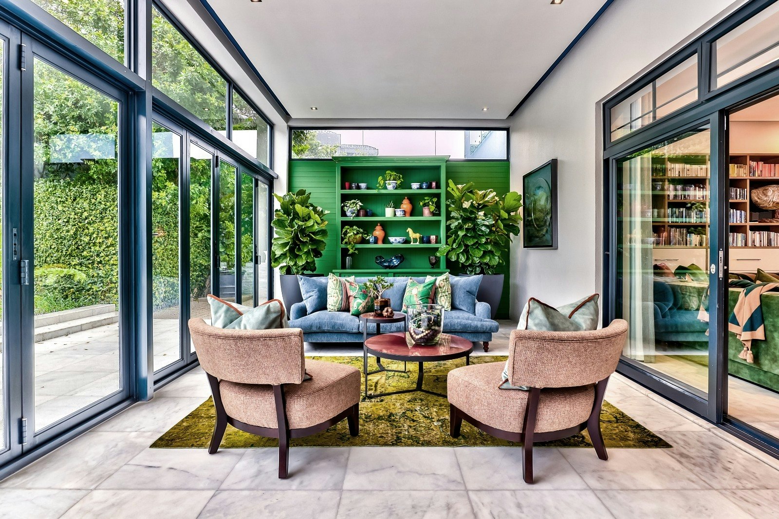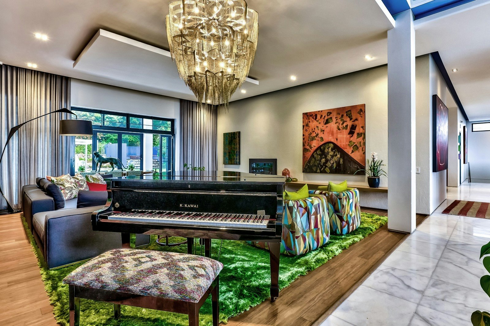 The kitchen is fully fitted for self-catering, and equipped with a stove, oven, fridge-freezer, microwave, cutlery, and crockery. The living area includes a dining table, comfortable seating, and a TV. The lounge and library take centre stage, featuring hundreds of books and prominent artwork.