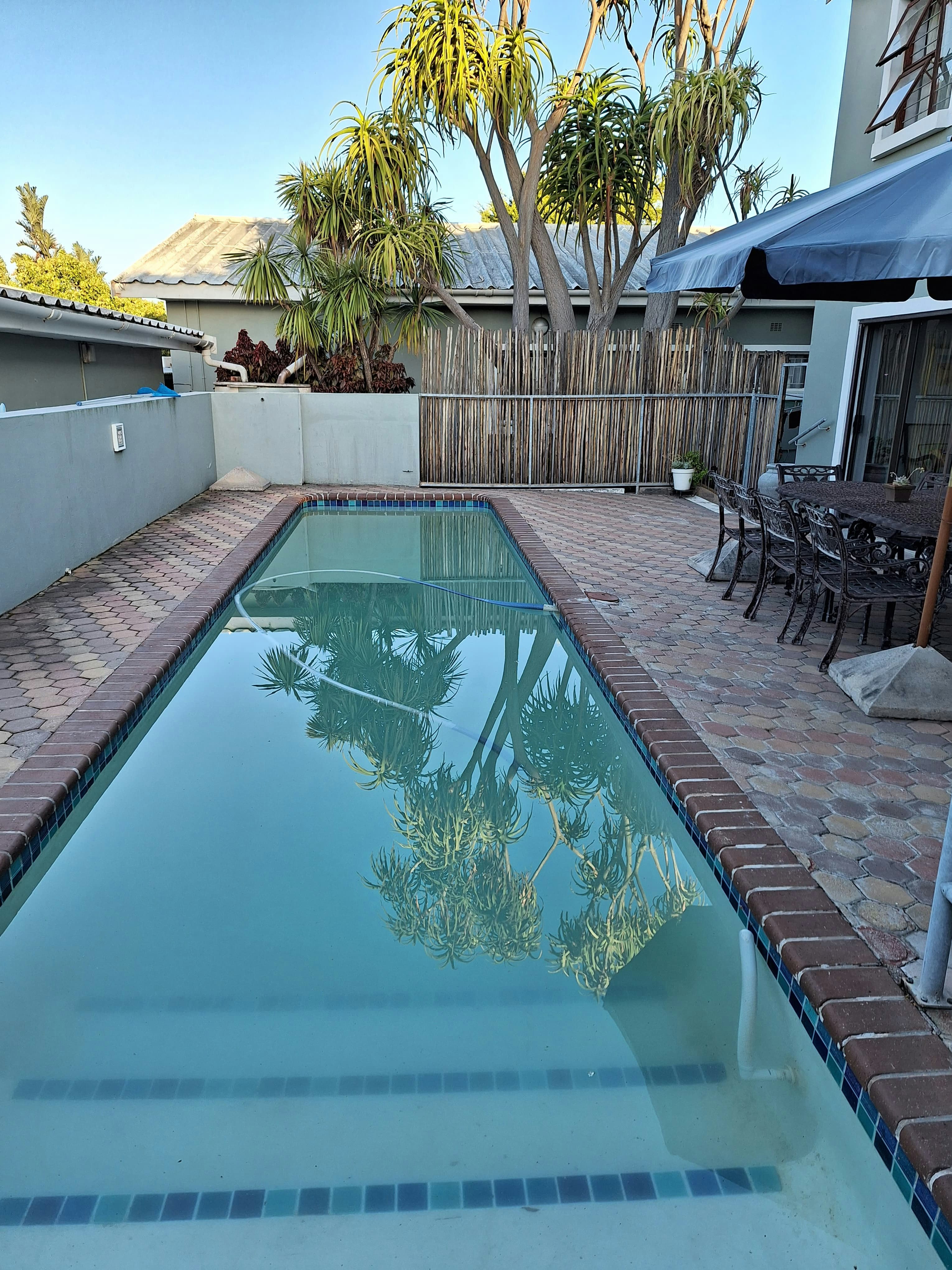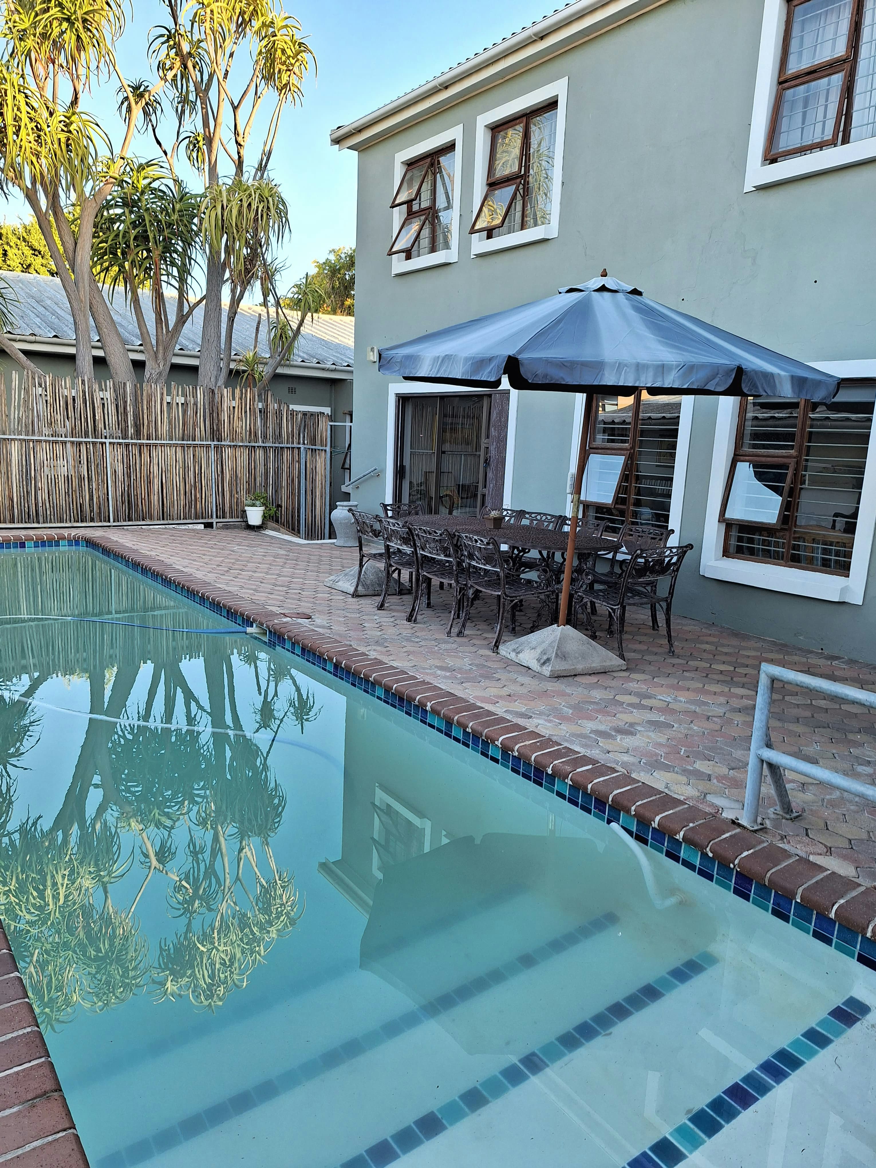 The kitchenette is equipped with a fridge, stove, microwave, and coffee machine. The living area features a comfy seating area, a TV, and a dining table seating 6 people. It opens onto a patio with a swimming pool. Guests can enjoy a braai and alfresco meal on the patio.