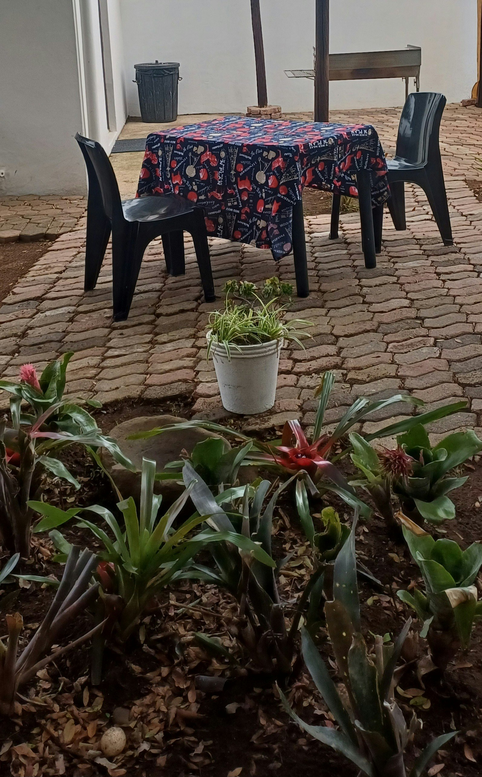 The Apartment is a neat, private flat located at the back of the property with its own entrance, undercover parking, and a private outdoor braai area. The apartment comprises 1 bedroom furnished with 2 single beds. The bathroom is fitted with a shower, basin, and toilet. The kitchenette is equipped with a fridge-freezer, microwave, kettle, and a 2-plate stove with oven. A small dining table with seating for 2 is available. The unit has a Smart TV.