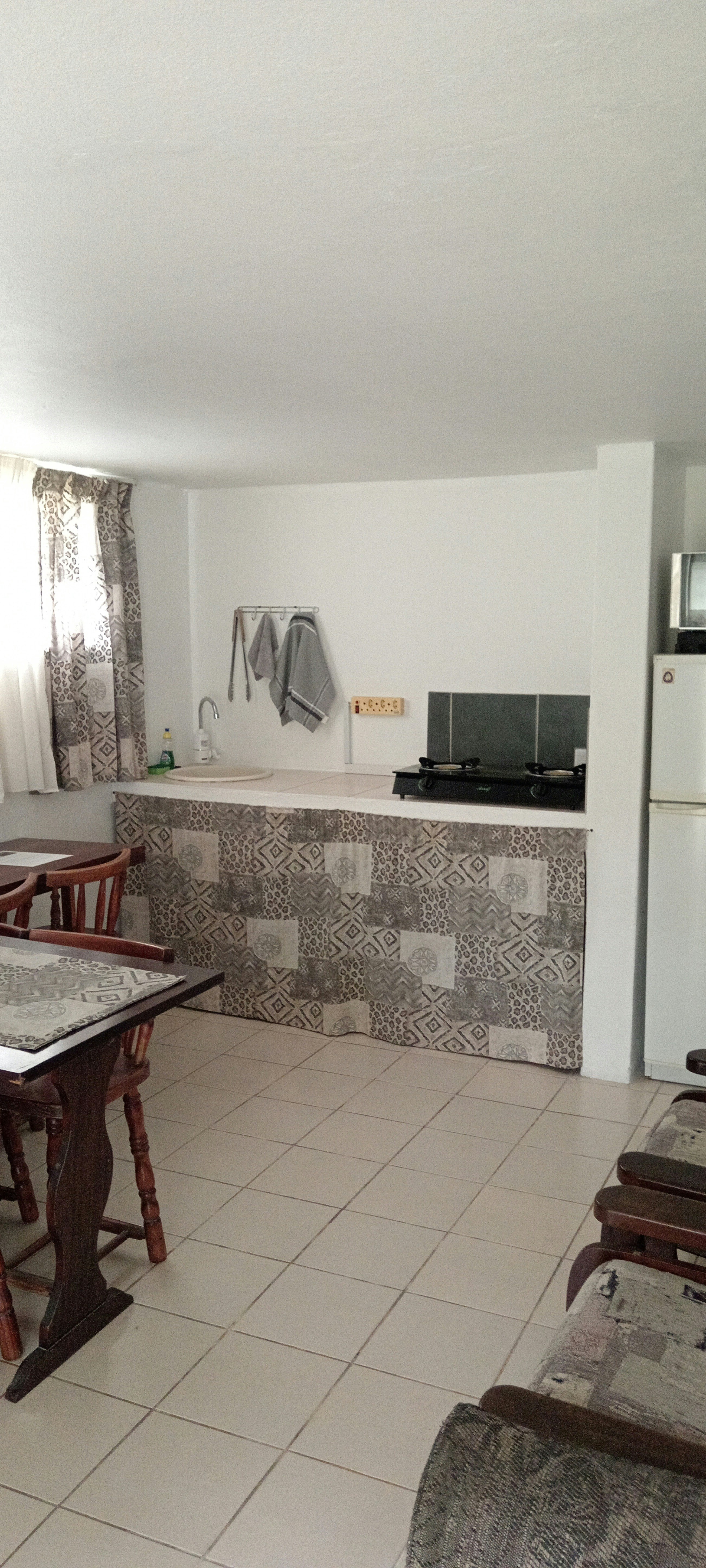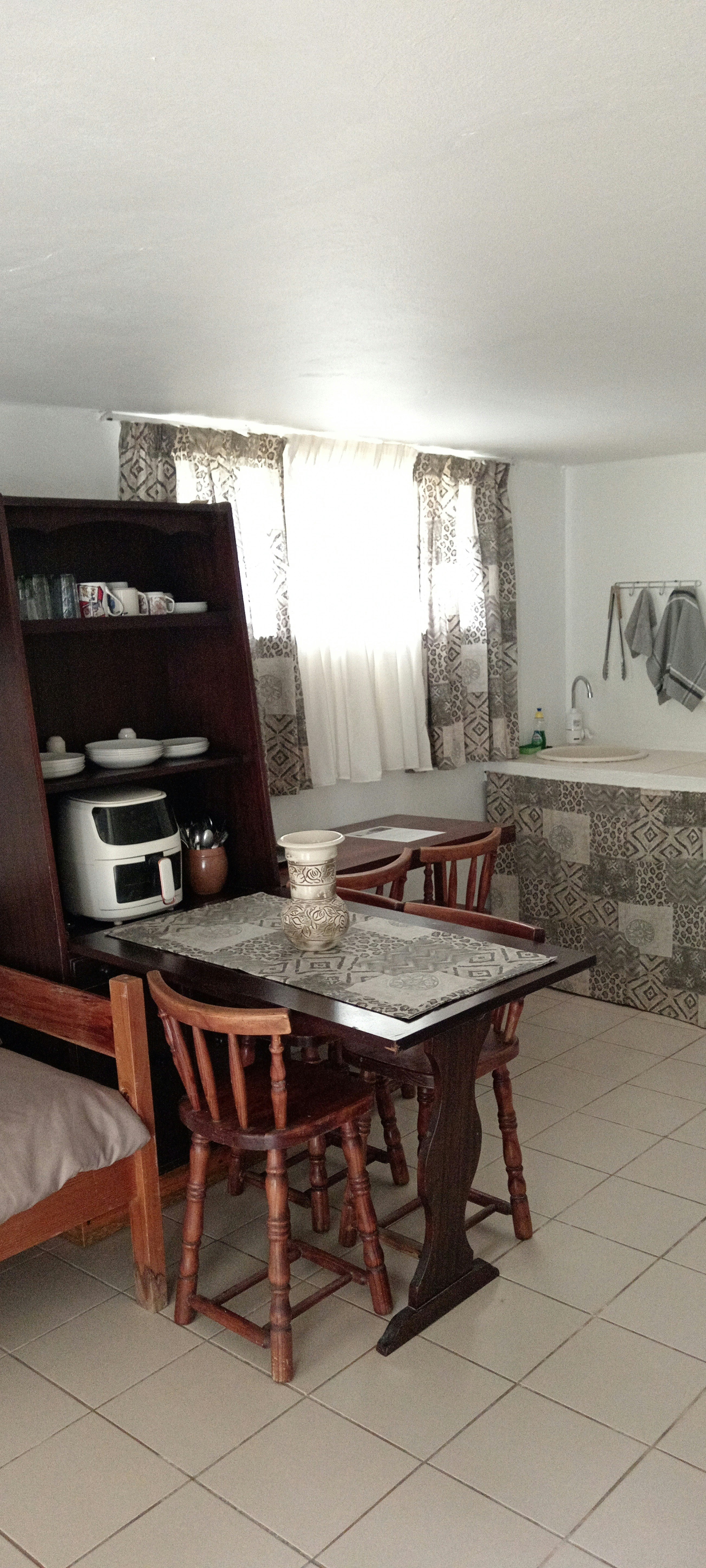 The kitchen is equipped with a fridge-freezer, stove, microwave, basic cutlery, crockery, and tea- and coffee-making facilities. It features a centrally located dining table where guests can enjoy their meals. The main bedroom has a TV with comfortable couches. Complimentary Wi-Fi is available.