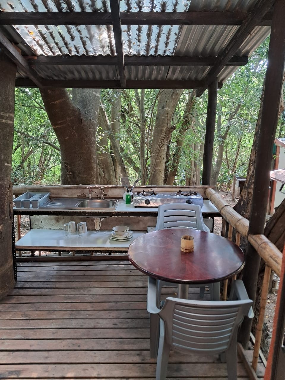 Set within an idyllic, deeply shaded, and cool oasis of greenery, the sustainably built and eco-wise range of accommodation includes tastefully appointed en-suite chalets, wooden cabins, roofed dome-tents each with a private verandah and braai area, 5-sleeper and 7-sleeper family cabins, a travellers' dormitory, and camping sites.