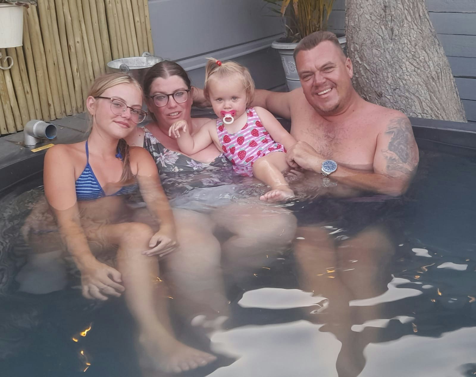 Guests have access to a lovely outdoor area with seating, a braai area, a splash pool, and a wood-fired hot tub perfect for relaxing and spending quality time together.