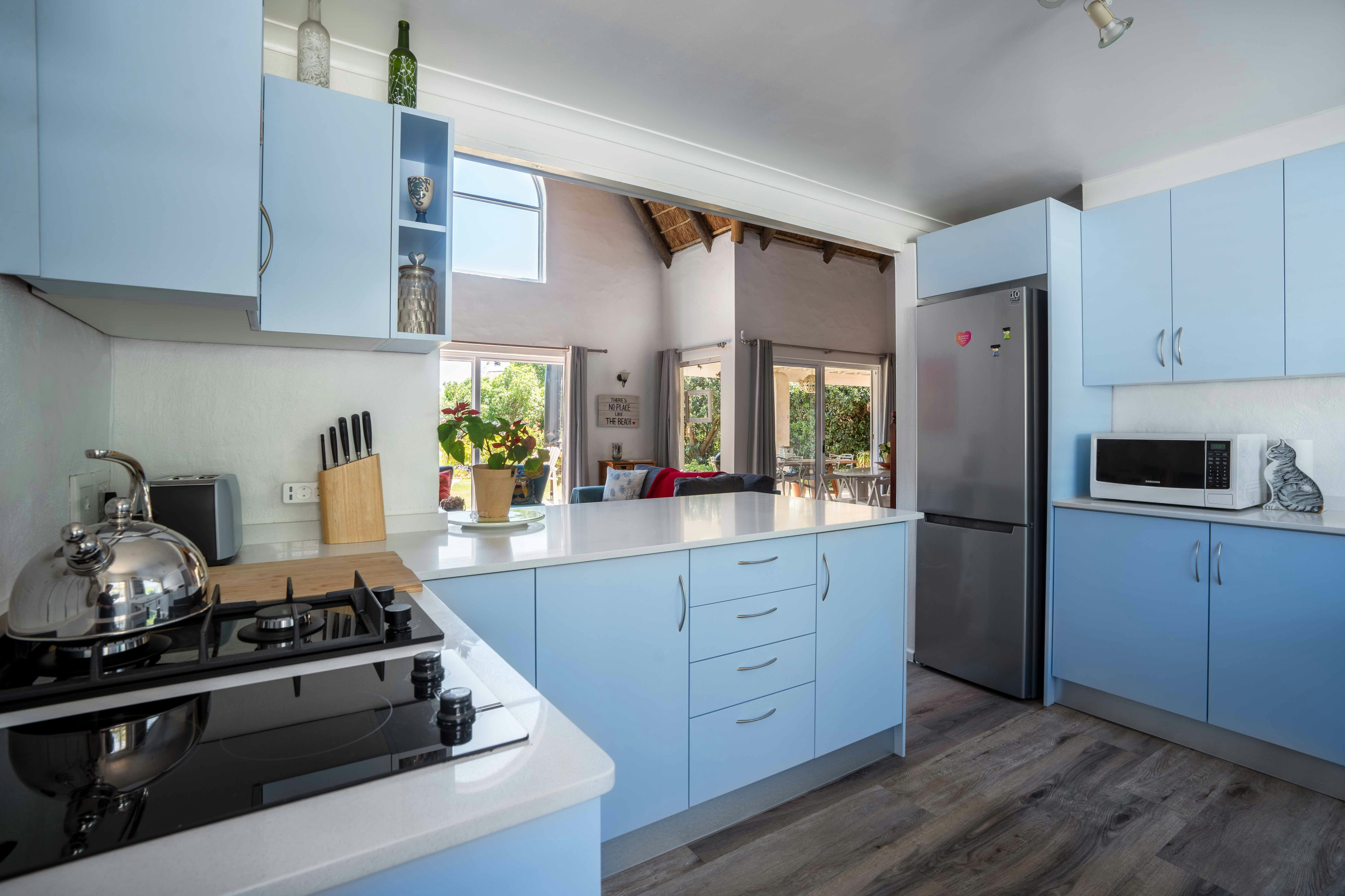 The house has an open-plan kitchen and lounge with a lovely fireplace. The lounge opens up onto an indigenous garden, which is peaceful and idyllic, attracting a variety of birdlife. The kitchen is equipped with a fridge, an oven, a gas hob, a gas and electrical stove, a microwave, as well as a dishwasher and a washing machine. The lounge has a TV with DStv, Netflix, and YouTube. Wi-Fi is available. The property also has an inverter and backup power system in case of load shedding, as well as rechargeable lights.