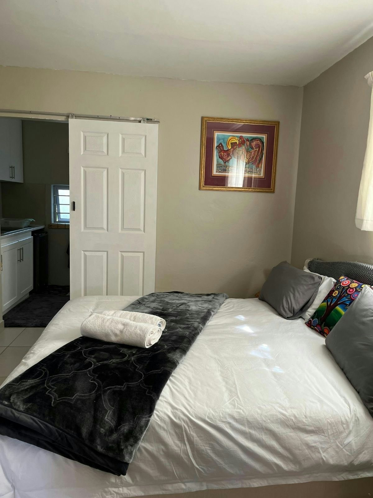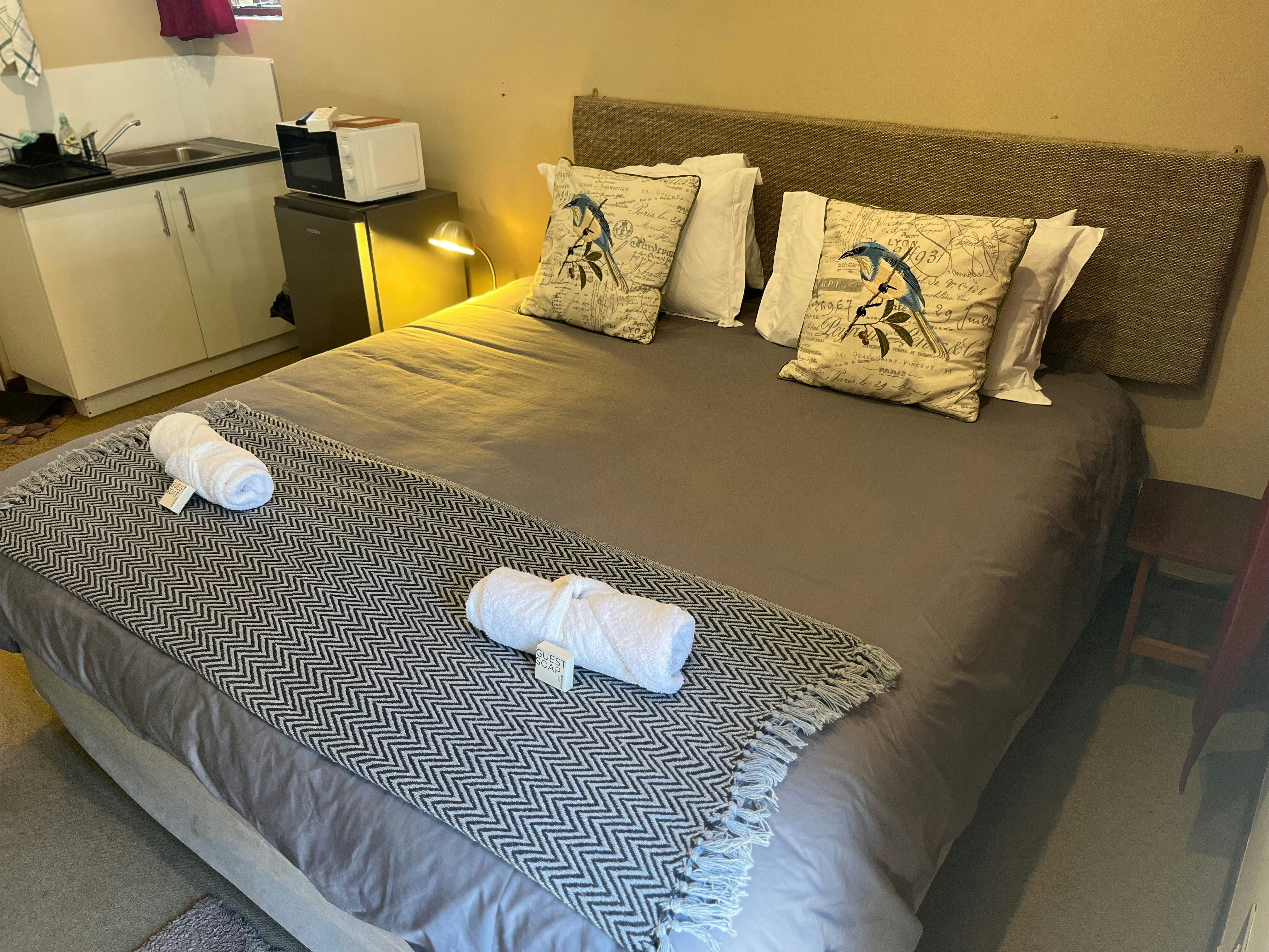 The open-plan apartment is ideal for 2 guests and features a king-size bed, a wall-mounted TV, and an en-suite bathroom fitted with a shower, basin, and toilet. Quality linen and bath towels are provided.