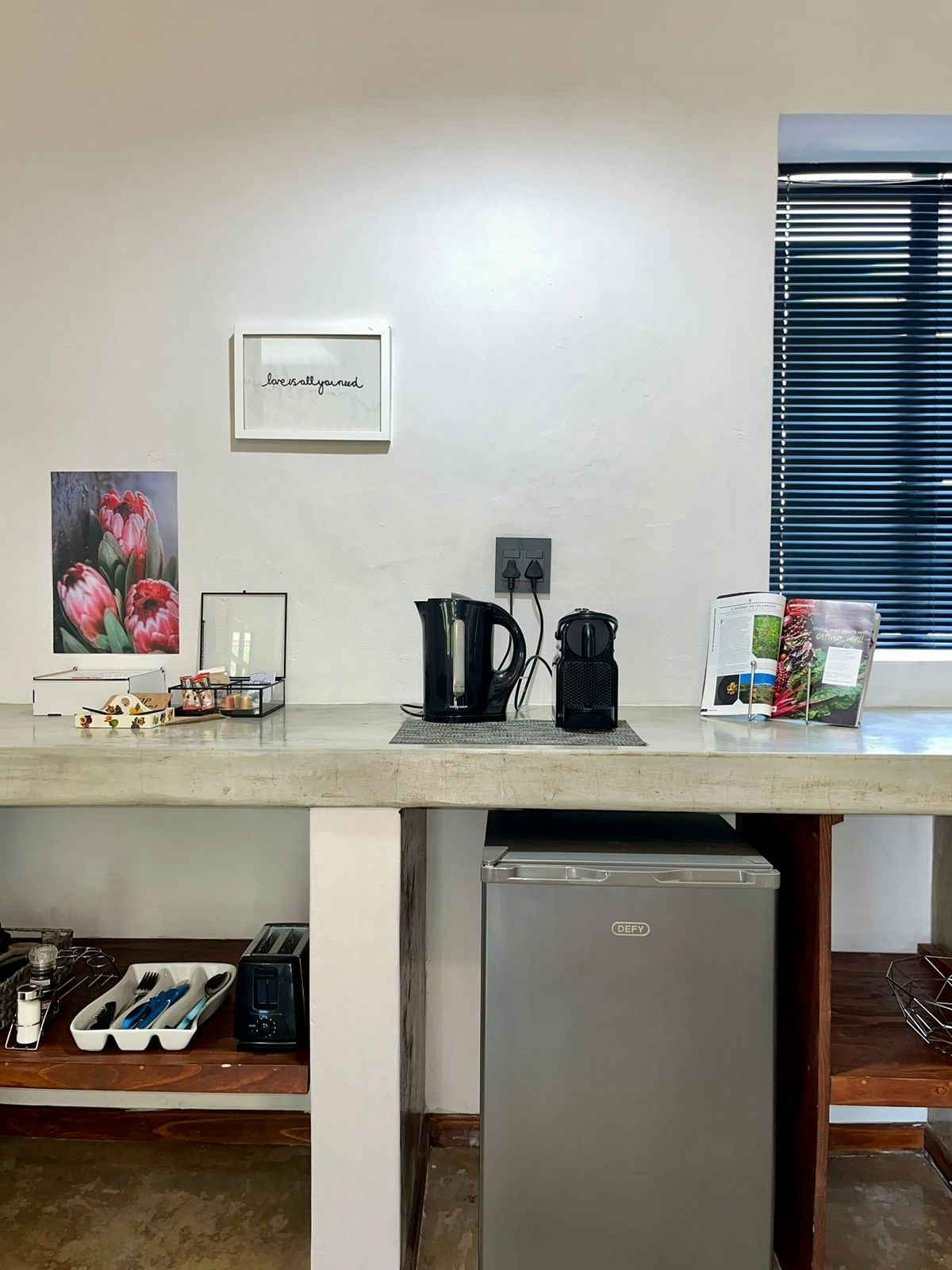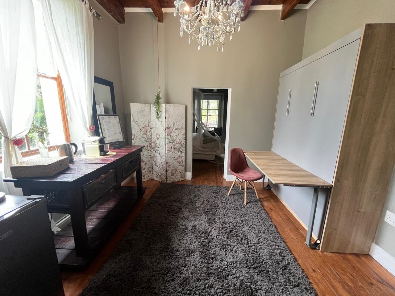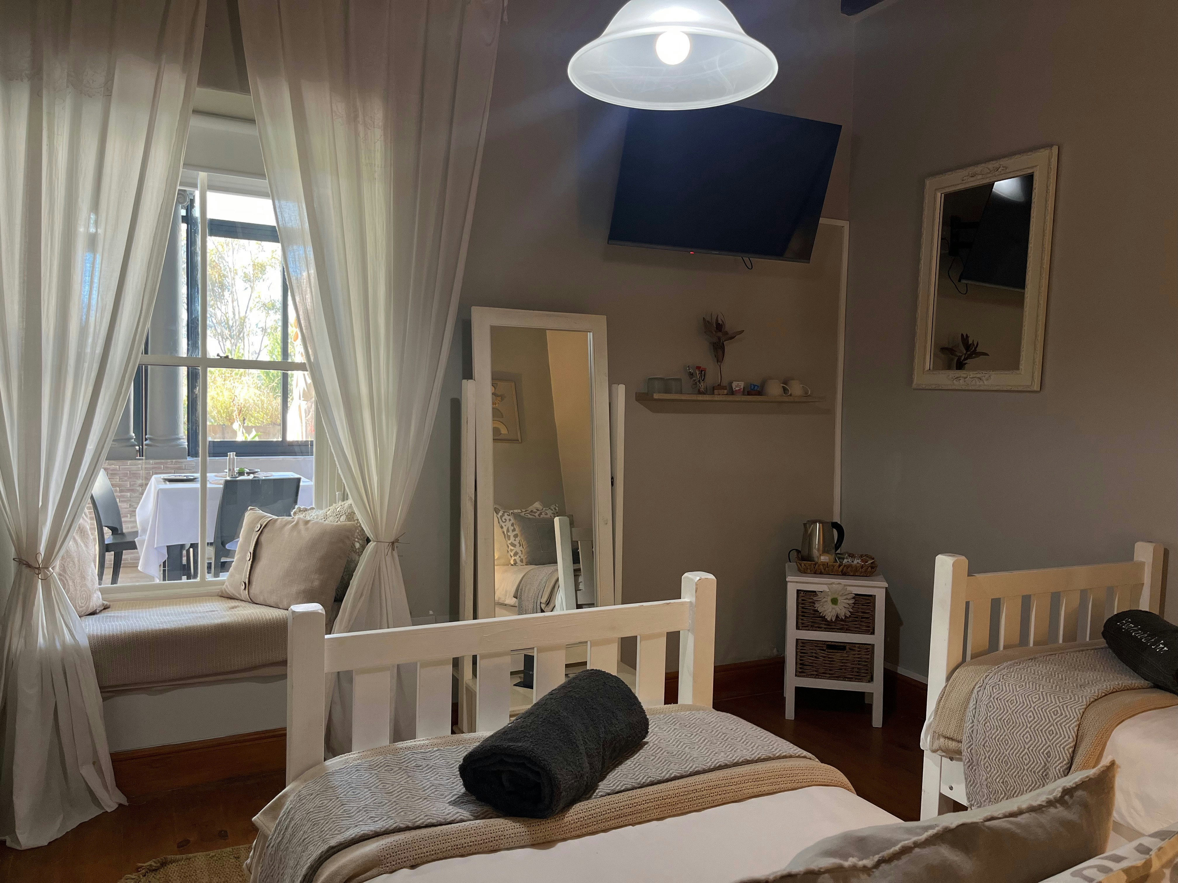 The Superior unit comprises 2 separate rooms. A main room furnished with a king-size bed and a second room with 2 single beds. Both rooms have coffee stations, and the main room includes a bar fridge. This unit has private access to most of the guesthouse, including a lounge with a fireplace and a basic kitchenette with a microwave and basic kitchenware. Guests have access to an indoor braai area if the Deluxe room is not booked.