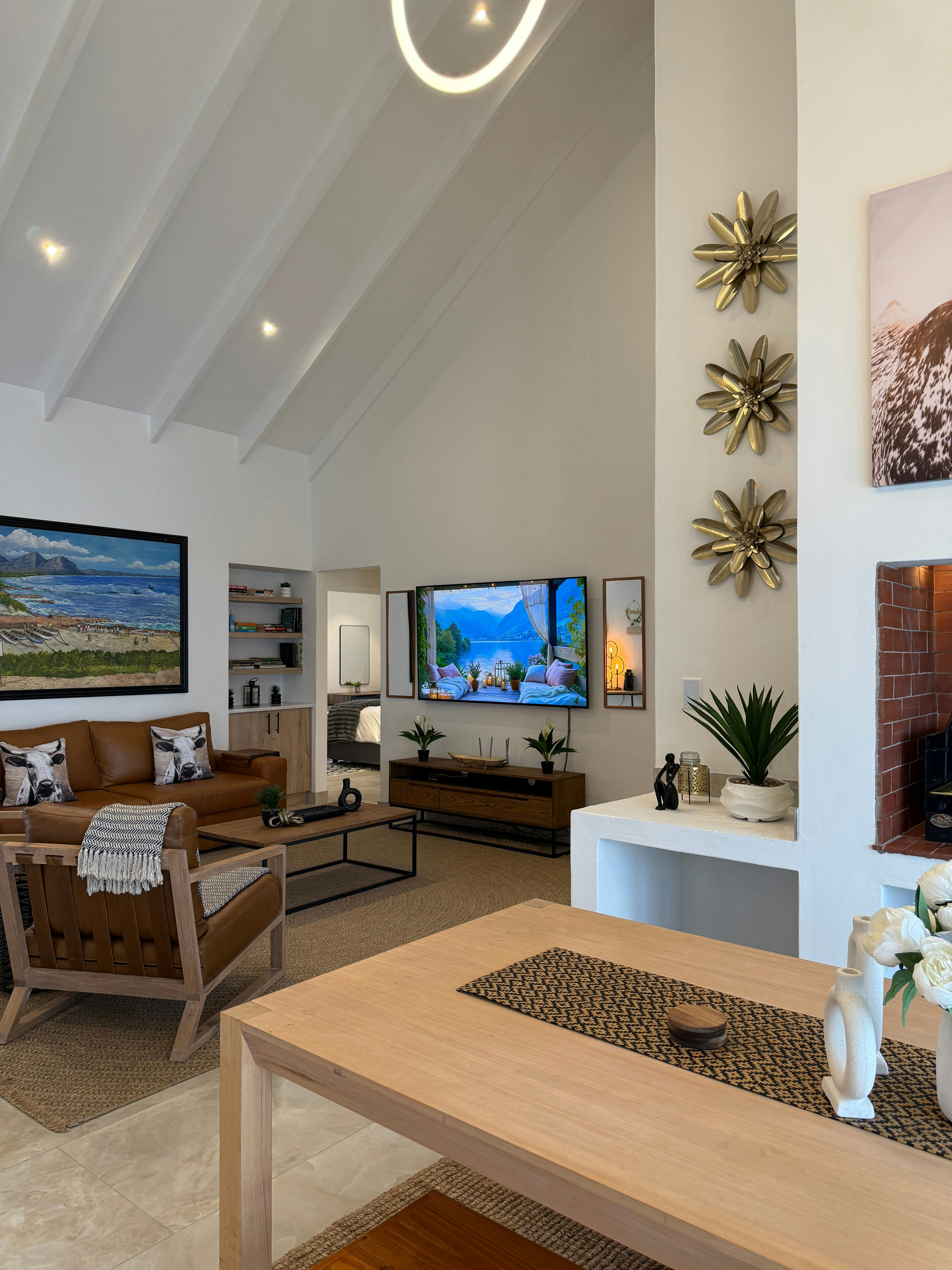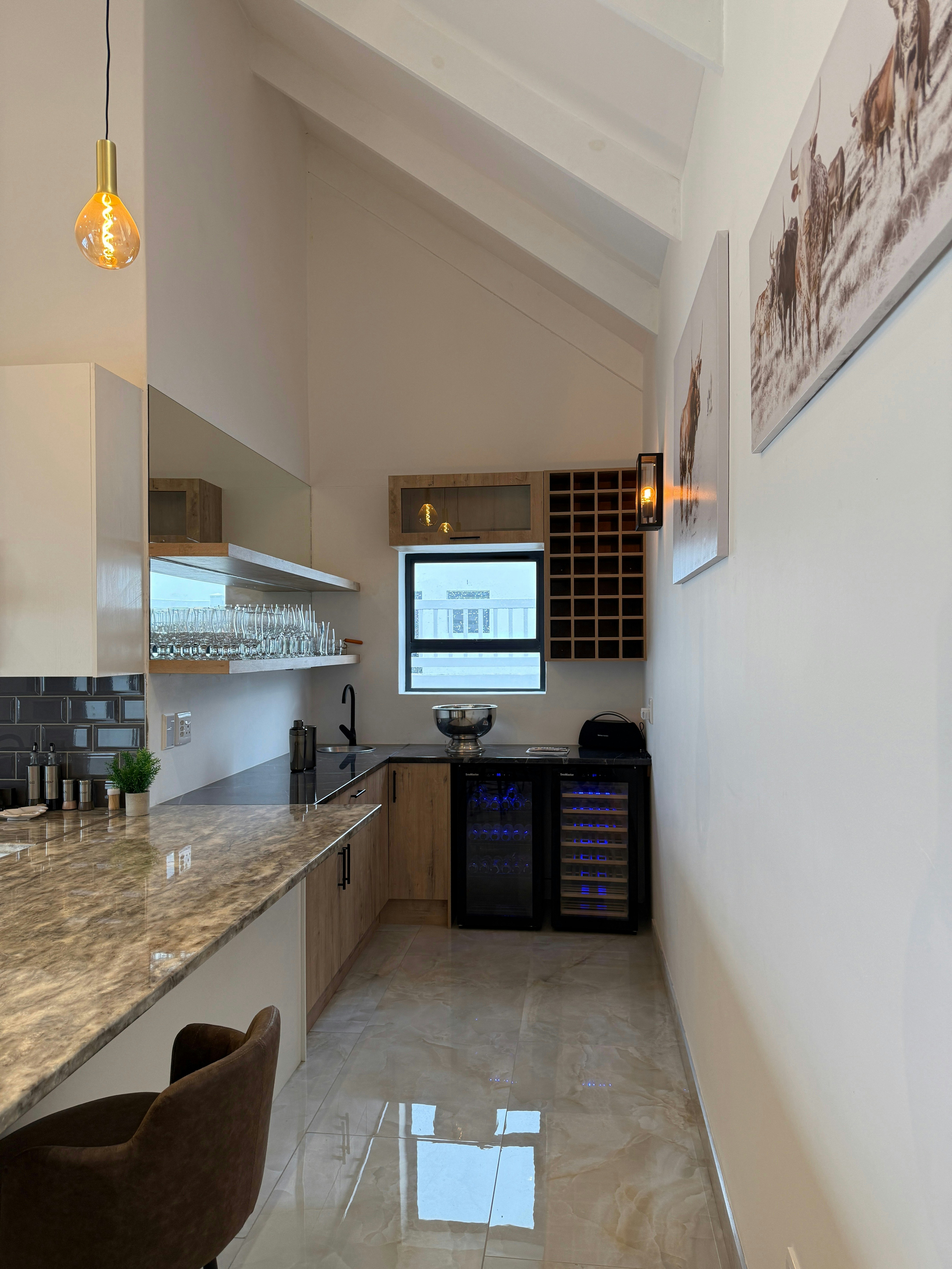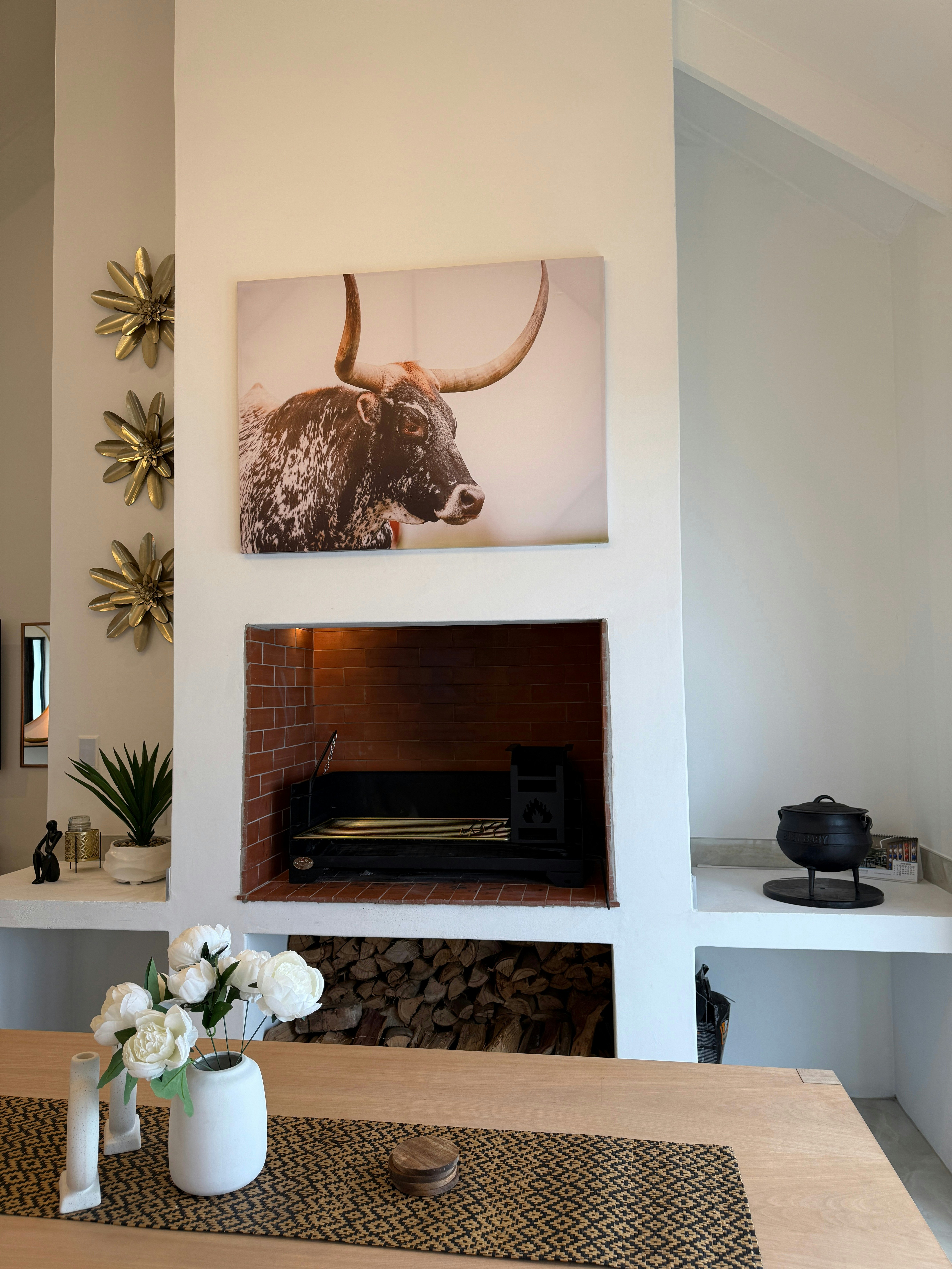 The open-plan living area boasts tall ceilings and a kitchen that is fully equipped with a stove, oven, microwave, fridge-freezer, cutlery, and crockery, as well as a breakfast bar with stools. Adjacent to the kitchen is a 6-seater dining table and a cosy lounge with an indoor braai and comfortable seating. For entertainment, a Smart TV with Netflix and Wi-Fi access are available.