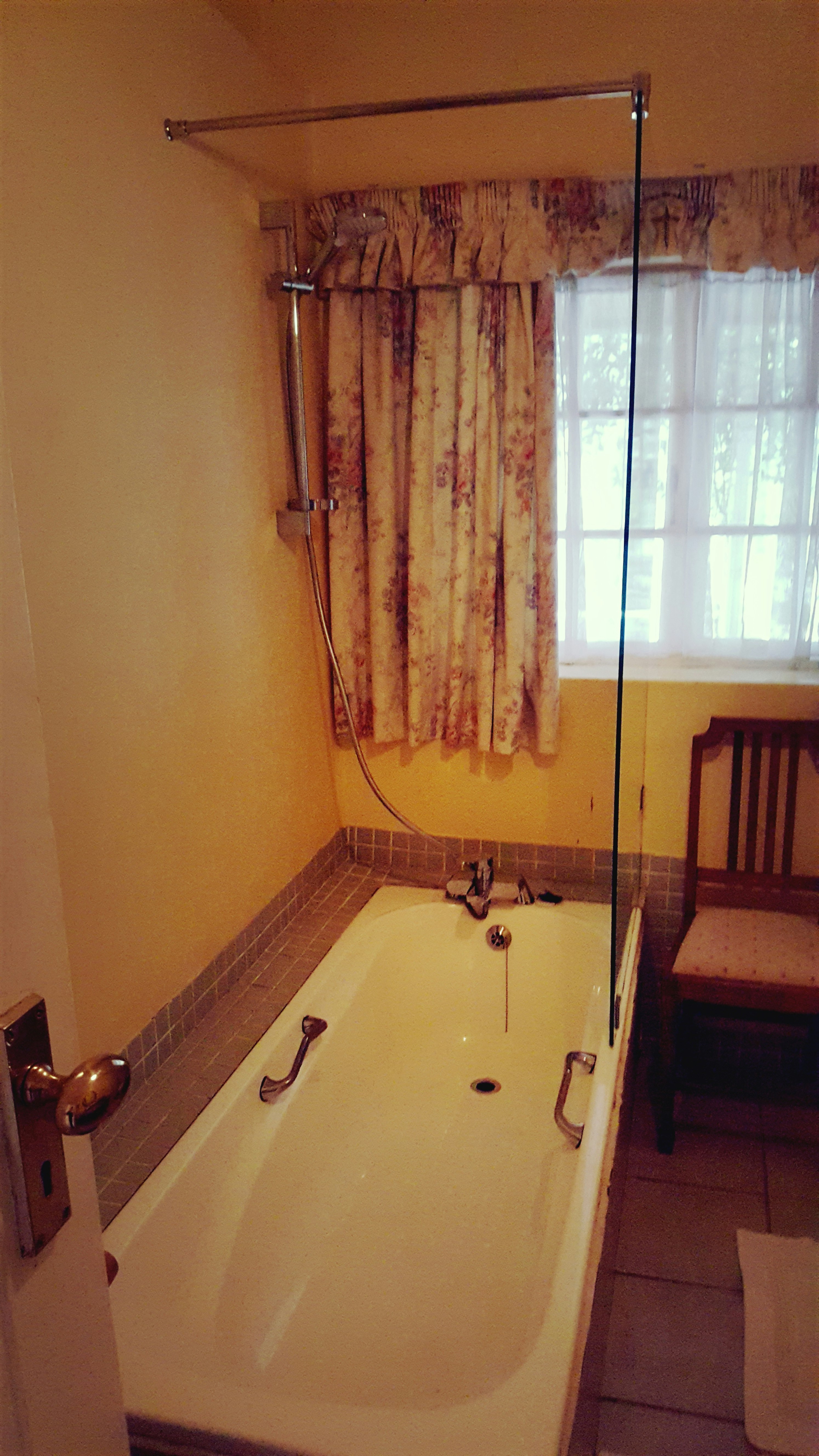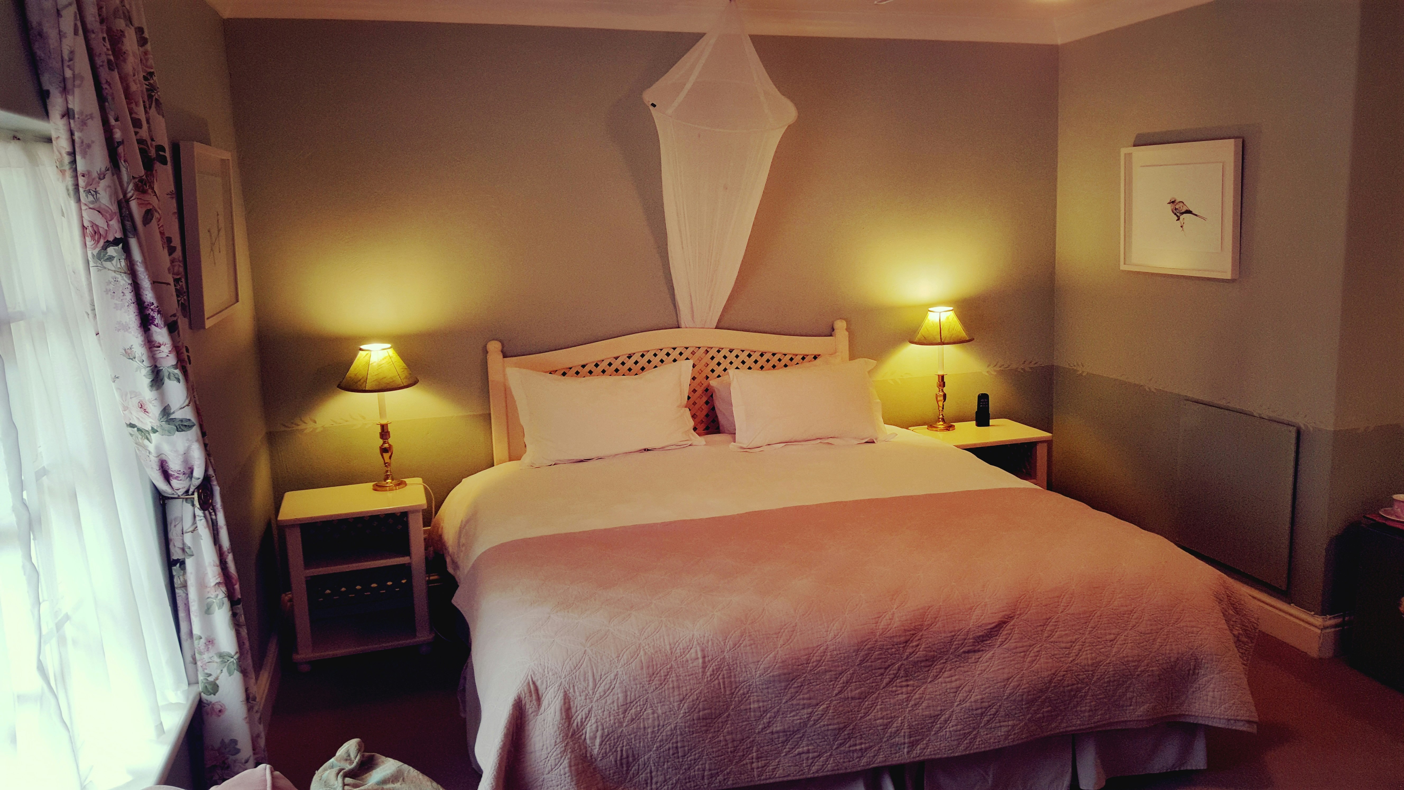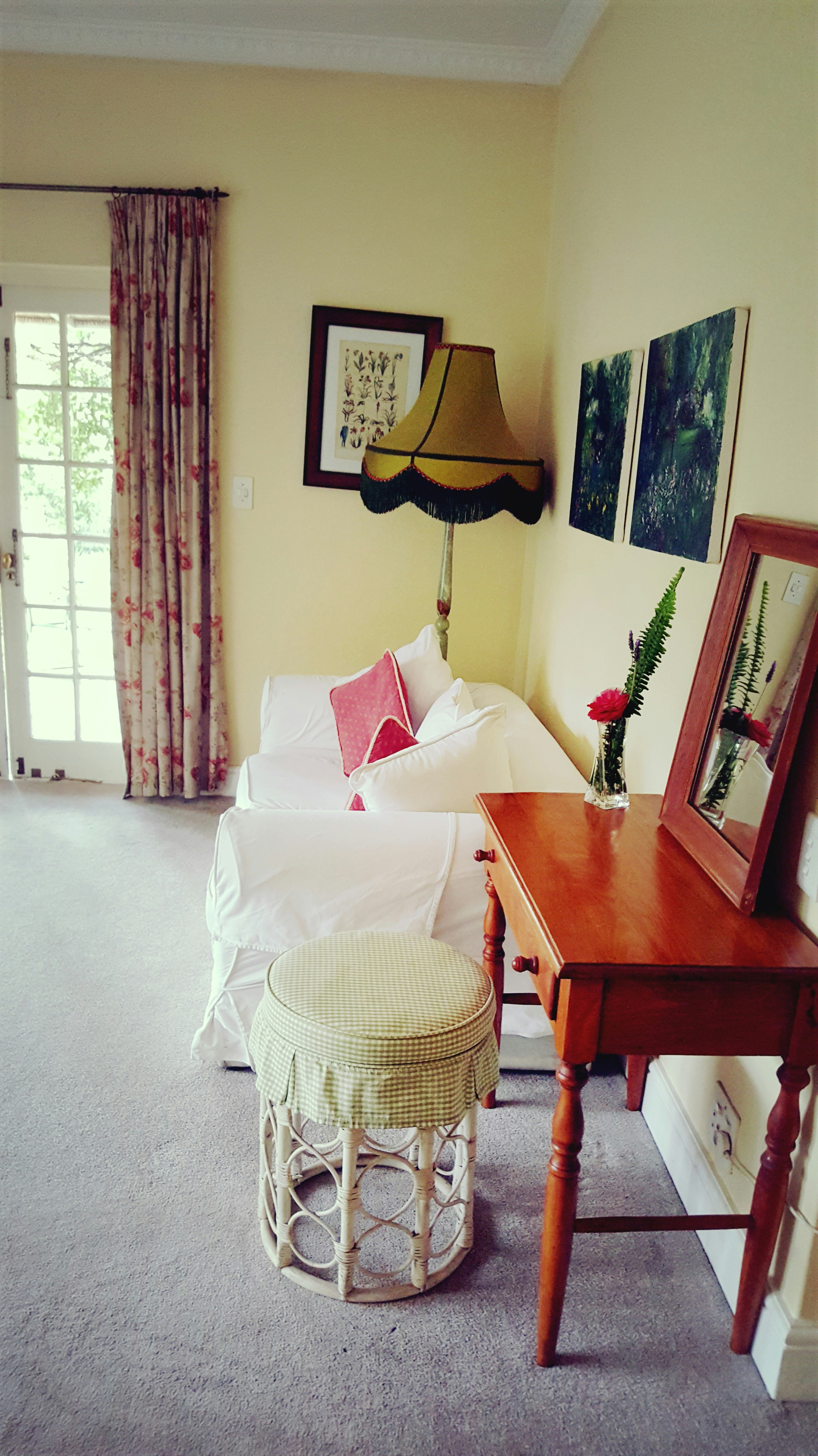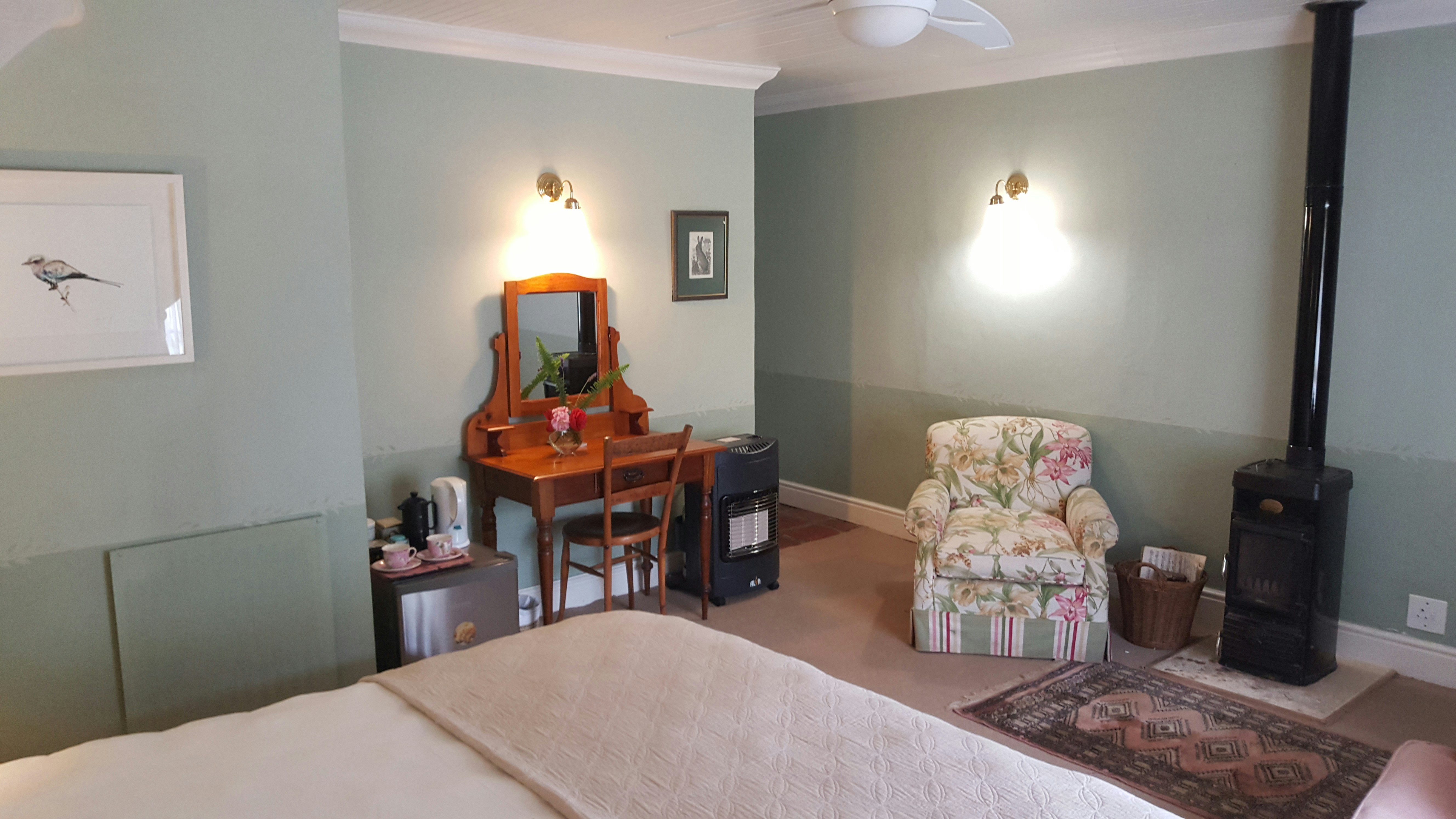 Lily is a large room that contains an extra-length king-size bed that can be converted to 2 single, satellite TV, armchairs, and a bookshelf around fireplace plus a lovely seated bay window area in sitting area. The en-suite bathroom contains a bath only with hand-shower. The room features a wood burning fireplace, heaters and fan, tea- and coffee-making facilities and little fridge in the room. Lily has a private verandah looking out over the woodland and flower gardens.