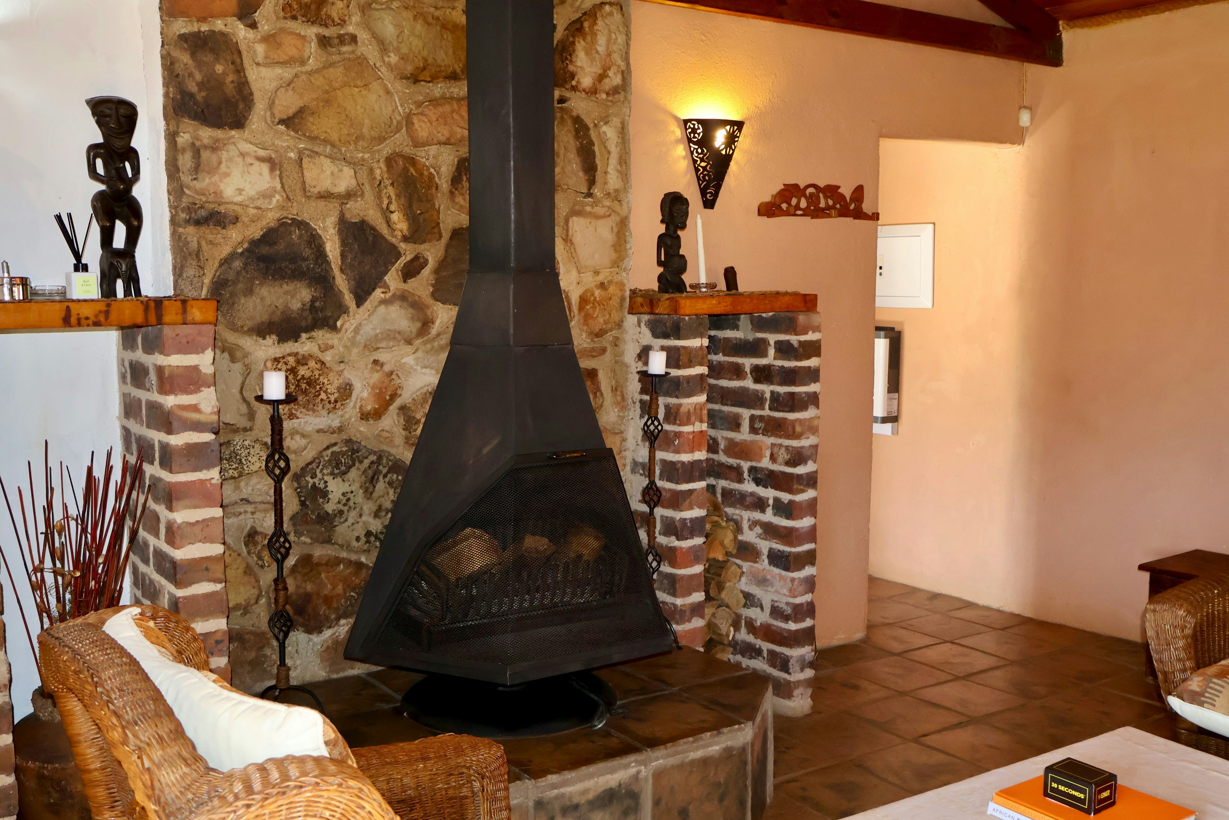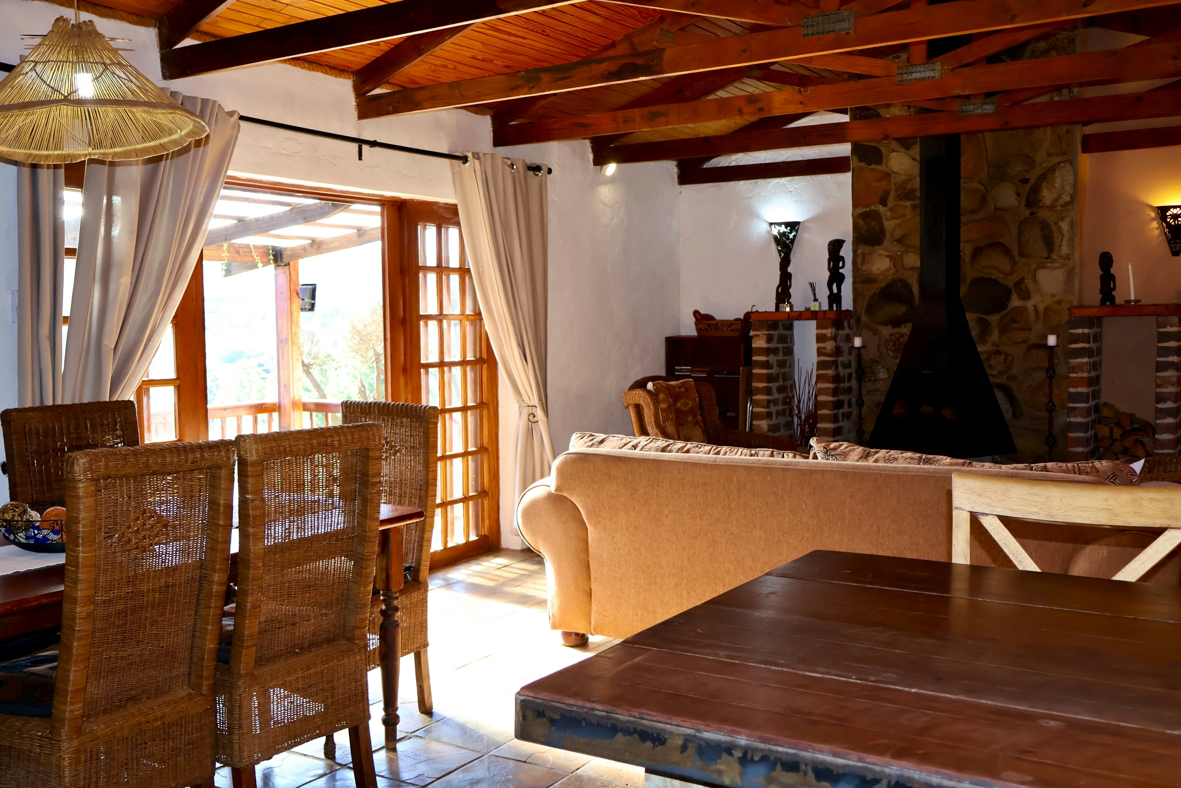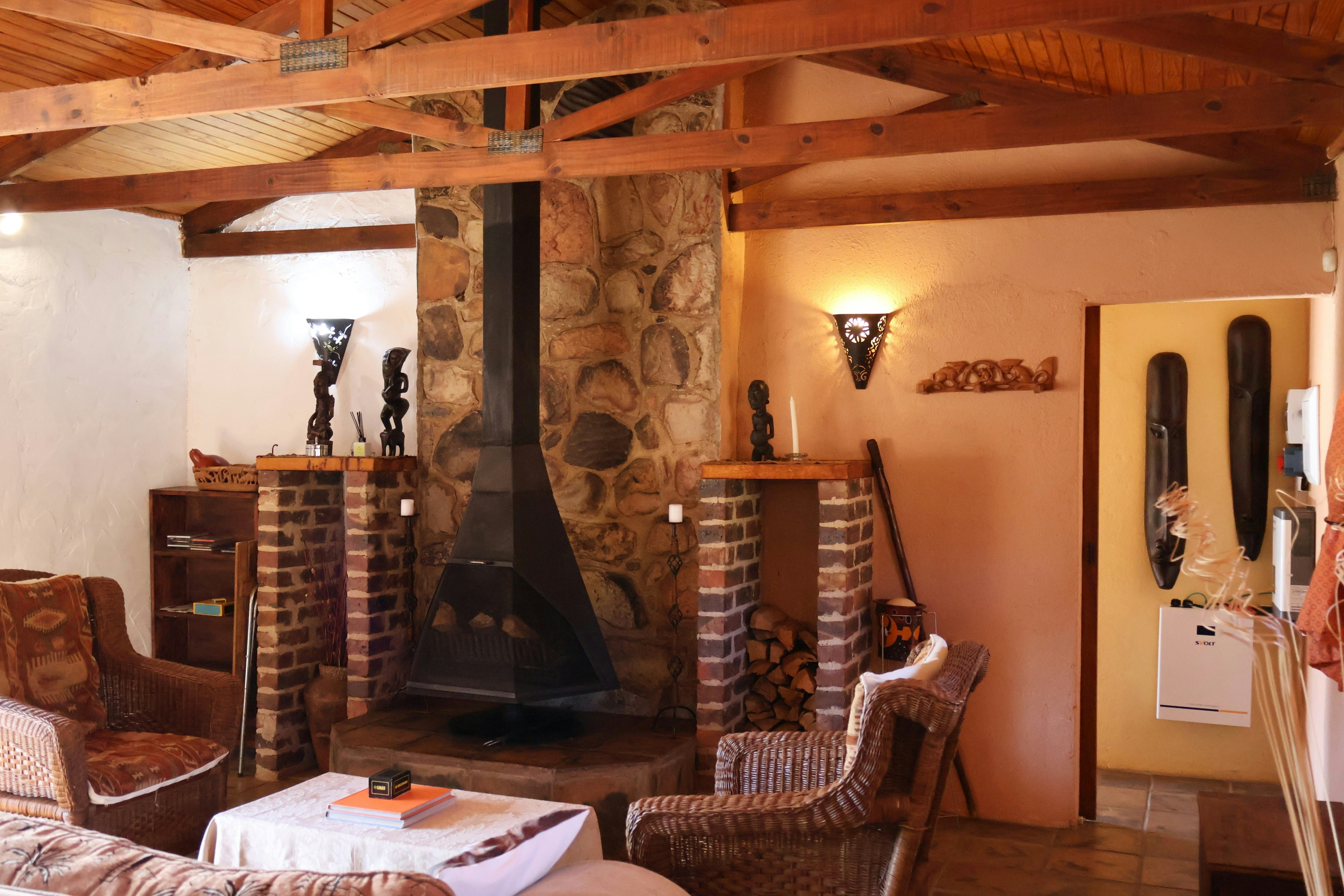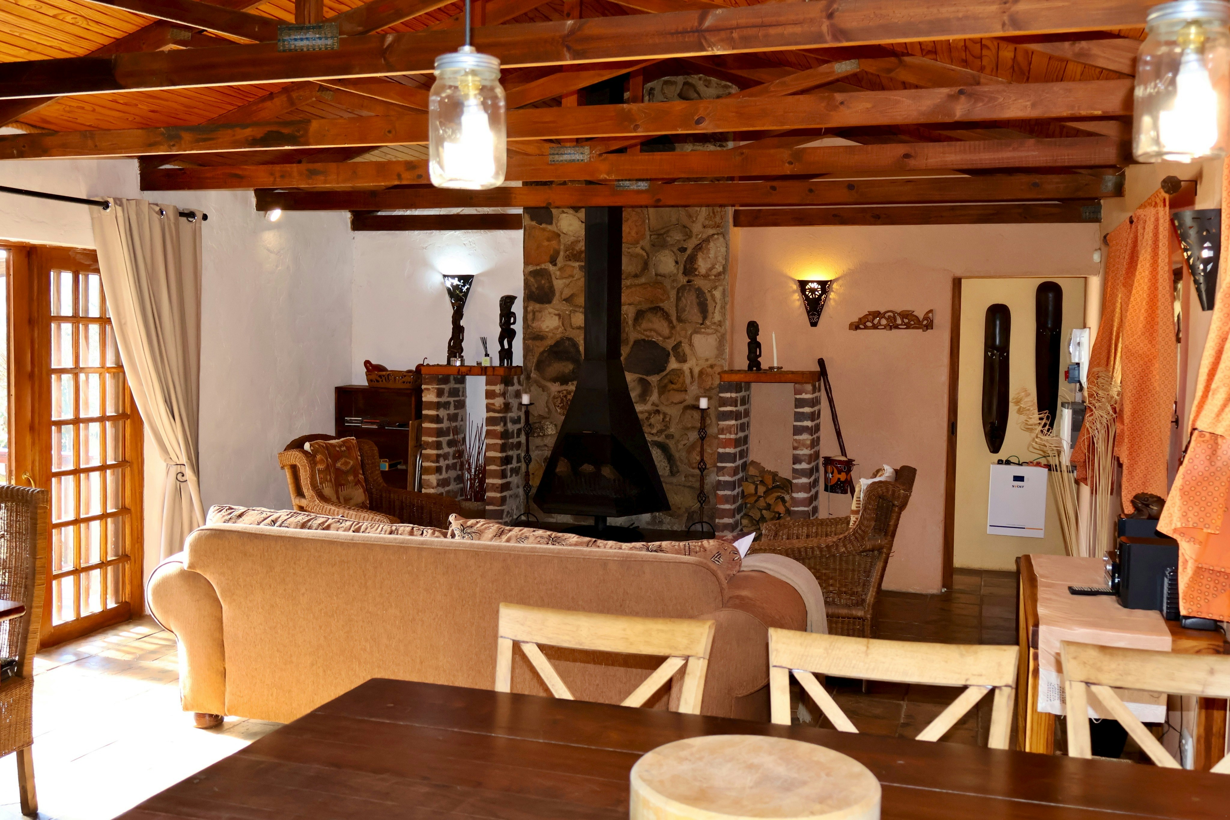 The kitchen is equipped with a fridge, stove, oven, microwave, cutlery, crockery, and tea- and coffee-making facilities. There is a centrally located dining table with chairs. It extends to the lounge furnished with comfy seating and features a cosy fireplace, where guests can relax with a glass of wine or curl up on the couch with a book. There are also games in the cottage to enjoy with your group.