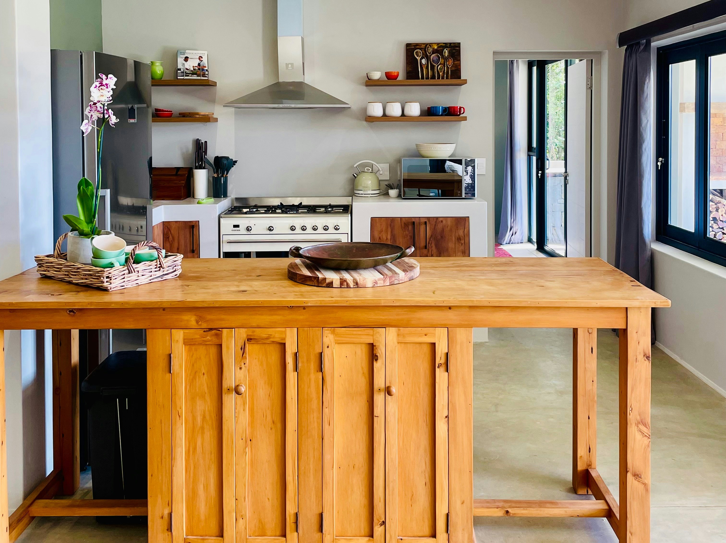 Featuring an open-plan design, the living area has a spacious lounge, kitchen, indoor braai area, and bar counter. The kitchen is equipped with a fridge-freezer, gas stove, oven, and microwave. The lounge has a comfy seating area as well as a TV and opens onto a patio with built-in braai facilities and an outdoor dining space.