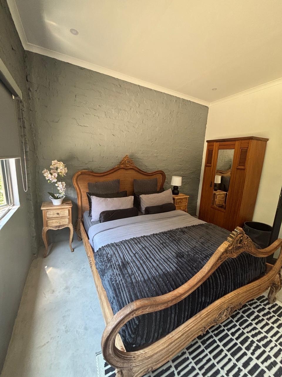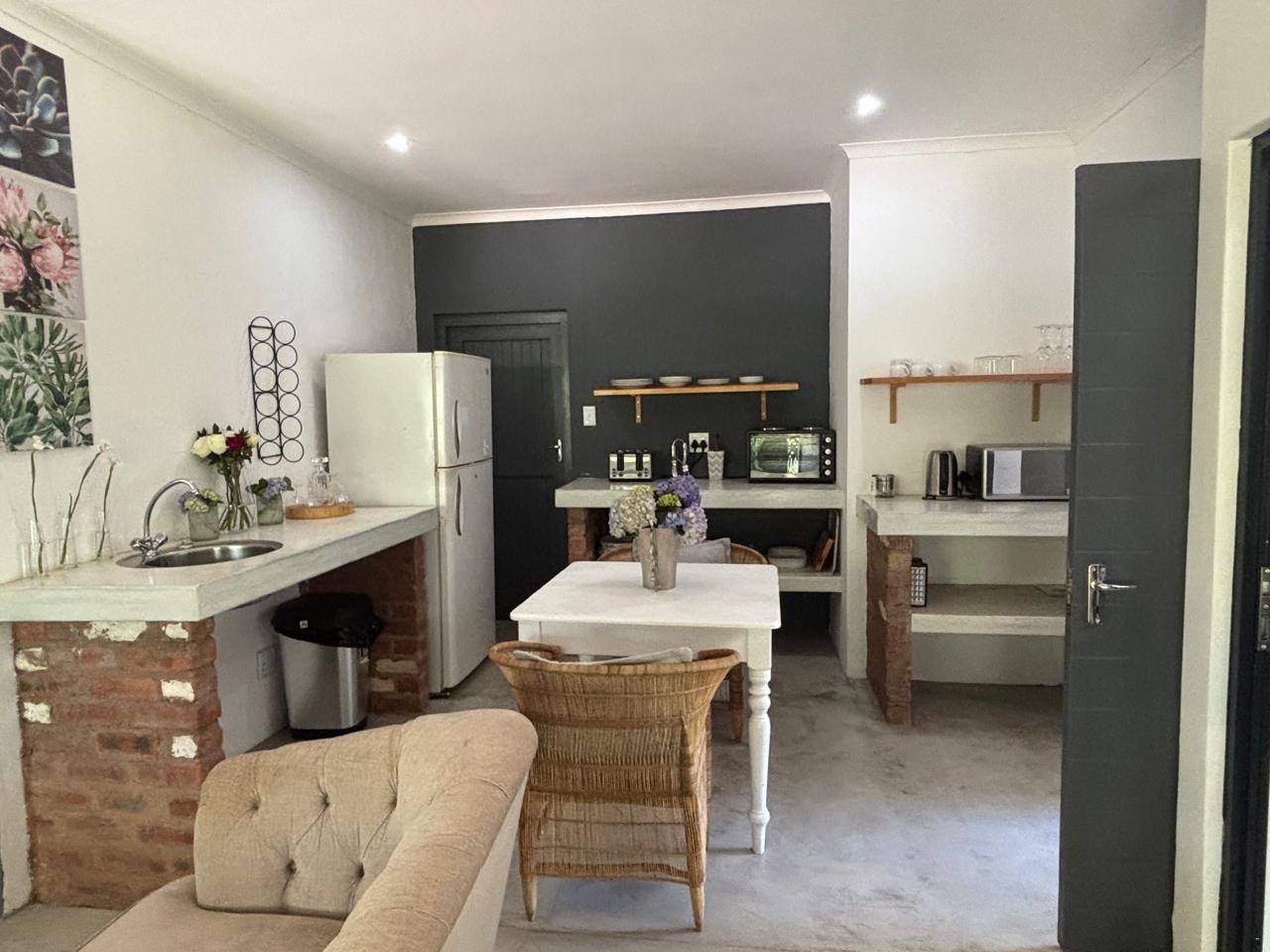 The open-plan living area features a comfortable lounge with a TV with DStv, cosy seating, and a 2-seater dining table. The kitchen is fully equipped with a fridge-freezer, 2-plate stove with mini oven, toaster, kettle, coffee machine, and microwave. A washing machine is also available for added convenience.