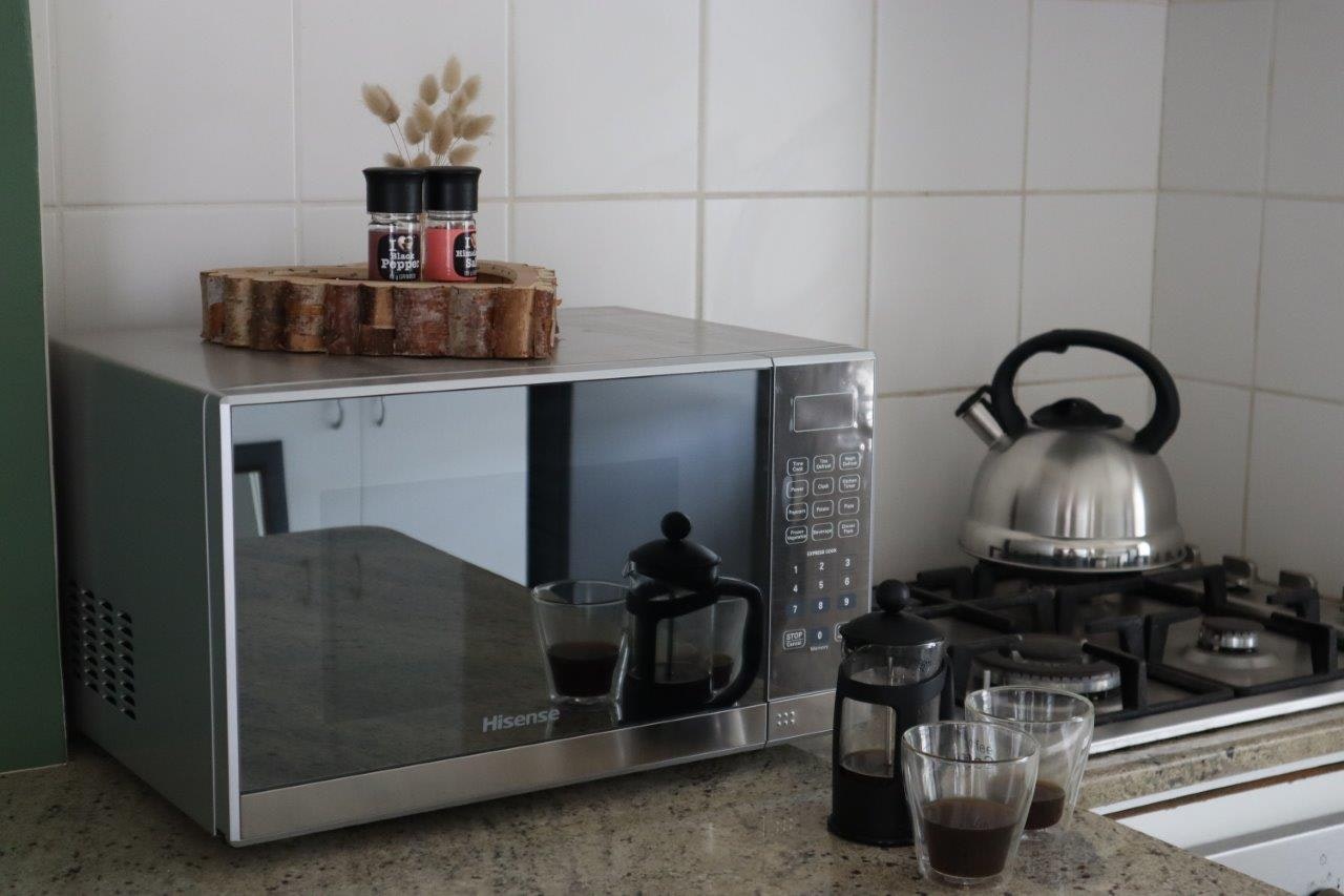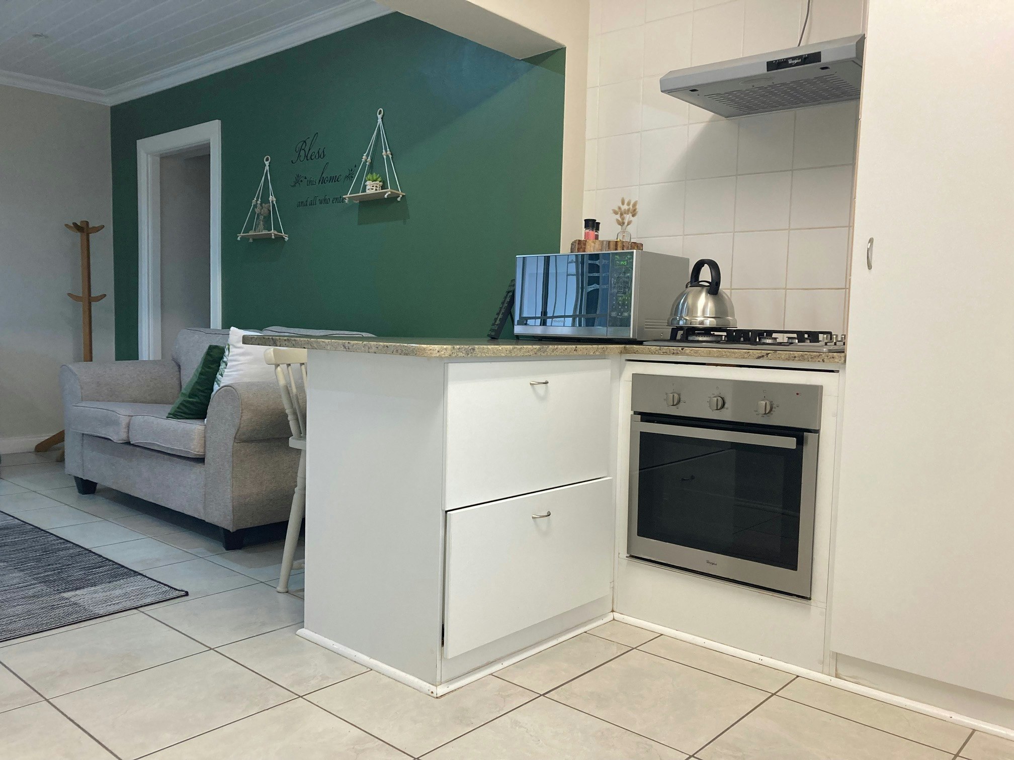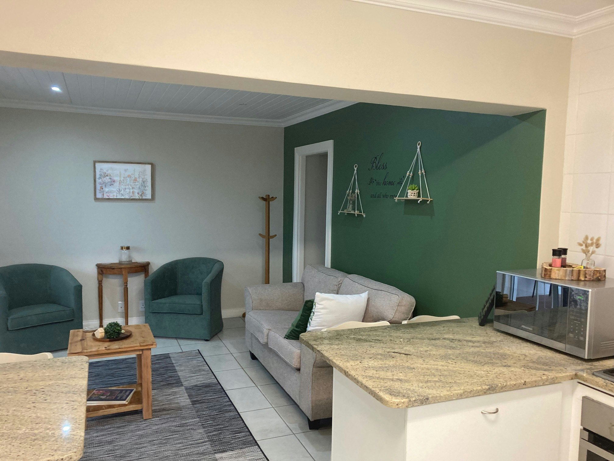The open-plan living area features a lounge and a kitchen. The kitchen is equipped with a stove, oven, microwave, fridge-freezer, tea- and coffee-making facilities and cutlery and crockery. The kitchen also has a breakfast bar with 4 stools. The lounge is furnished with comfortable seating and a coffee table.