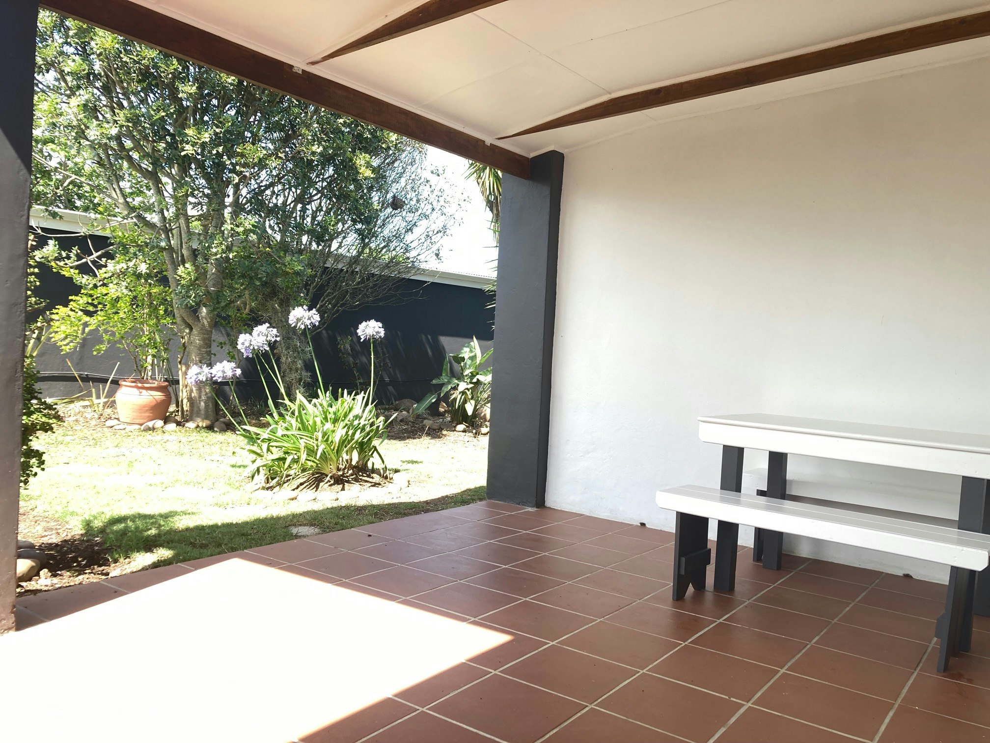 Through the sliding door is a patio that boasts garden views and features a picnic table ideal for dining. Guests can also enjoy a picnic in their private garden or take a dip in the communal swimming pool. Access to secure parking is available.