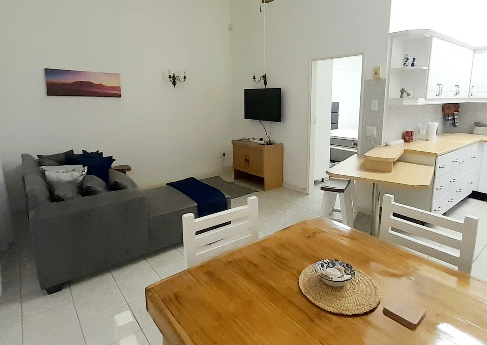 The open-plan living area offers a fully equipped kitchen with a stove, oven, cutlery, crockery, utensils, microwave, kettle, toaster, fridge-freezer, and breakfast counter that flows to the dining area furnished with a dining table for 4 guests and the lounge is furnished with comfortable seating, a TV with Netflix and Wi-Fi for your entertainment.