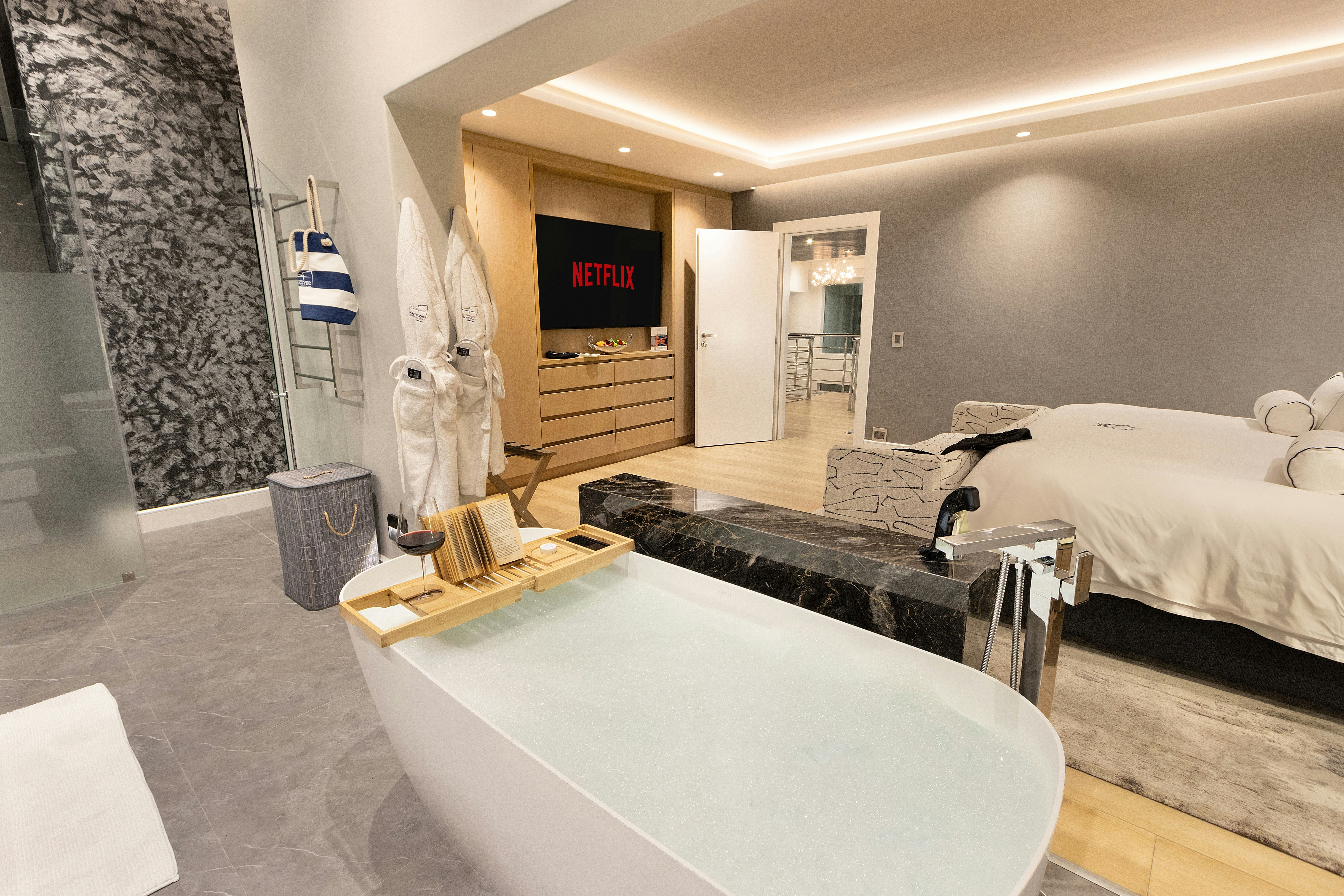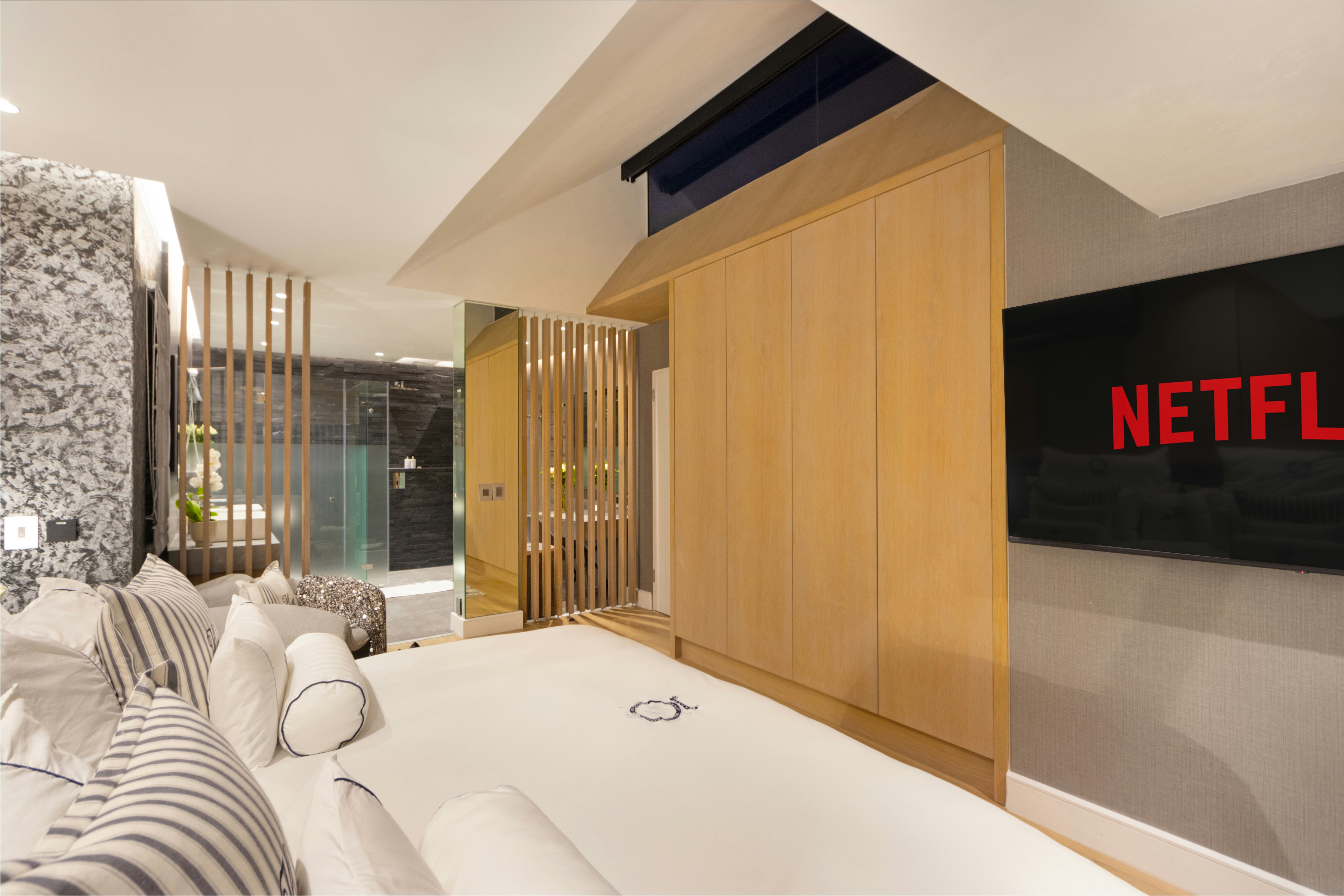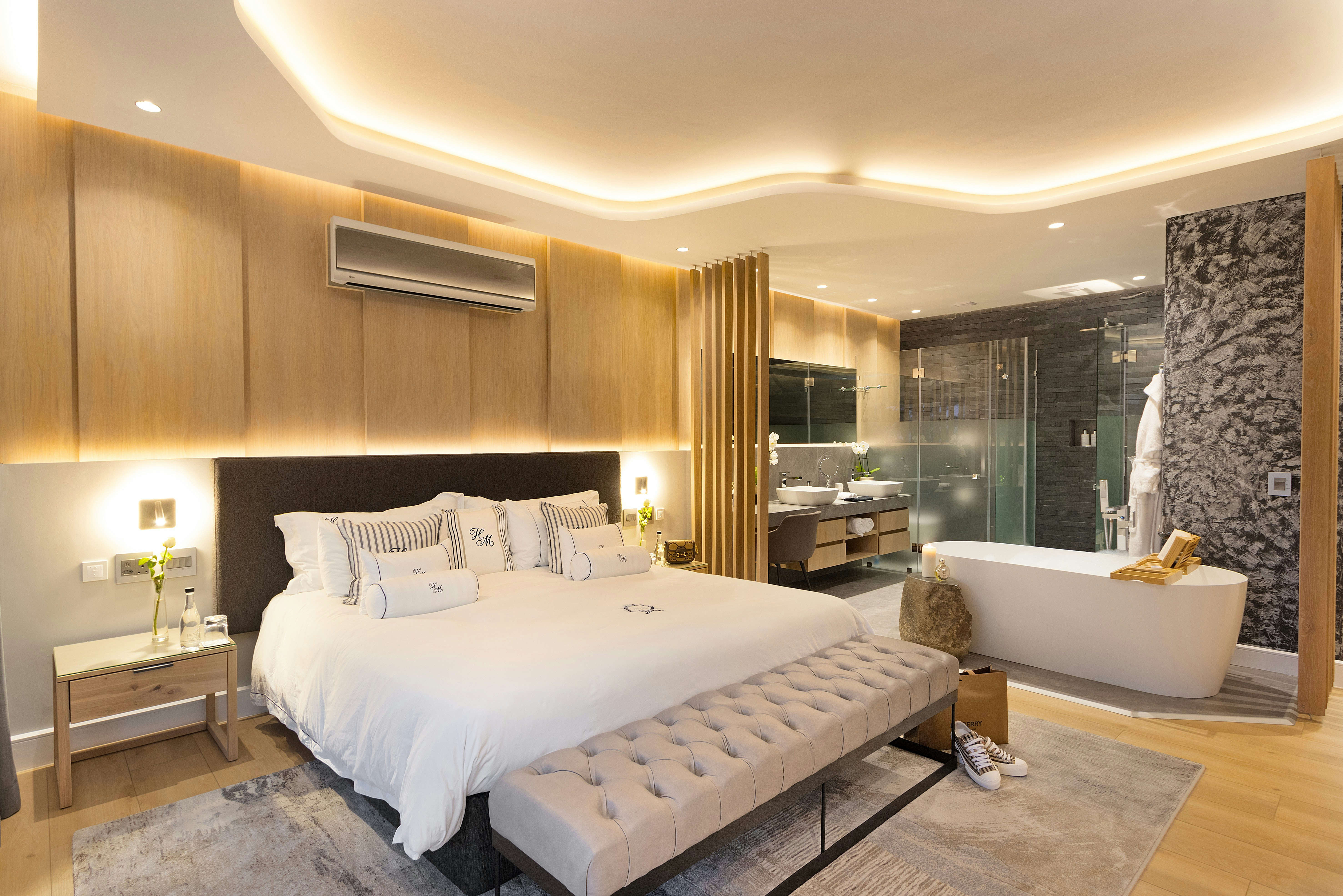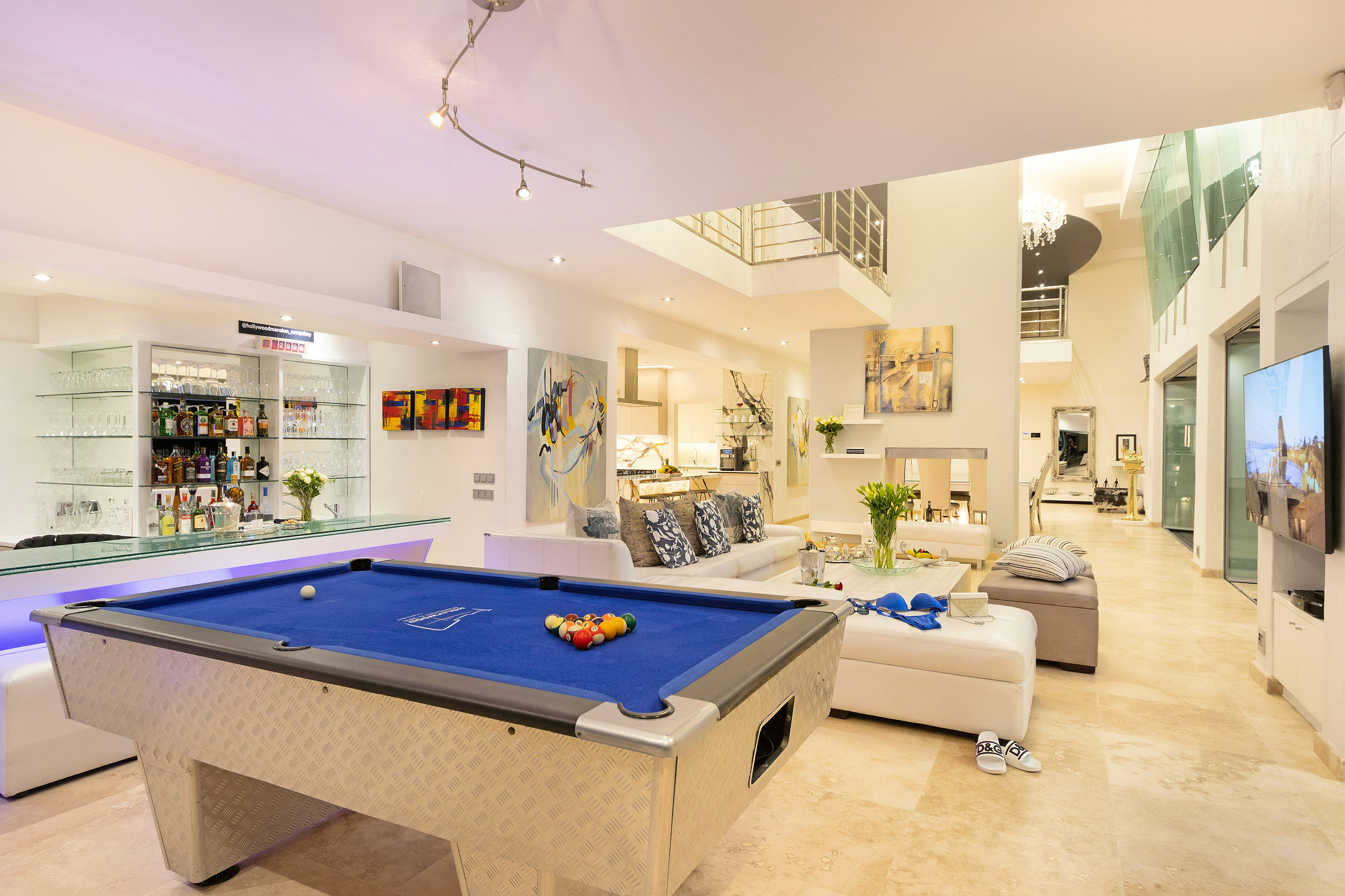 There are 6 air-conditioned, en-suite bedrooms. Each room has a king bed and an en-suite bath and shower, except for 2 of the bathrooms which have a shower only. The main bedroom has a bidet as well. Other features include a fully equipped kitchen with stainless steel work surfaces and top of the range appliances, a double volume formal living room, 2 fireplaces, a walk-in cold room, a bar, wine cellar, pool table, gym, and home theatre. The outdoor area is a perfect entertaining spot with a braai and a sizeable heated infinity swimming pool. There are 8 balconies, 2 lock-up garages, and an emphasis on security with a 360 degree CCTV and alarm.