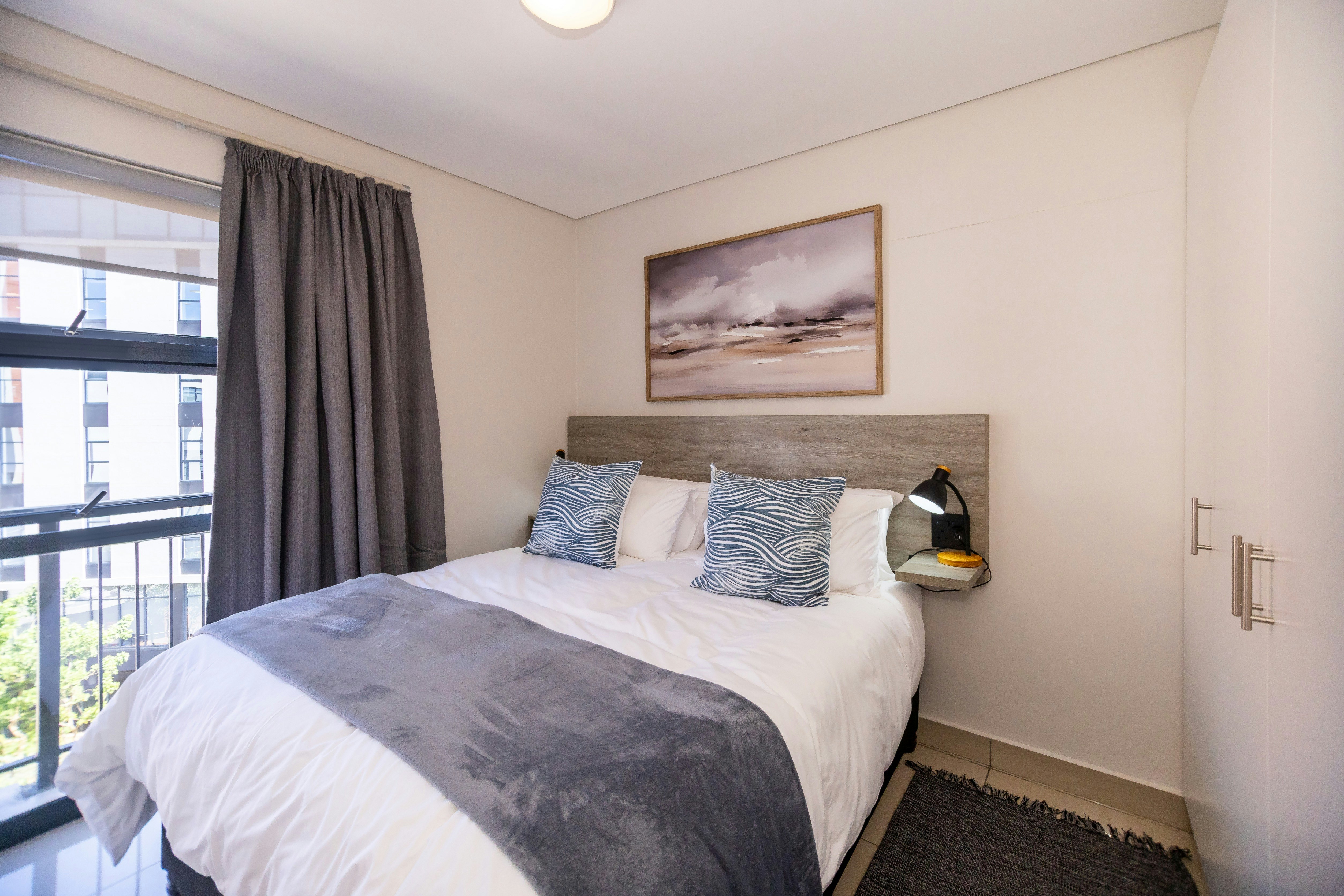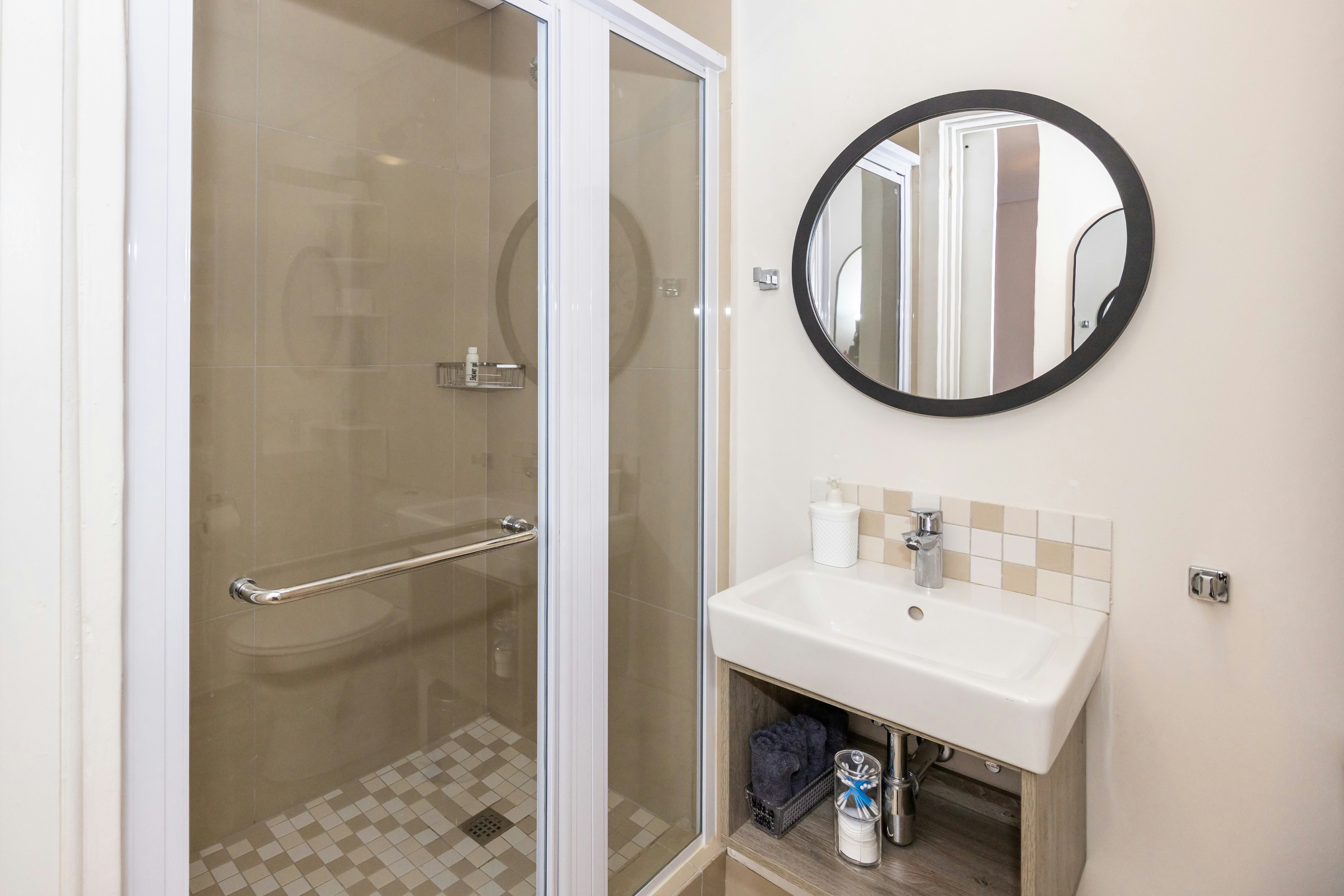 The apartment comprises of 2 bedrooms; the main bedroom is furnished with a queen-size bed, and the second bedroom is furnished with 2 single beds. The shared bathroom is fitted with a shower, toilet, and basin.